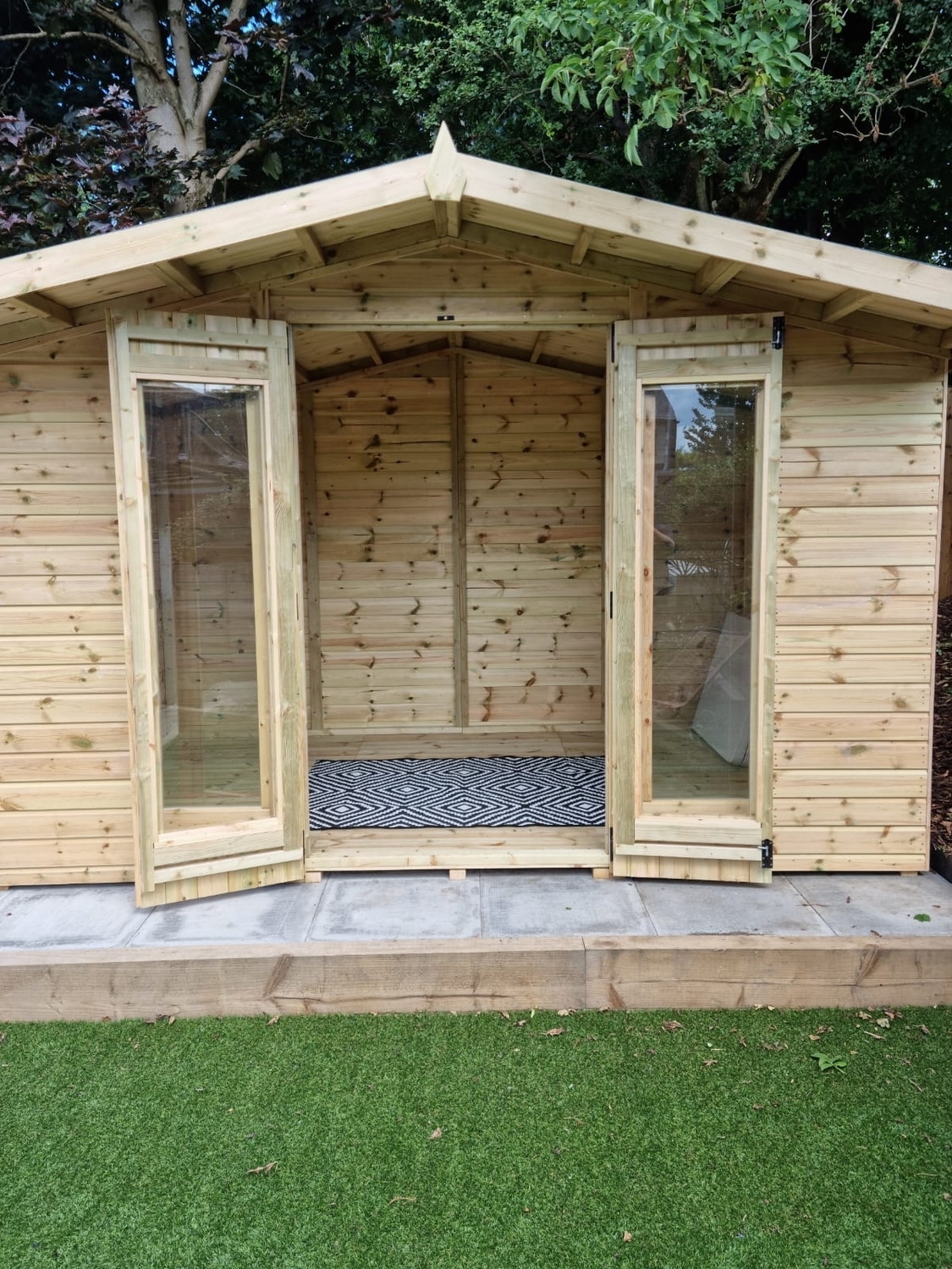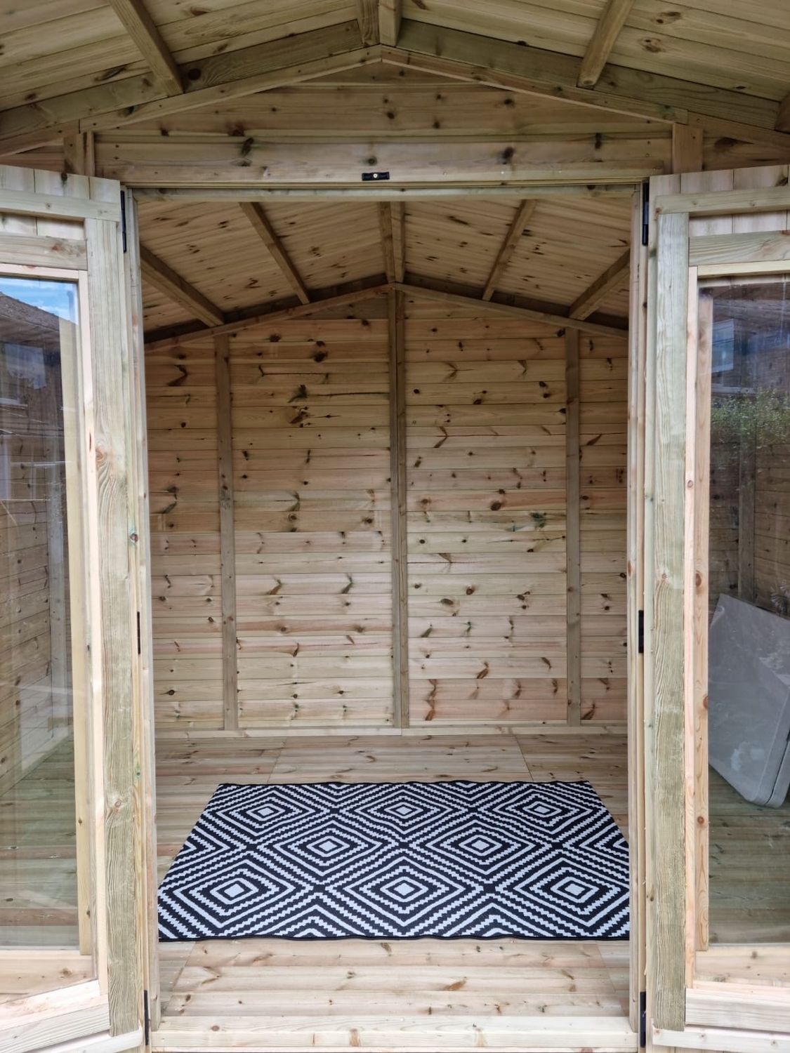 The summerhouse is 12ft wide at the front where the doors are and 8ft deep.