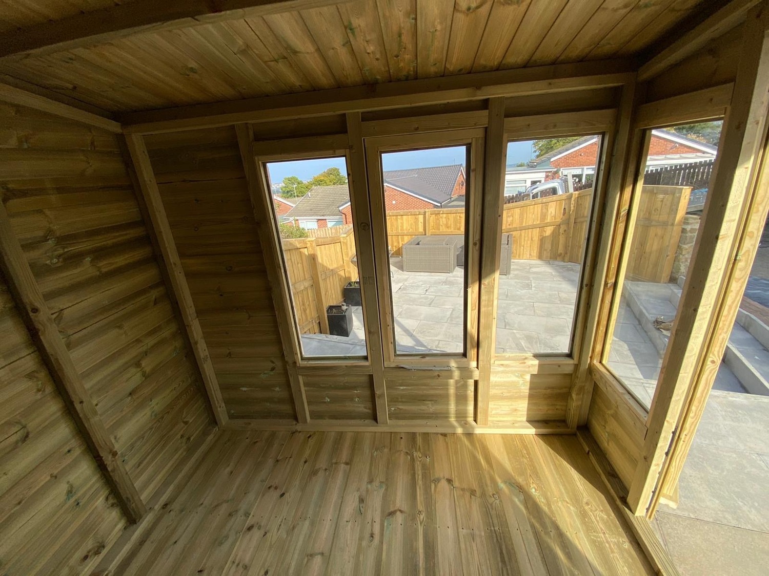 The summerhouse is 18ft wide at the front where the doors are and 8ft deep.