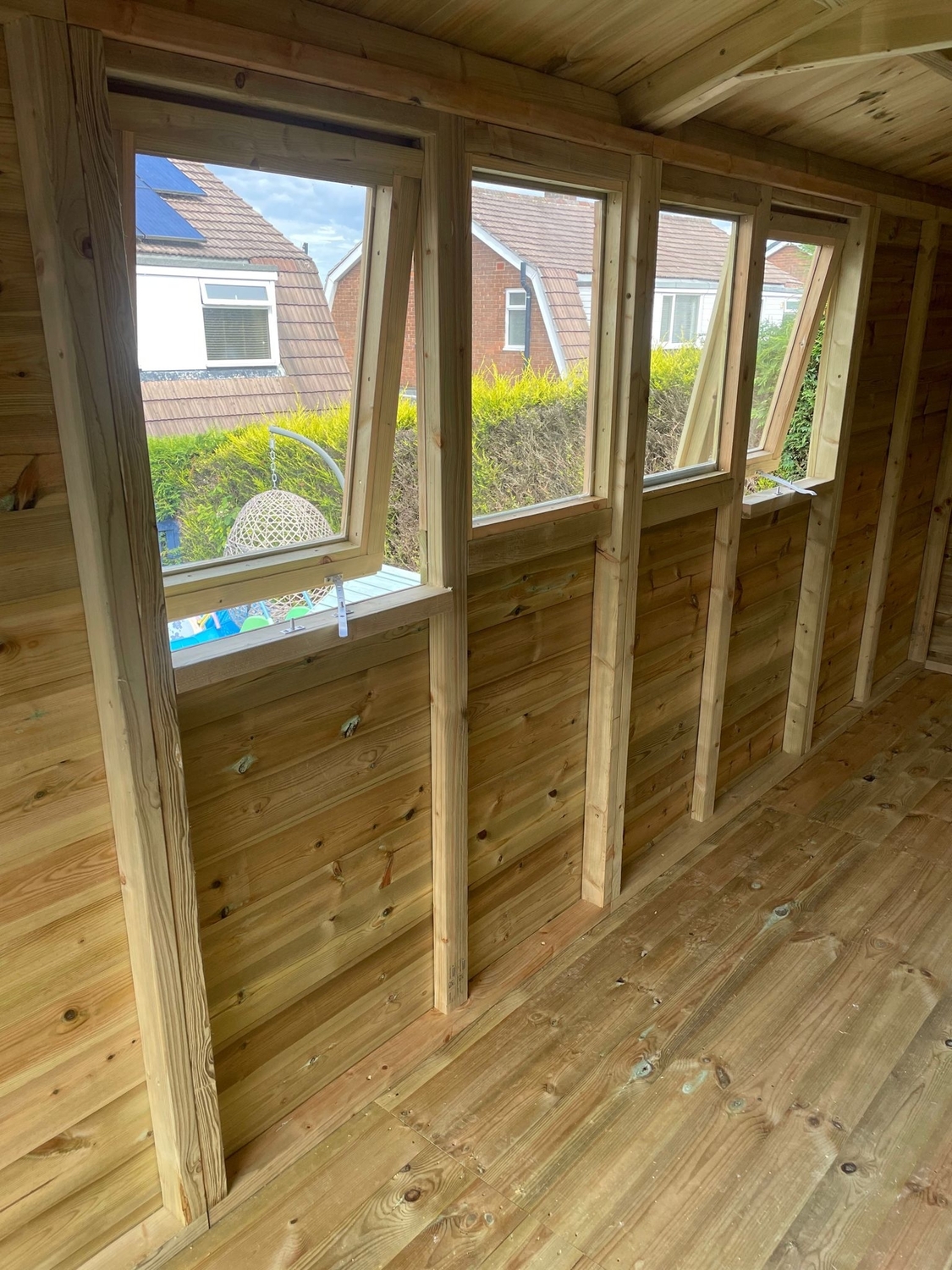 The summerhouse has 4ft wide 6ft high double door, 2 long windows & 4 standard windows, 2 of which are opening.