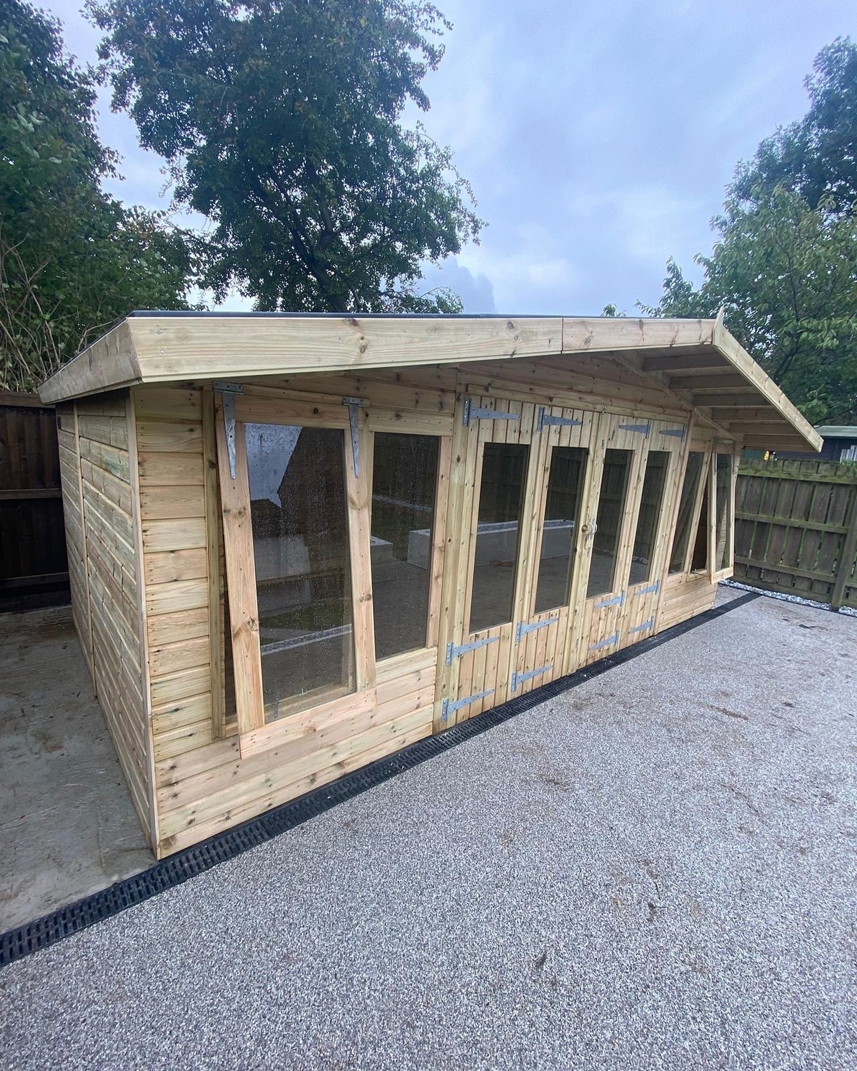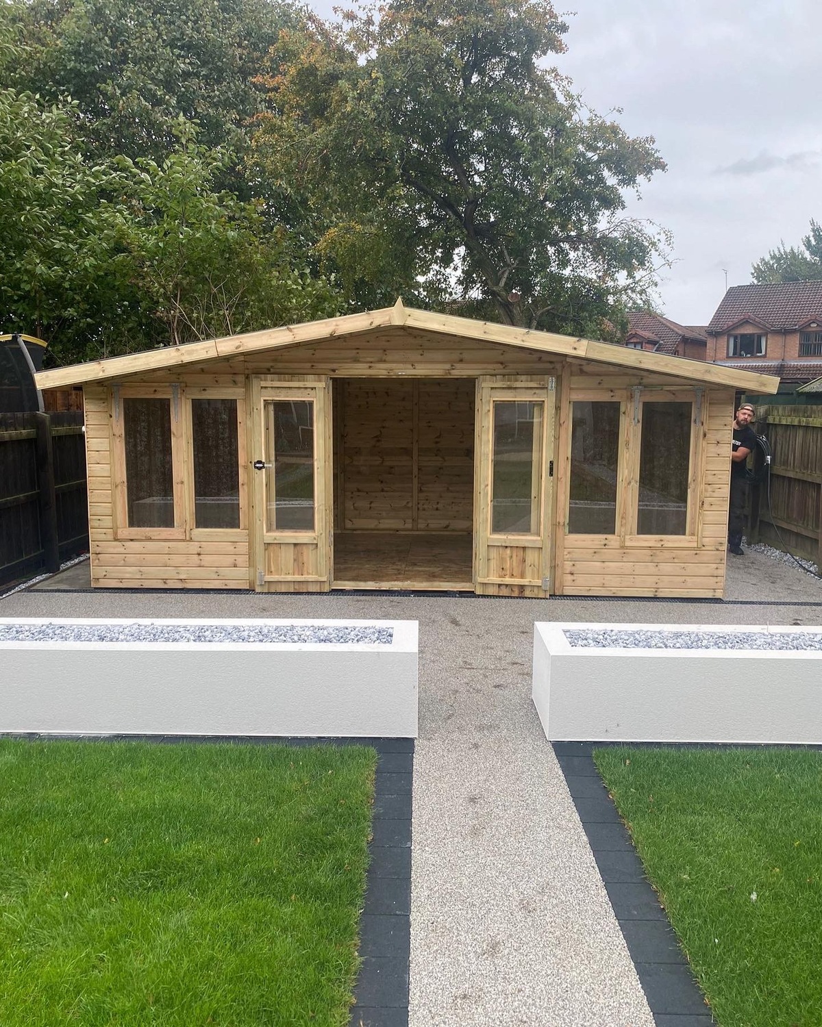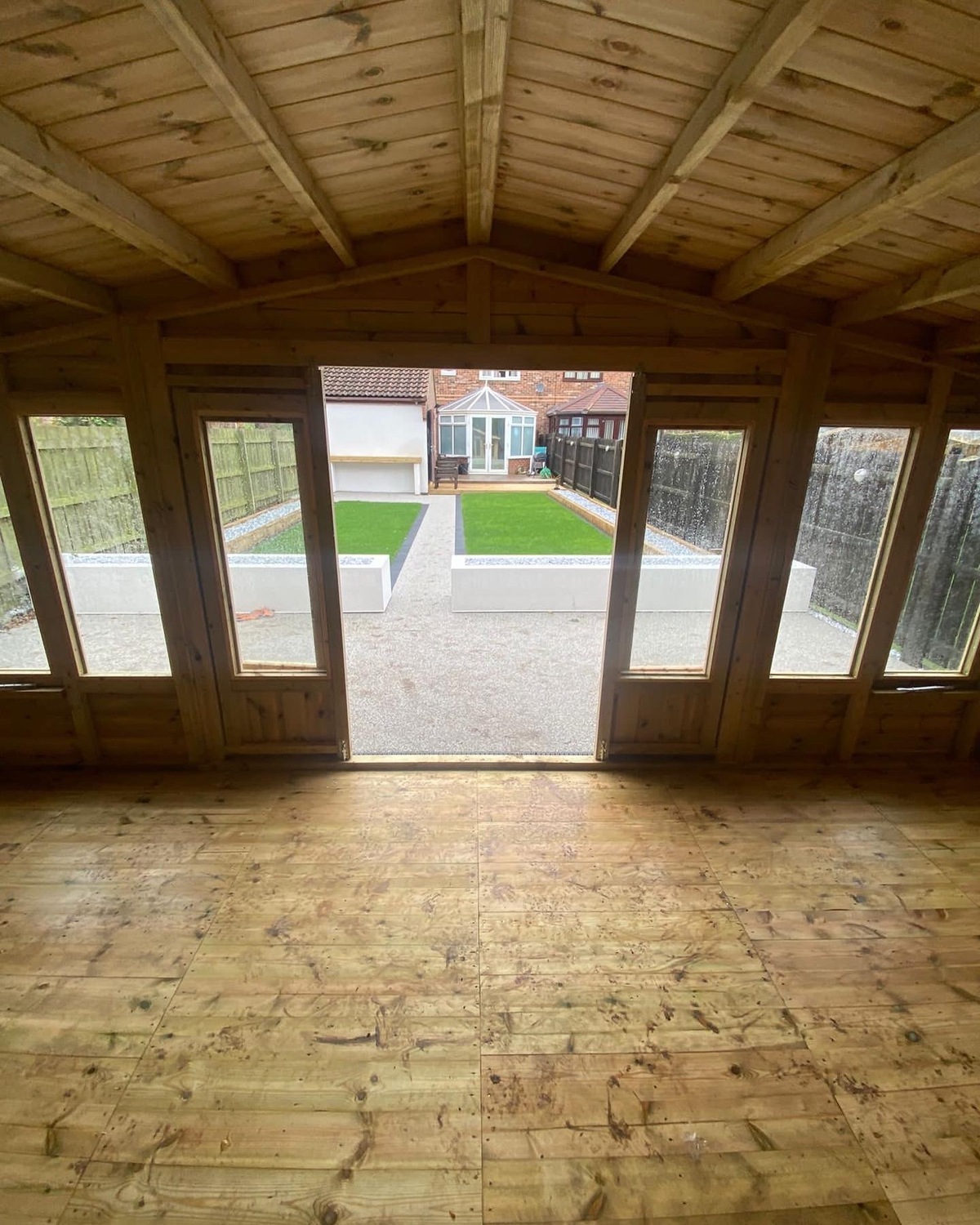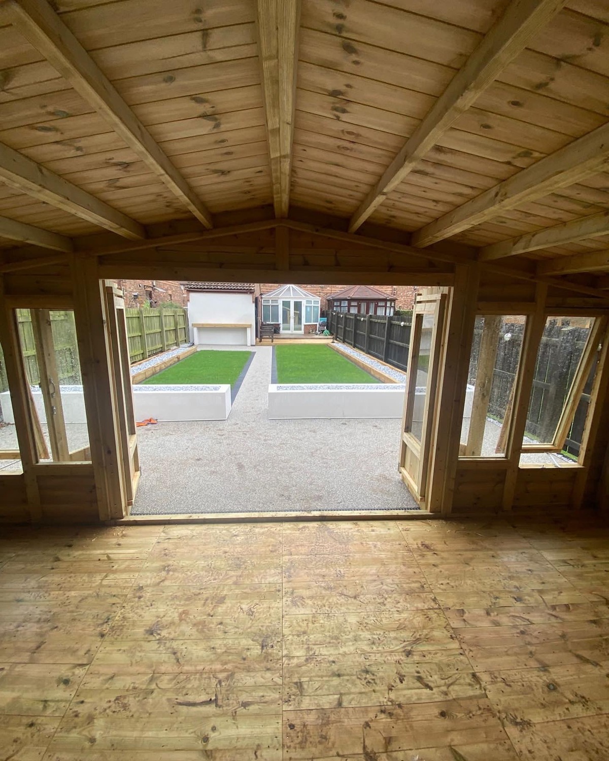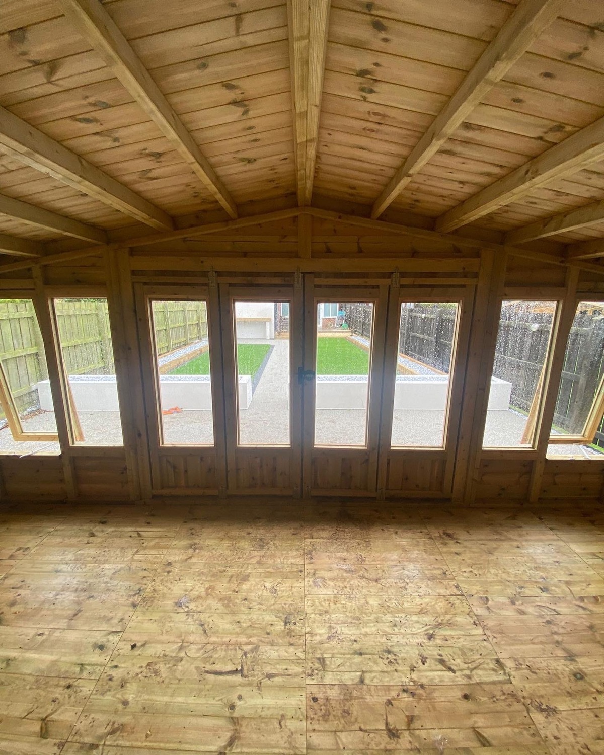 The summerhouse is 18ft wide at the front where the doors are and 10ft deep.