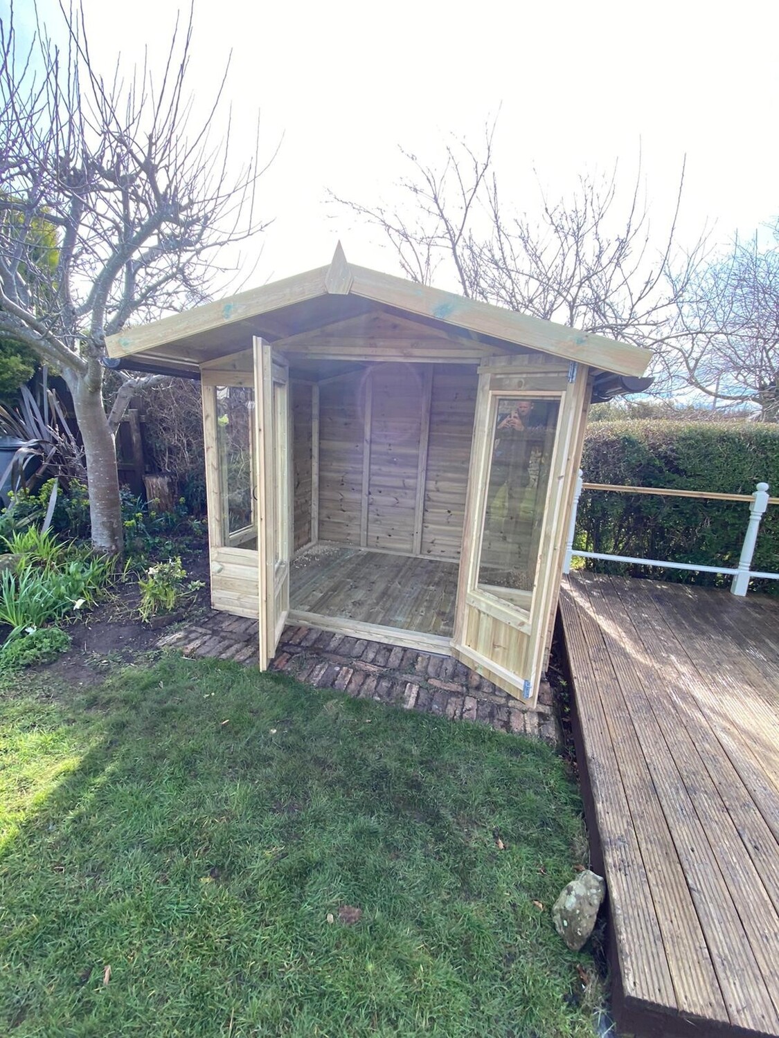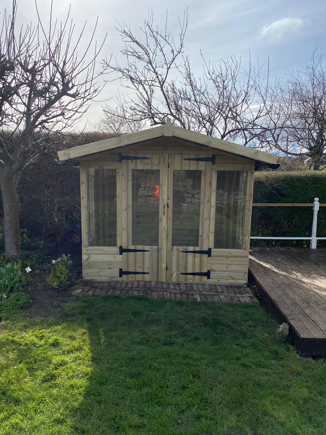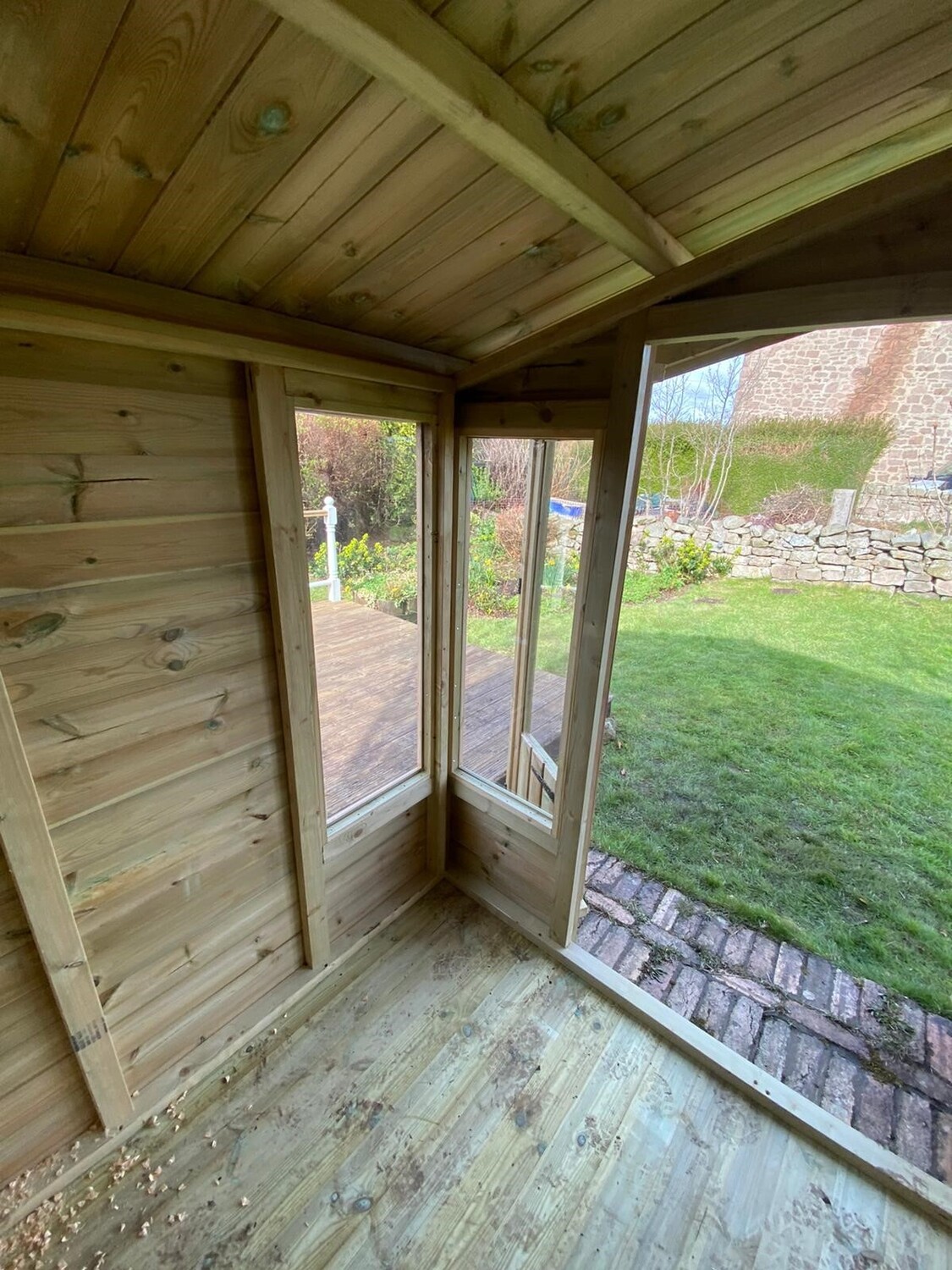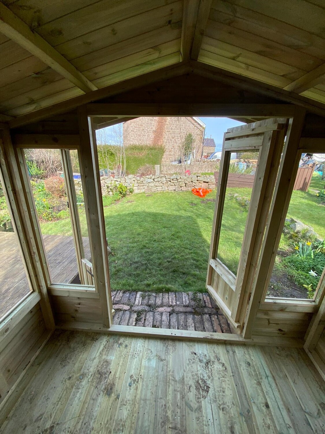 The summerhouse has 4ft wide 6ft high double door and 6 long windows.