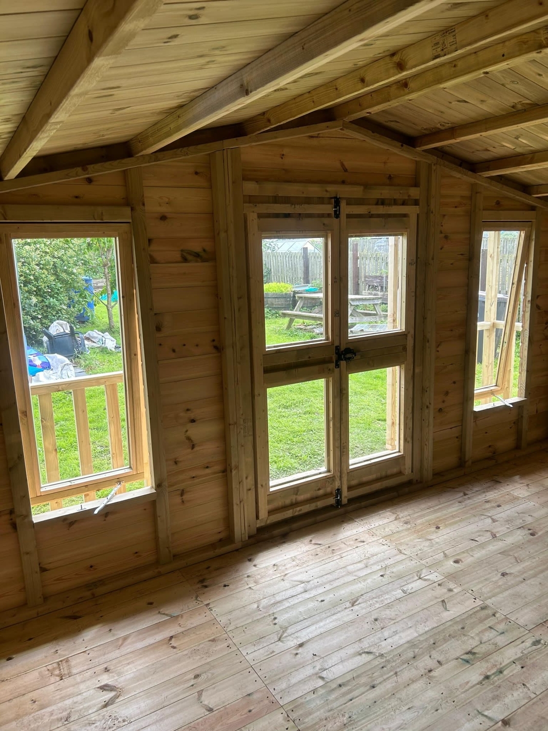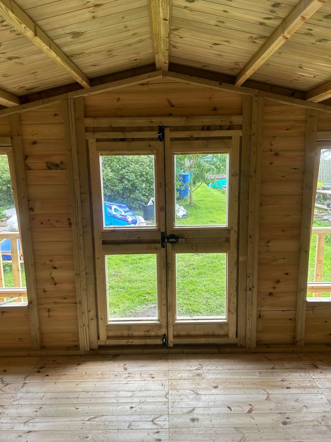 The summerhouse has 4ft wide 6ft high double door, 4 standard windows and 2 long opening windows.