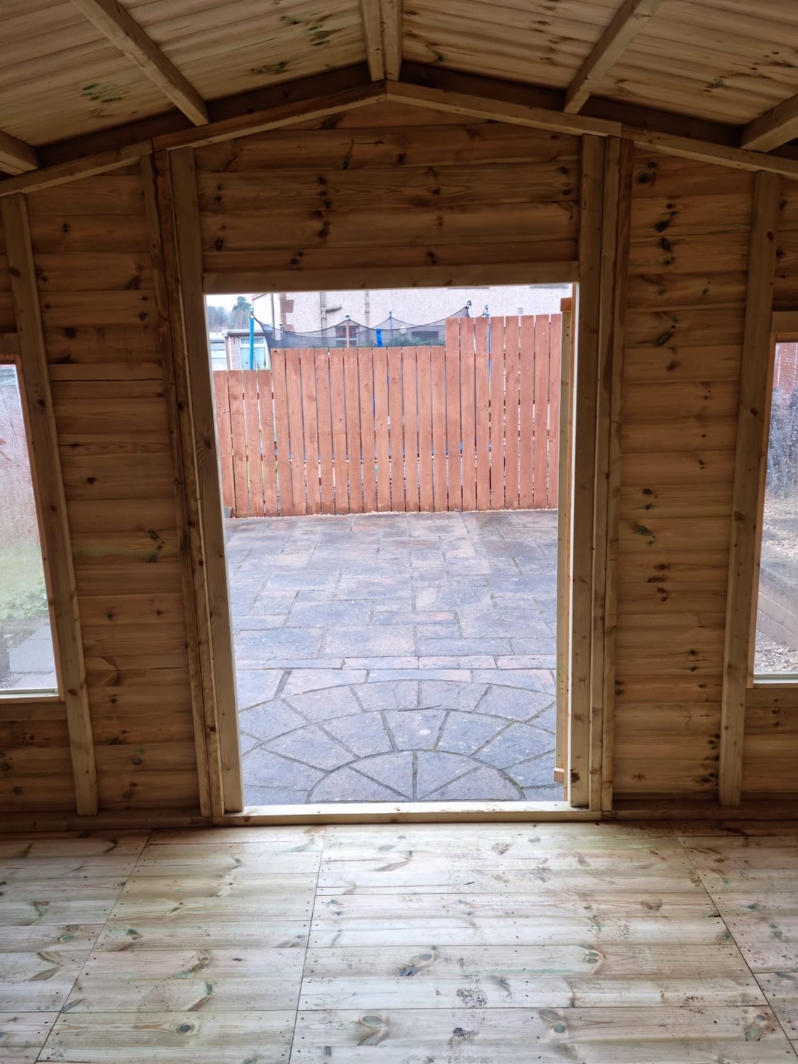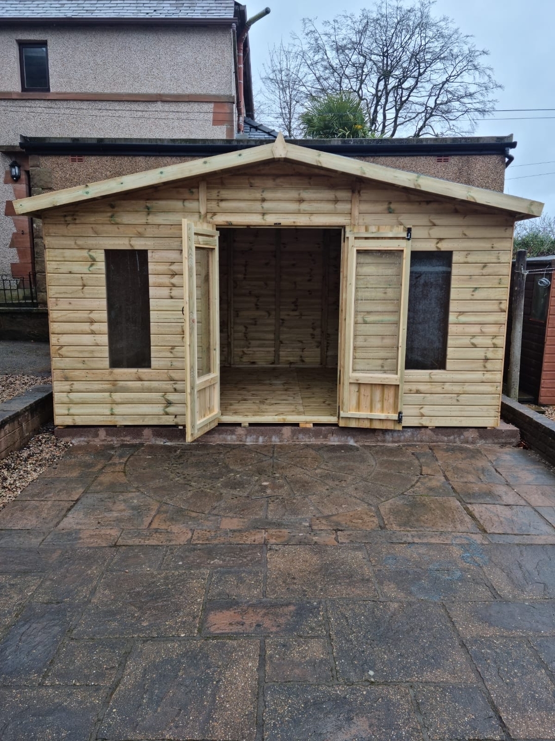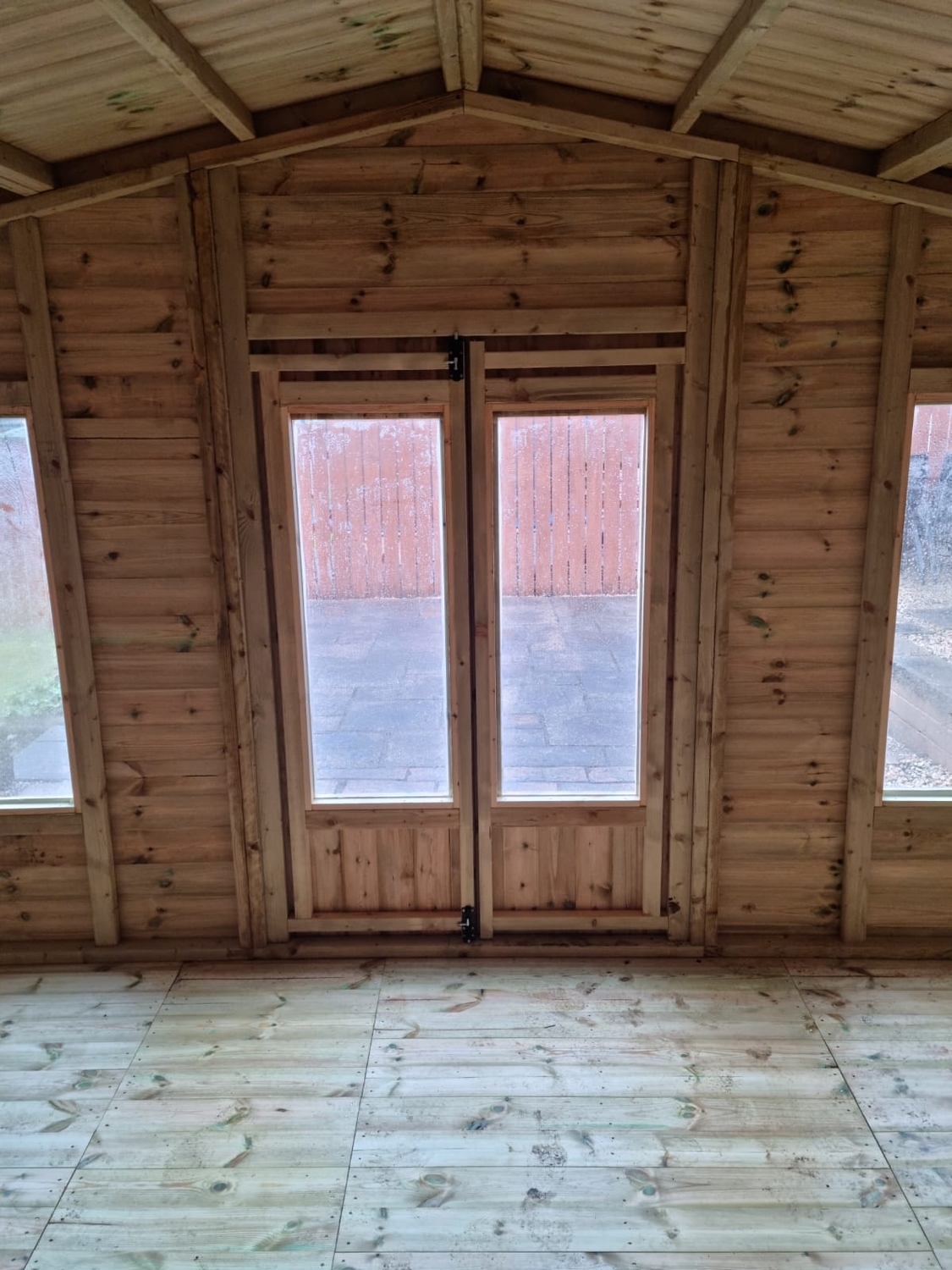 The summerhouse has 4ft wide 6ft high double door and 4 long windows.