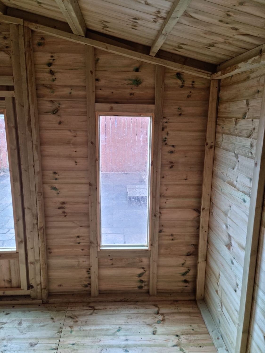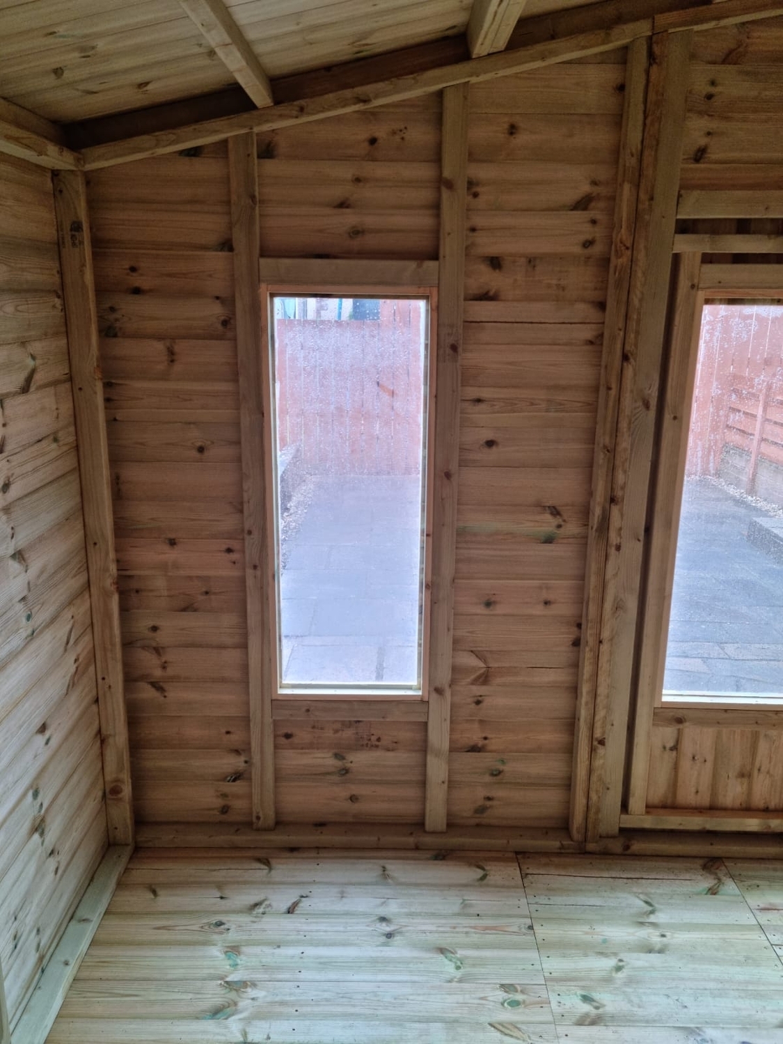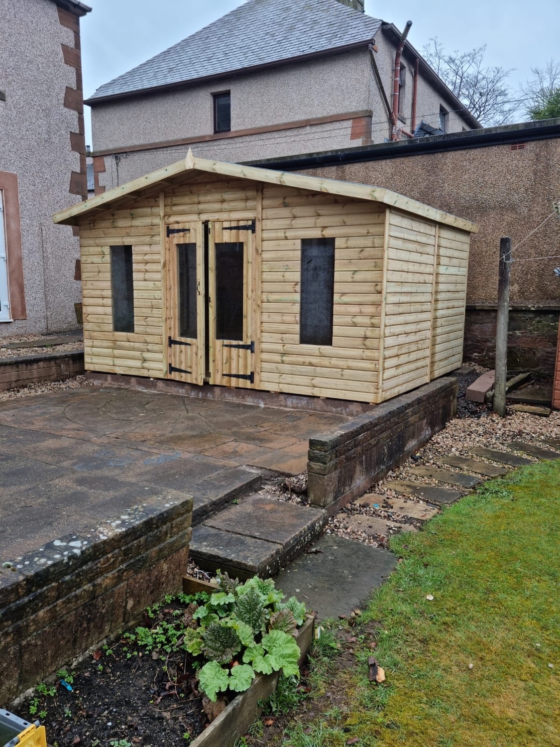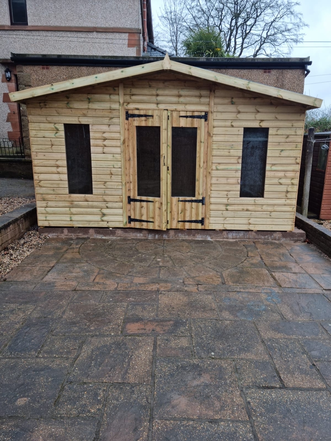The summerhouse has 4ft wide 6ft high double door and 4 long windows.