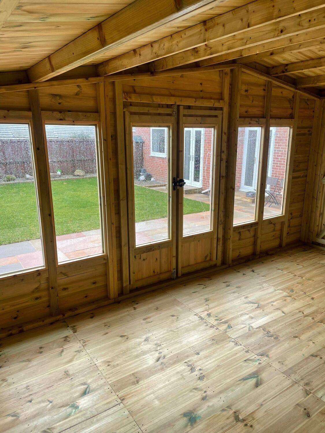 The summerhouse has a 4ft wide 6ft high double door and an internal partition with a 2ft 6" wide 6ft high single door to make a separate shed area. It has long windows, and 2 standard windows.