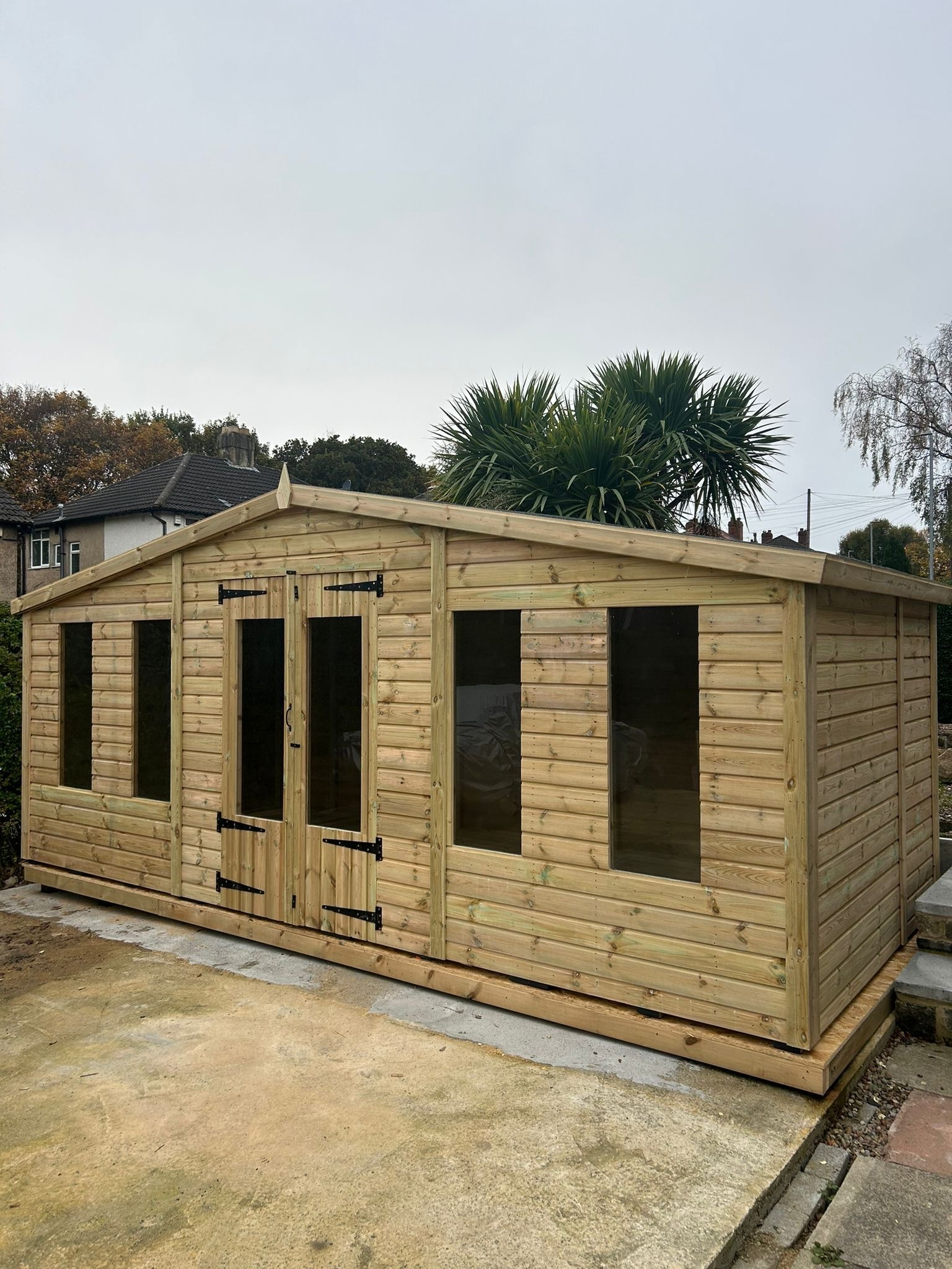 The summerhouse has a 4ft wide 6ft high double door and 6 long windows.