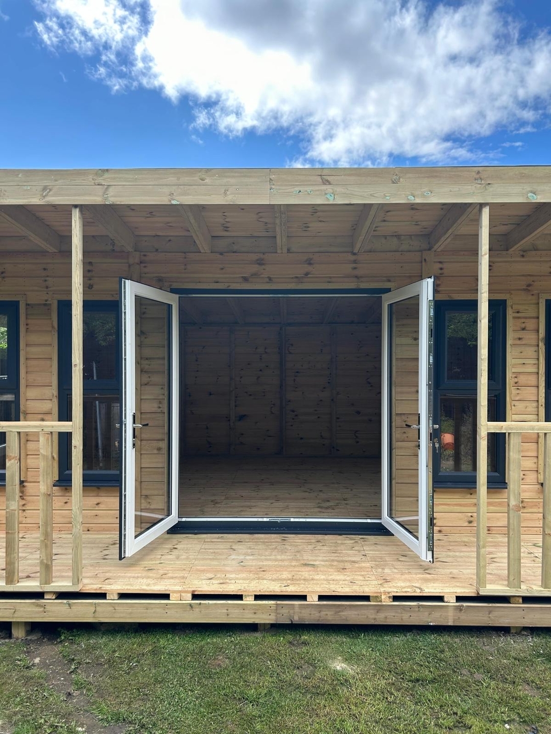 The summerhouse has a 1980 x 1600 wide pvc double glazed door and x8 600 x 1500 opening pvc double glazed windows (50/50 split opening).