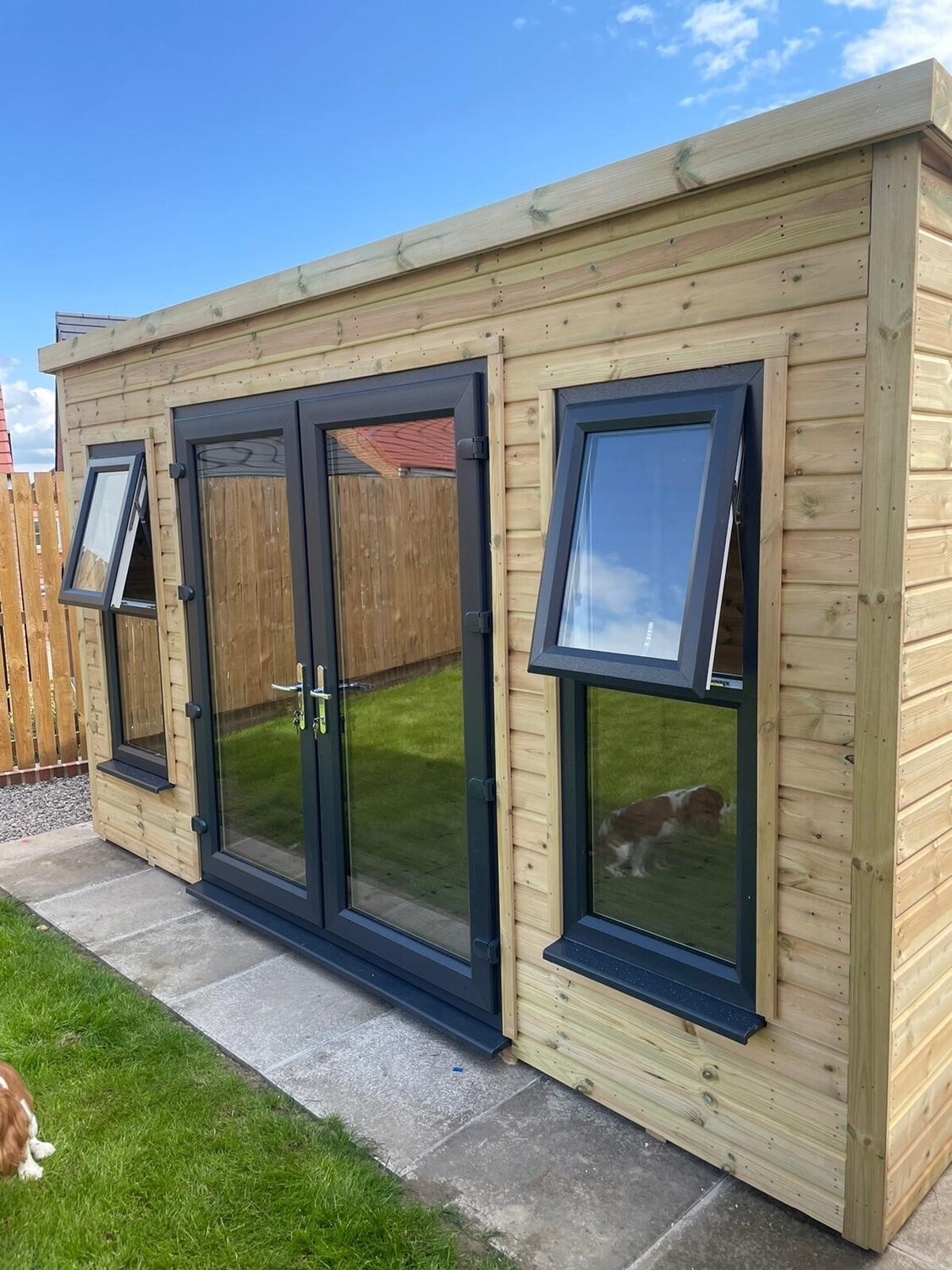The summerhouse has a 1980 x 1600 wide pvc double glazed door and x2 600 x 1500 opening pvc double glazed windows (50/50 split opening)