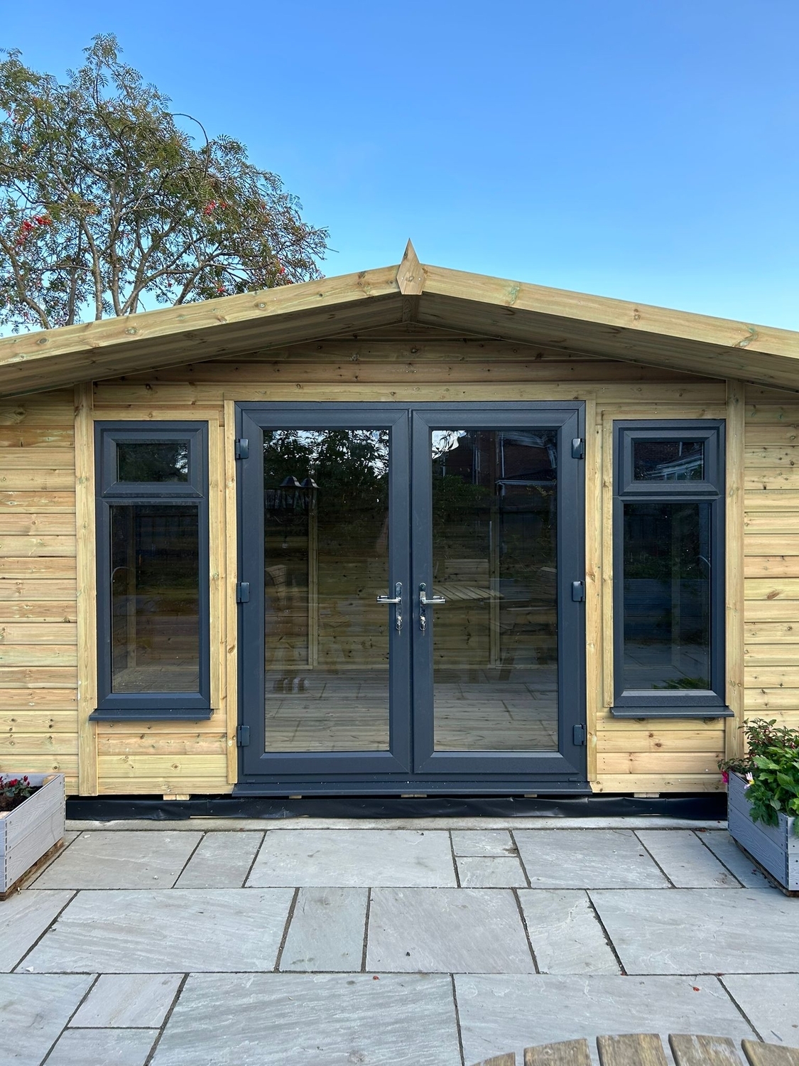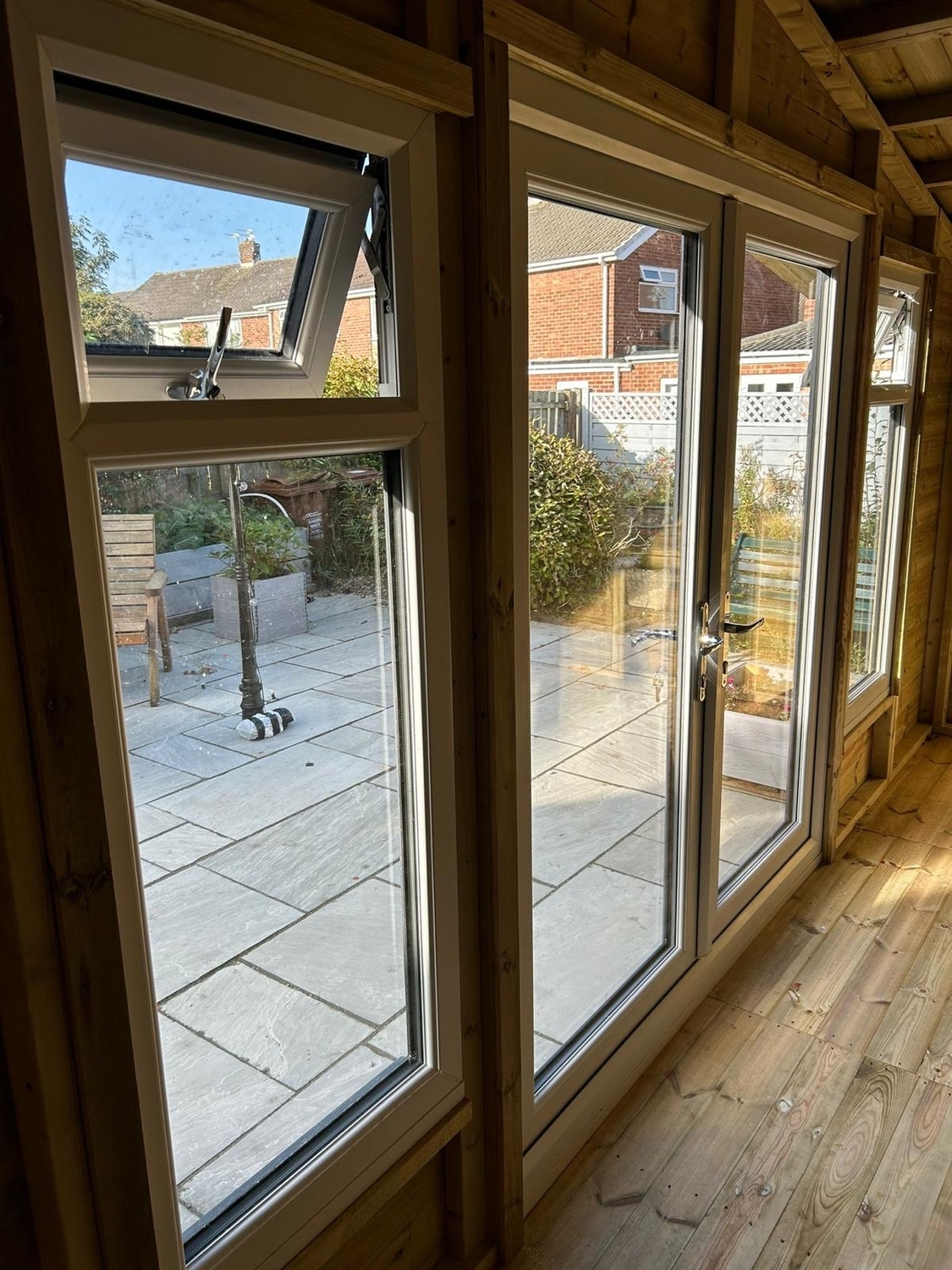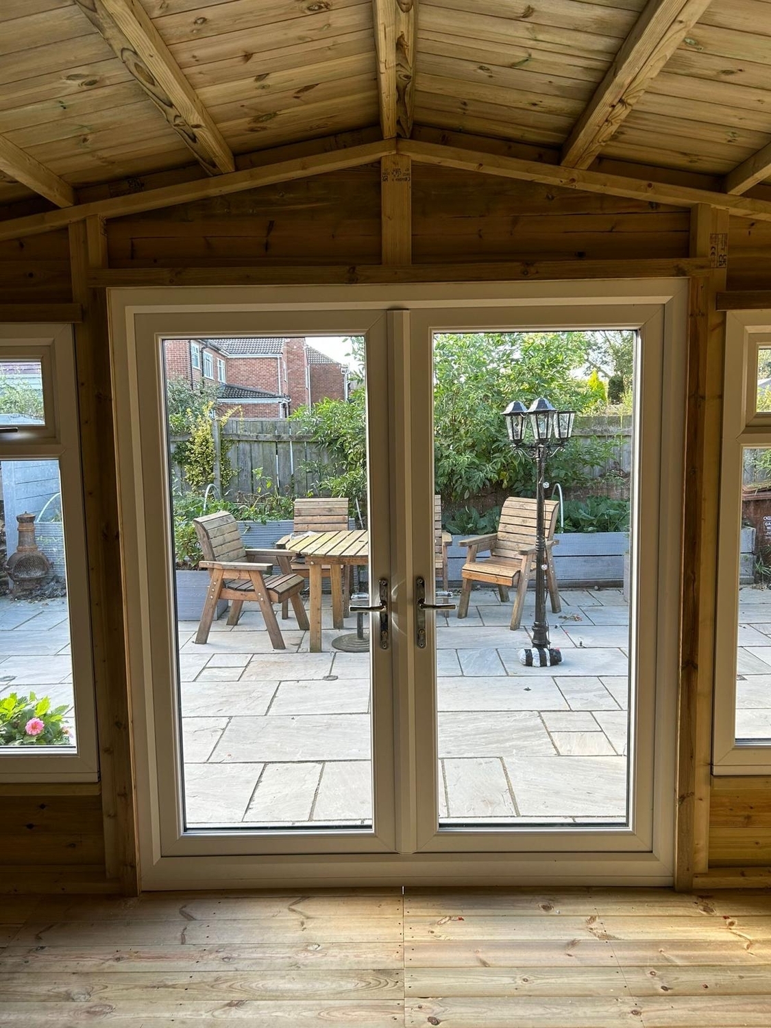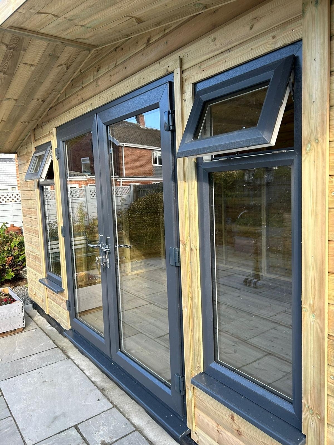 The summerhouse has a 1980 x 1600 wide pvc double glazed door and x2 600 x 1500 opening pvc double glazed windows.