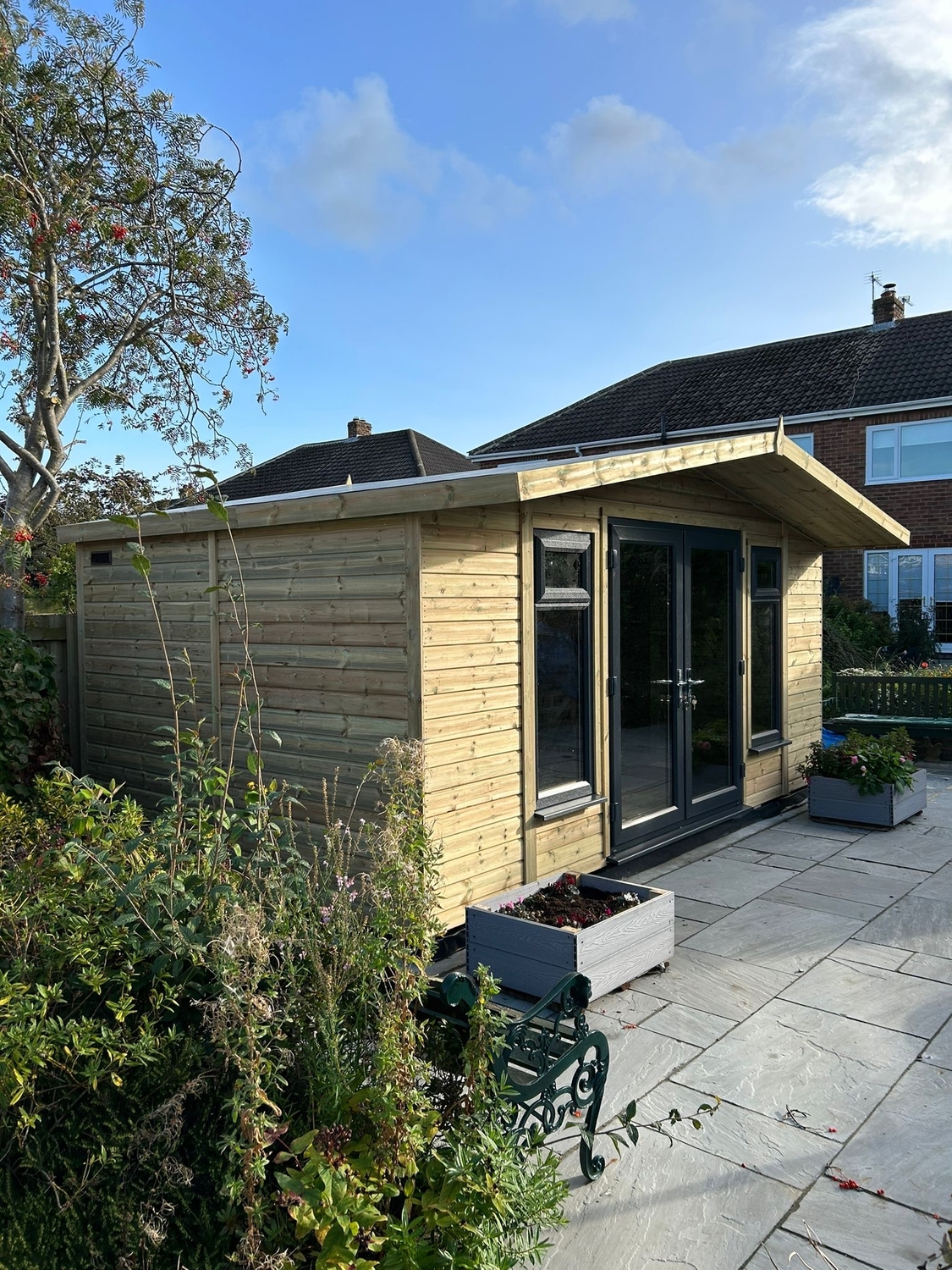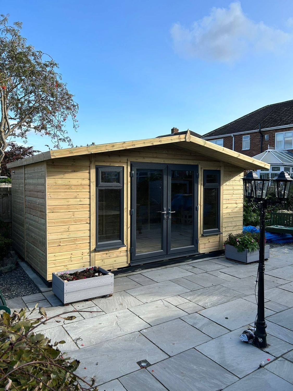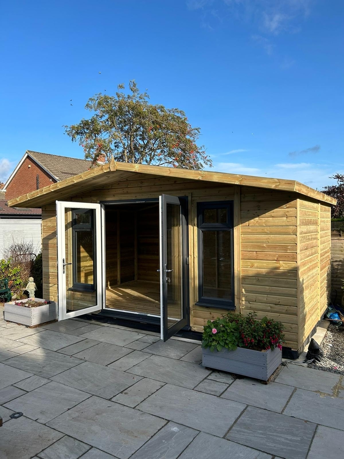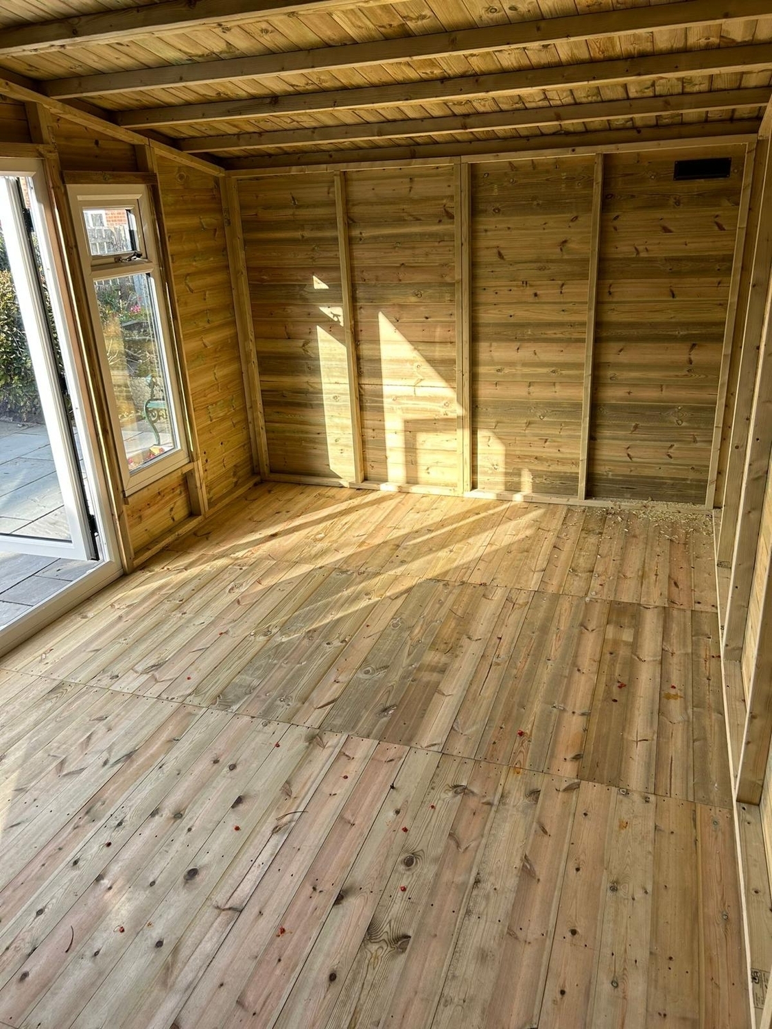 The summerhouse has a 1980 x 1600 wide pvc double glazed door and x2 600 x 1500 opening pvc double glazed windows.