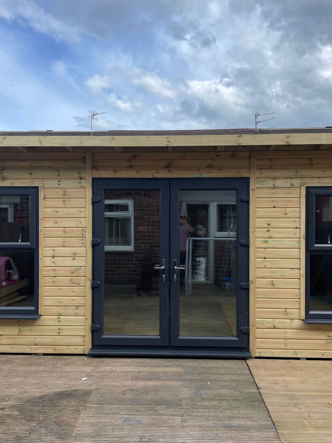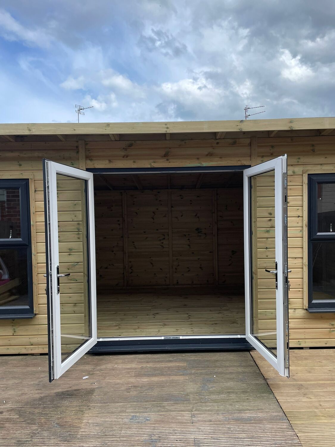 The summerhouse has a 1980 x 1600 wide pvc double glazed door and x2 600 x 1500 opening pvc double glazed windows.