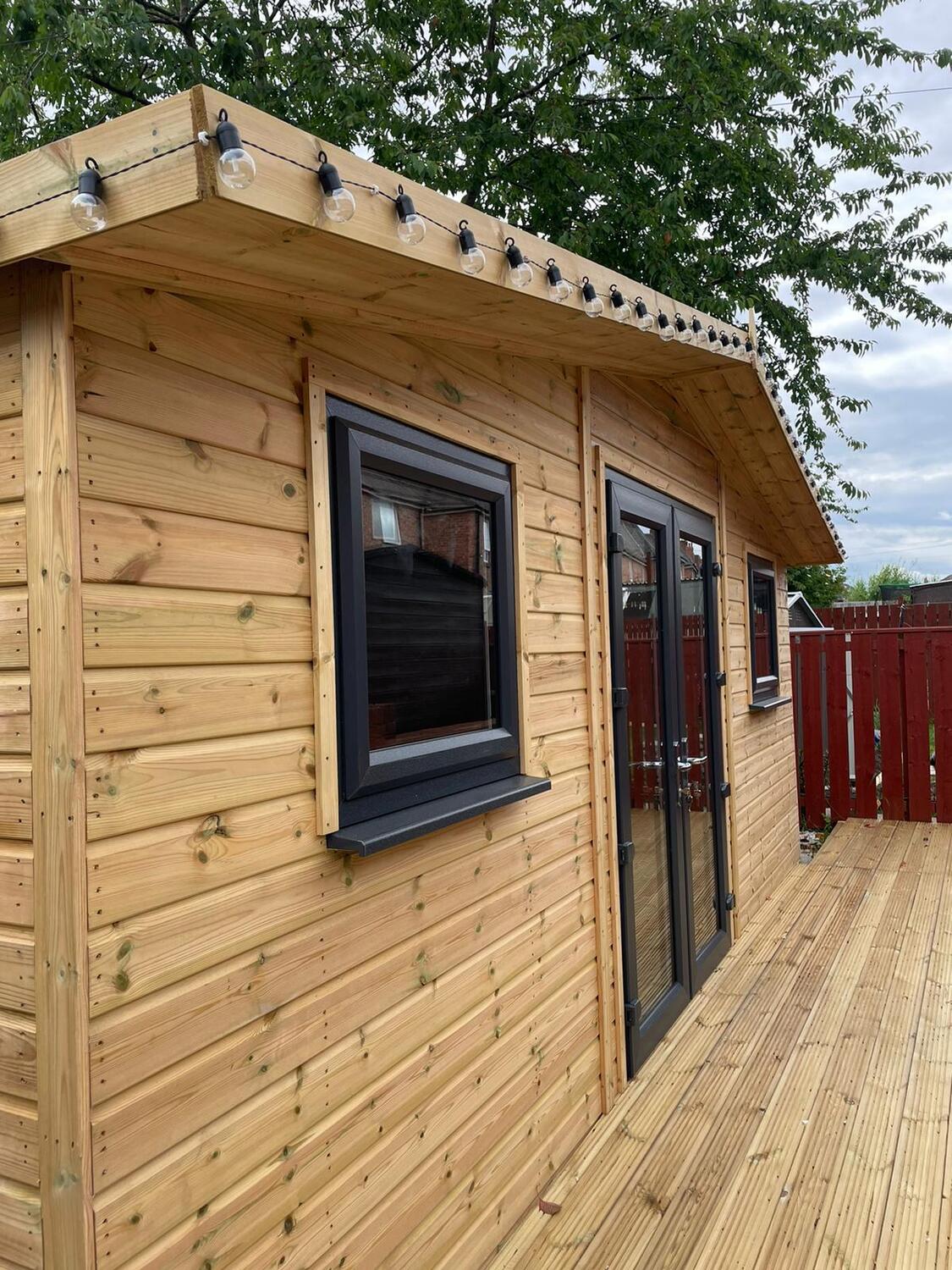 The summerhouse has a 1980 x 1600 wide pvc double glazed door and x2 820mm x 820mm opening pvc double glazed windows.