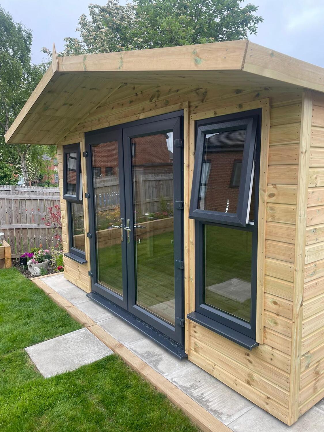The summerhouse has a 1980 high x 1600 wide pvc double glazed door and x2 600 x 1500 opening pvc double glazed windows.