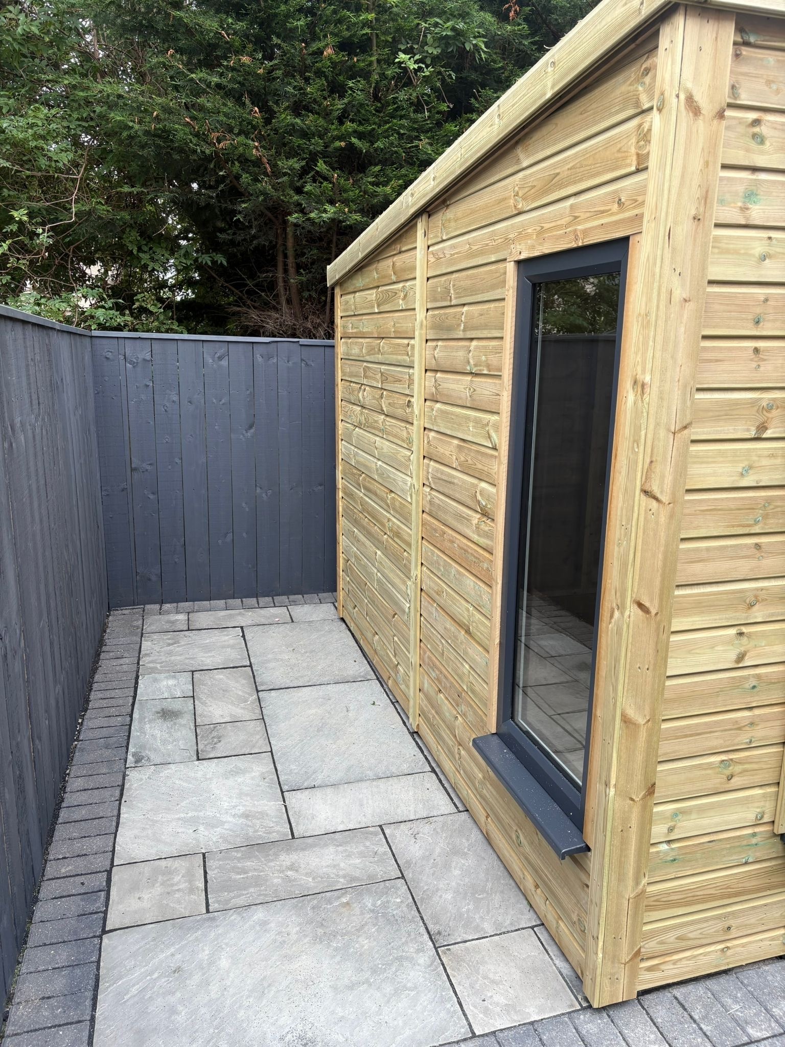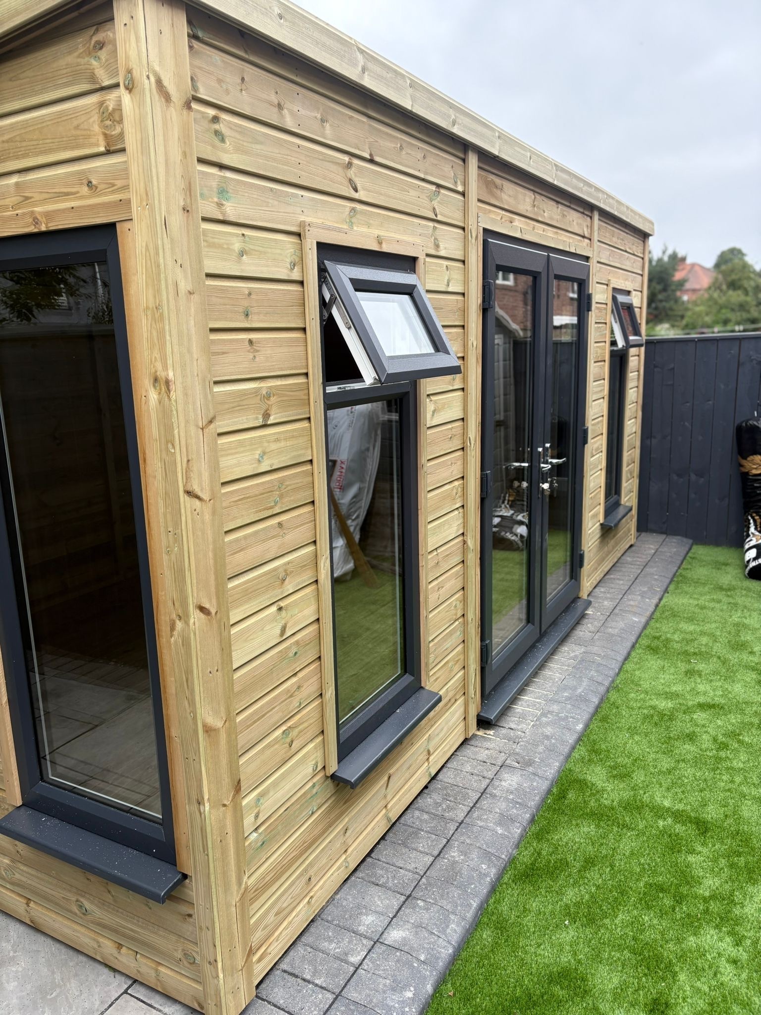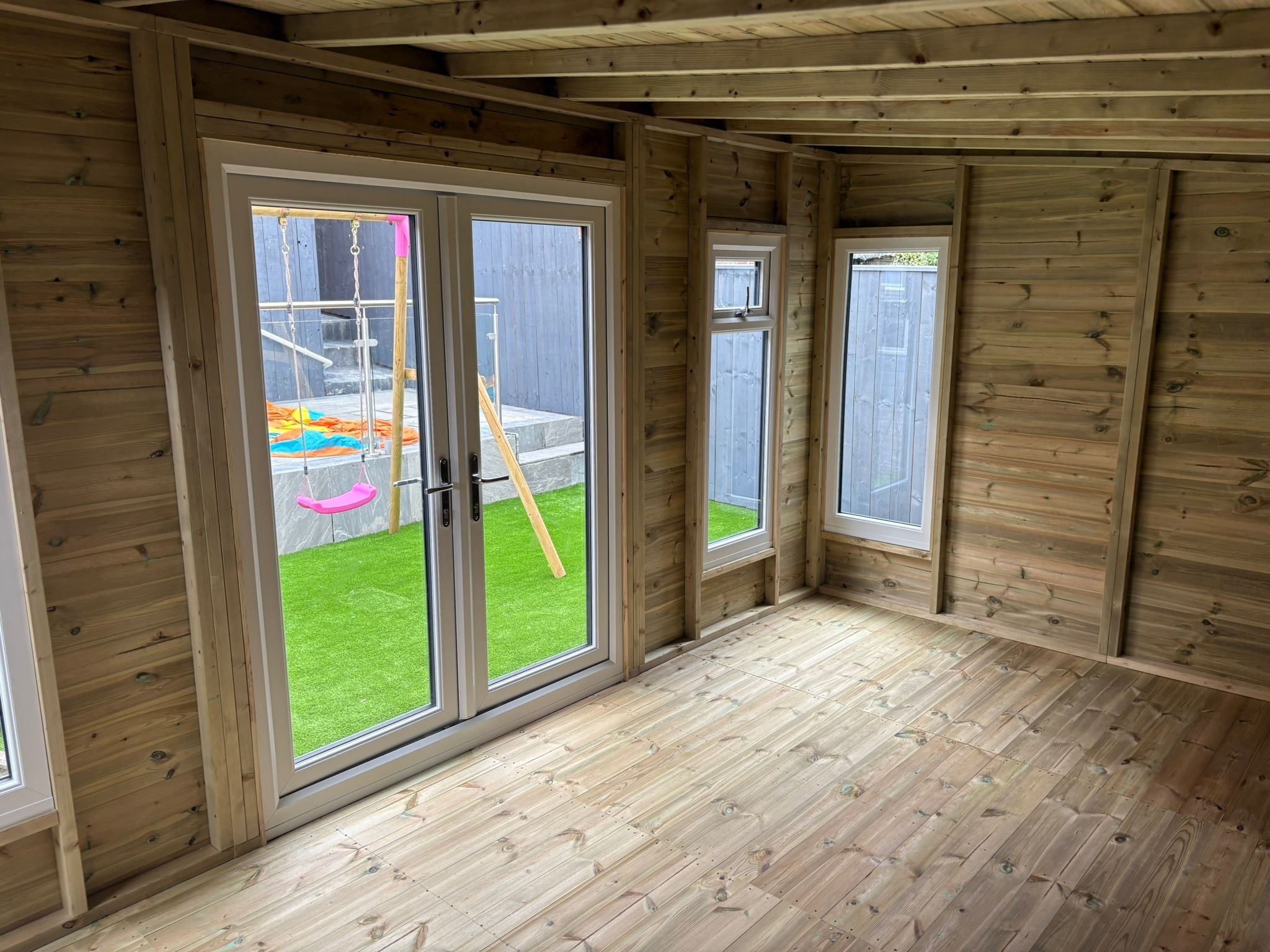 The summerhouse has a 1980 x 1600 wide pvc double glazed door and x 3 600 x 1500 pvc double glazed windows. 2 of the windows are opening and 1 is fixed.