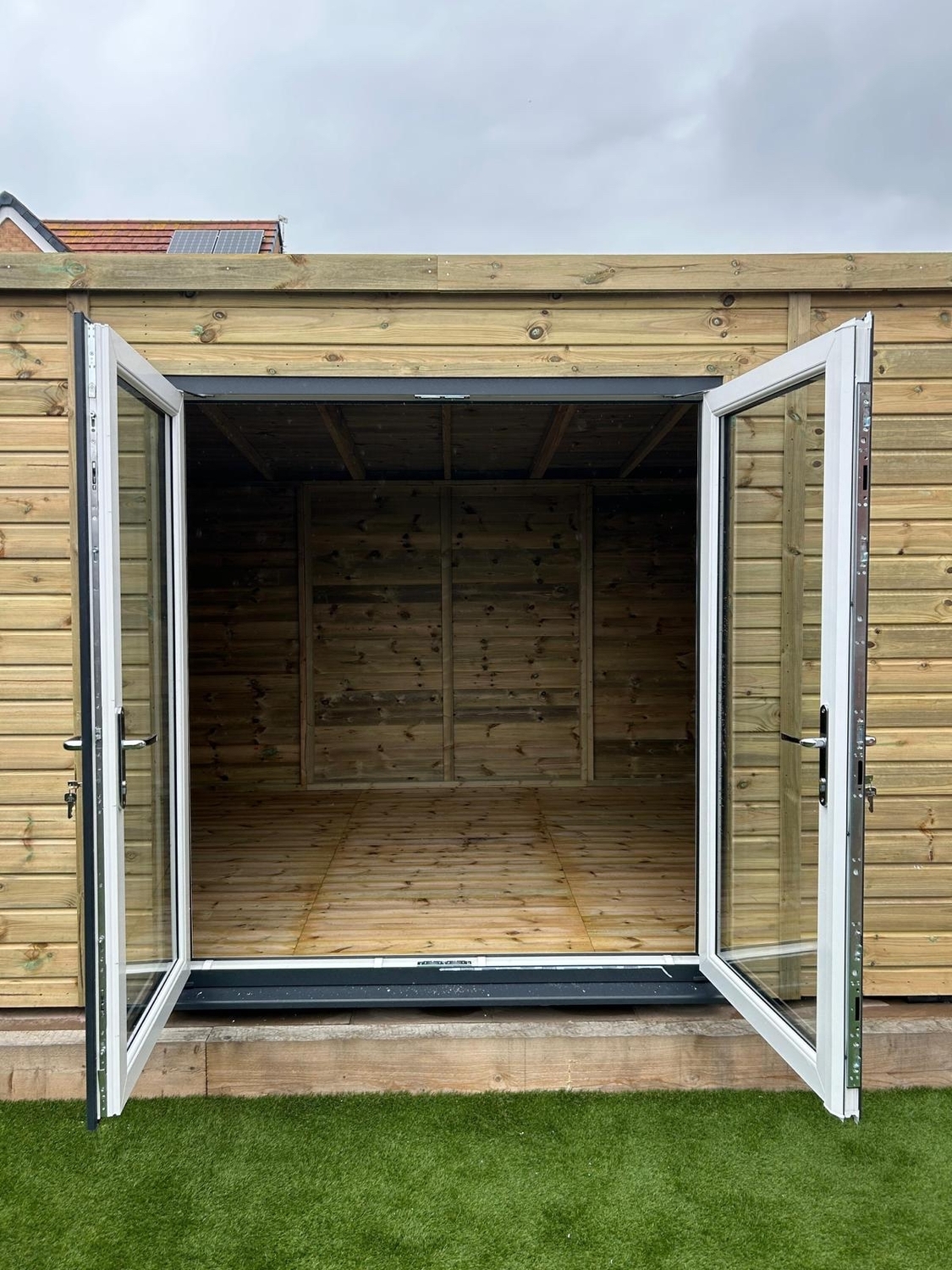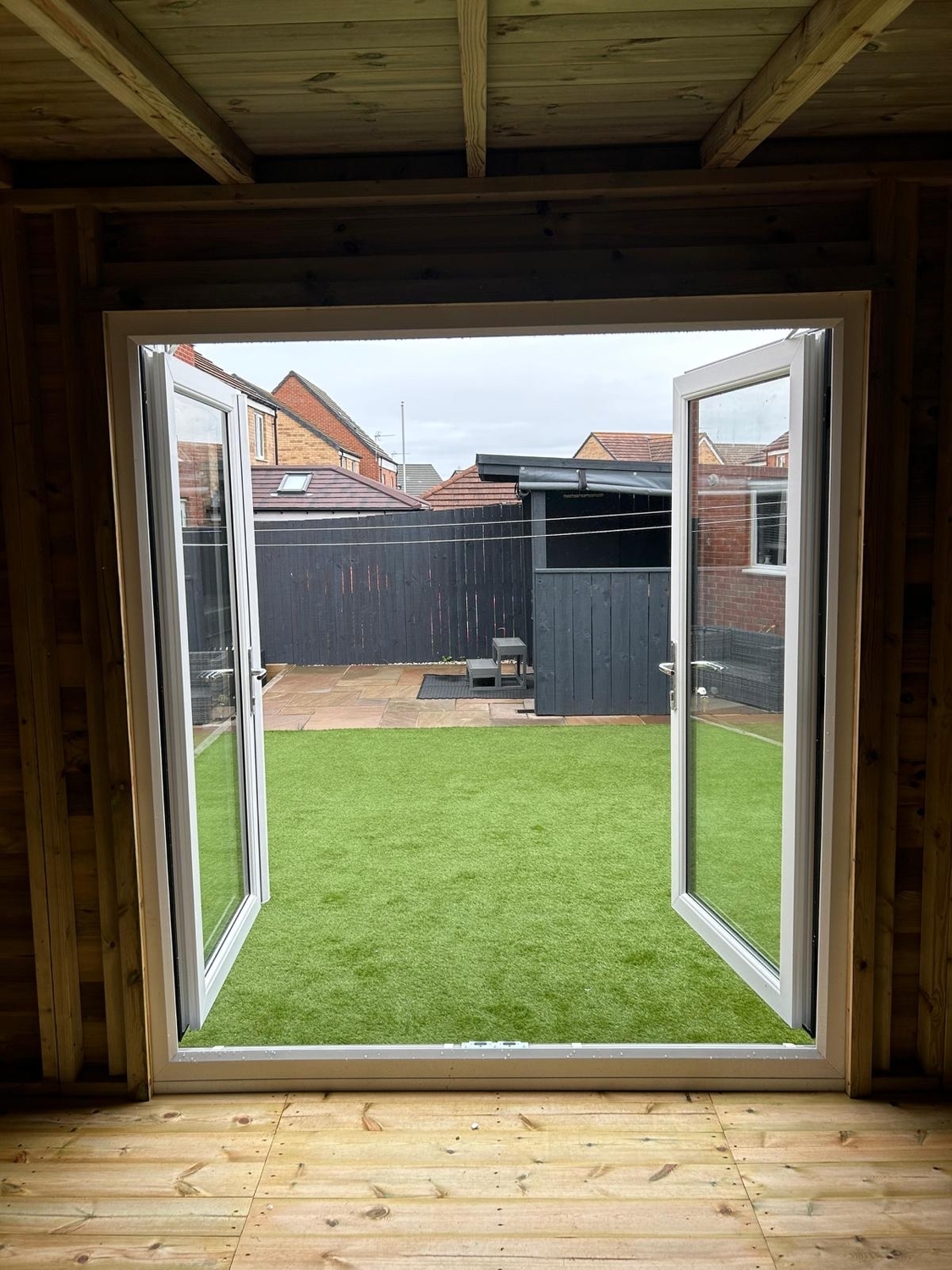 The summerhouse has a 1980 x 1600 wide pvc double glazed door.