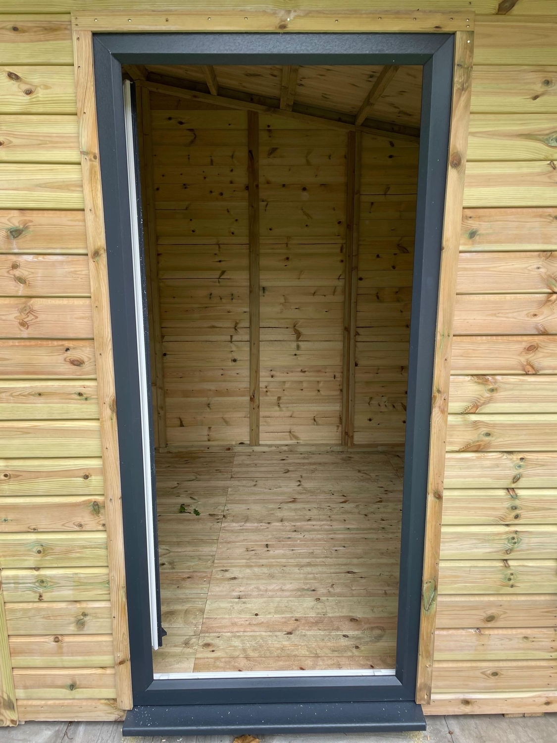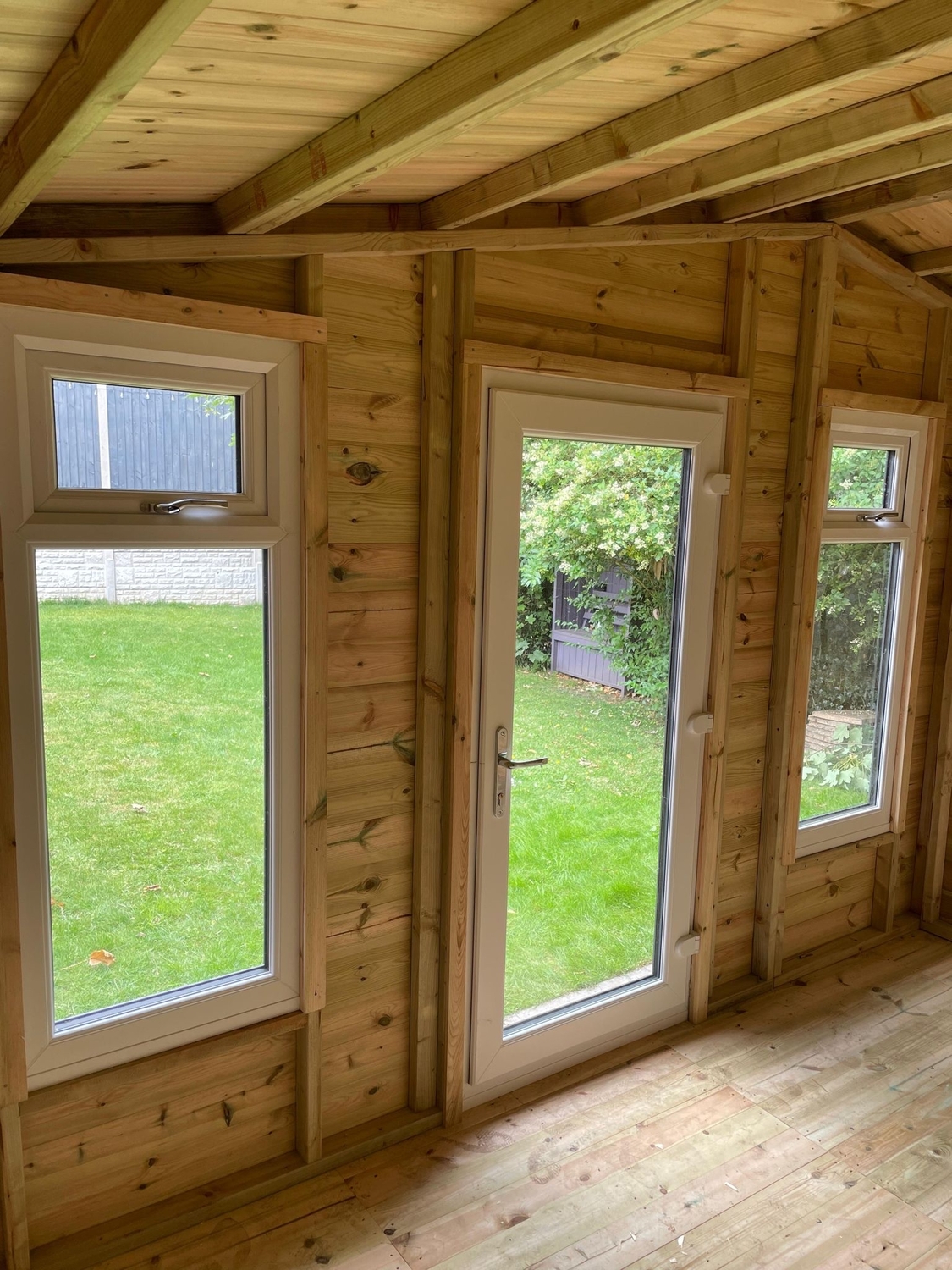 The summerhouse has 2 1930 x 900 wide pvc double glazed single doors and x2 600 x 1500 fixed pvc double glazed windows.
