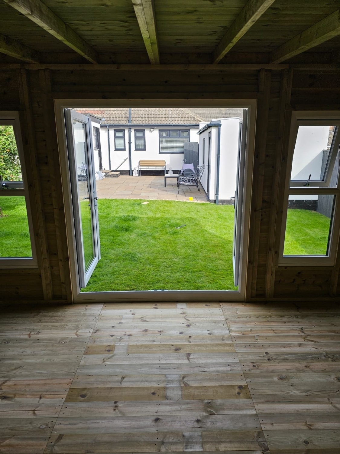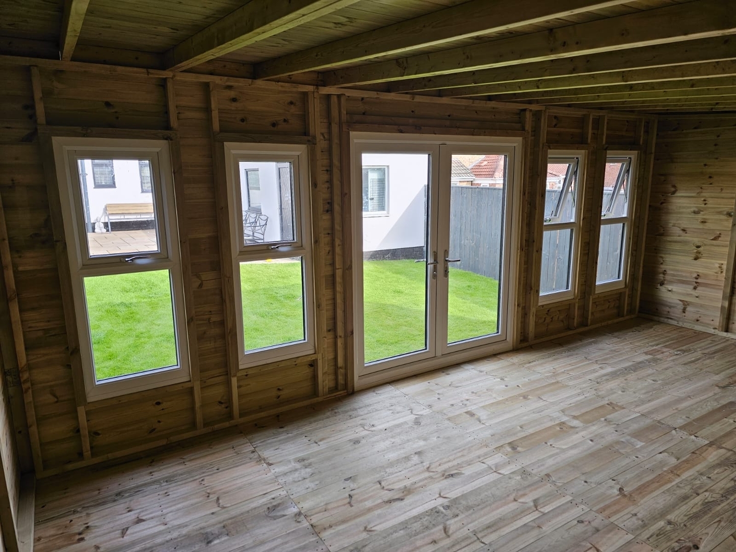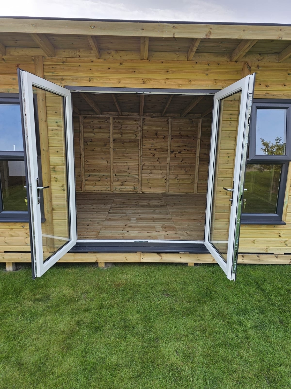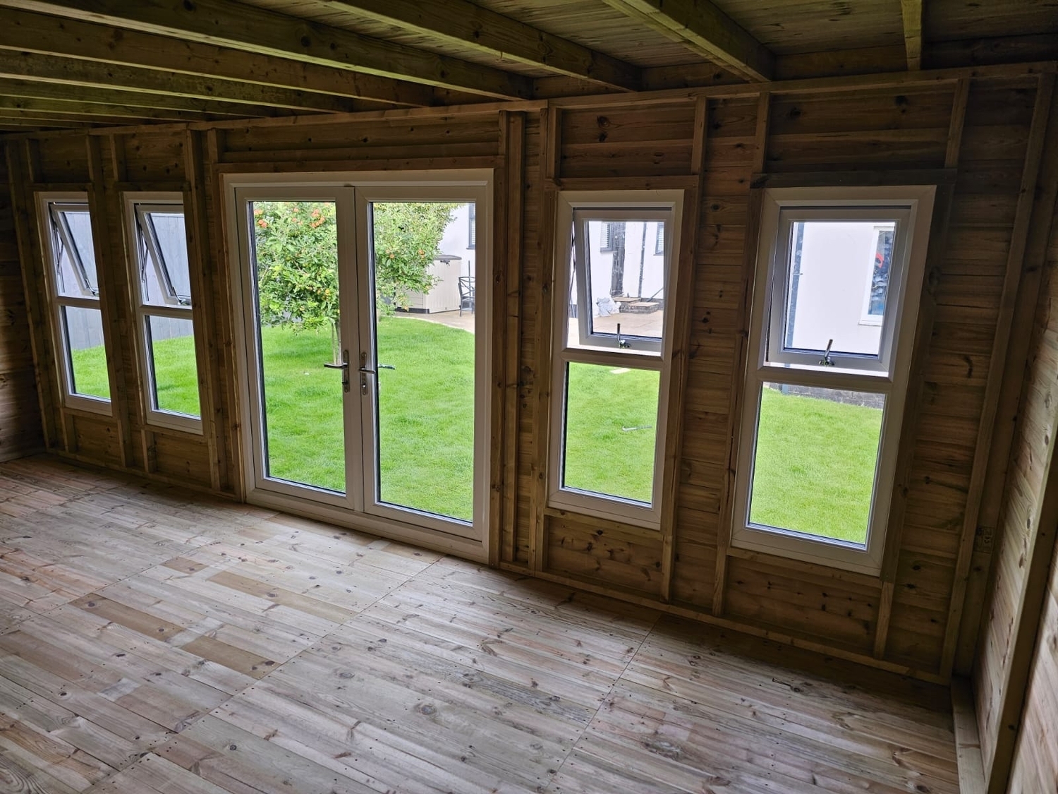 The summerhouse has a 1980 x 1600 wide pvc double glazed door and x4 600 x 1500 opening pvc double glazed windows.