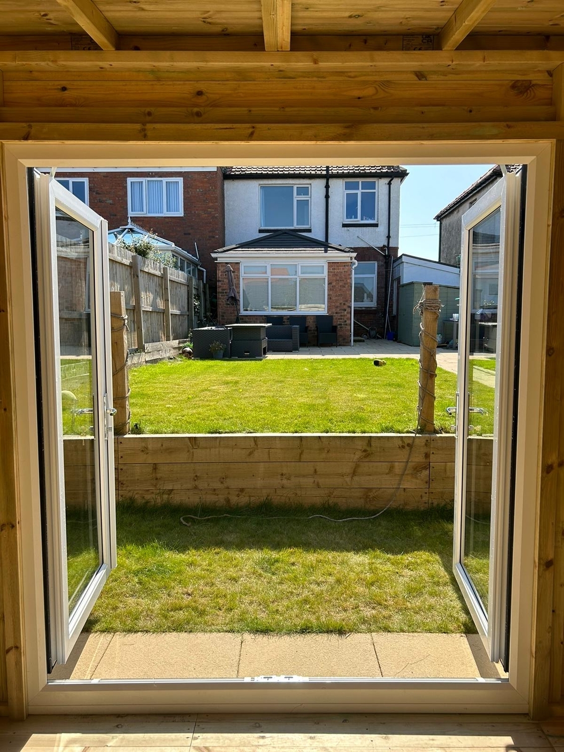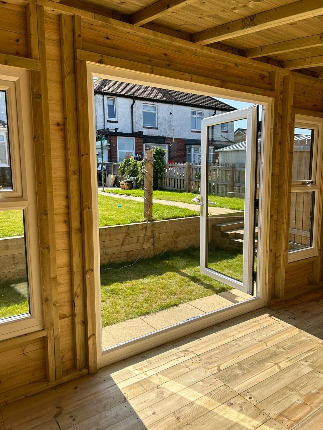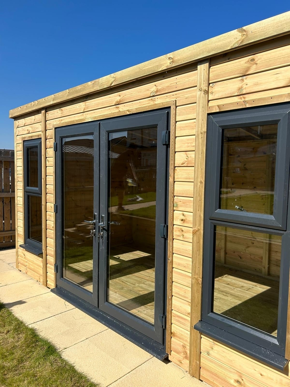 The summerhouse has a 1980 x 1600 wide pvc double glazed door and x 2 600 x 1500 opening pvc double glazed windows.