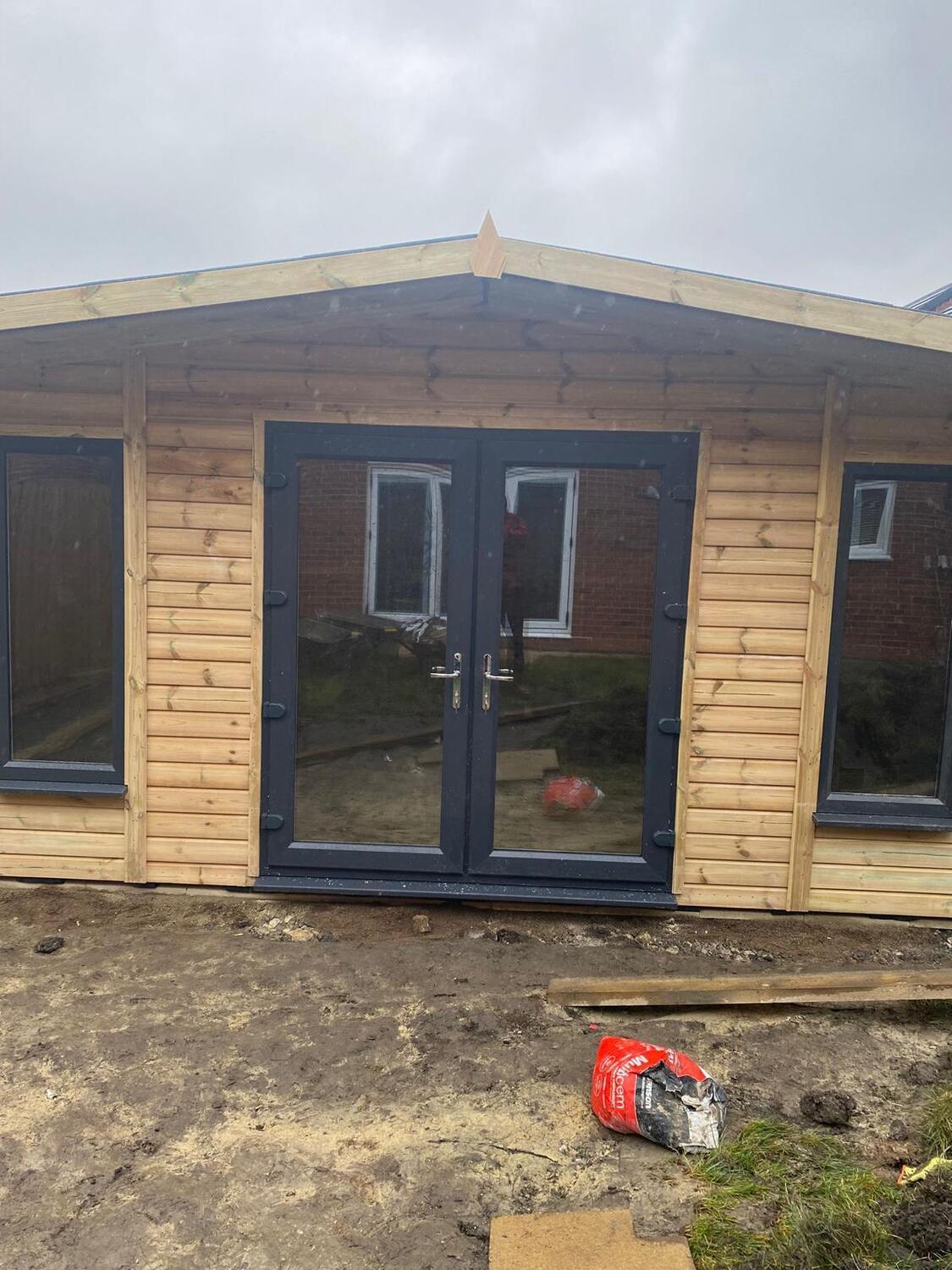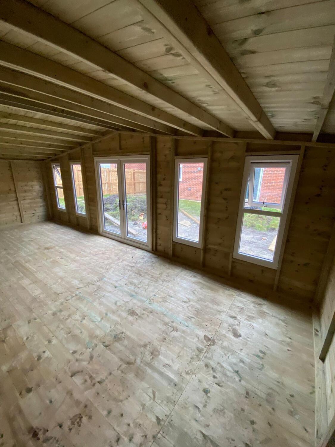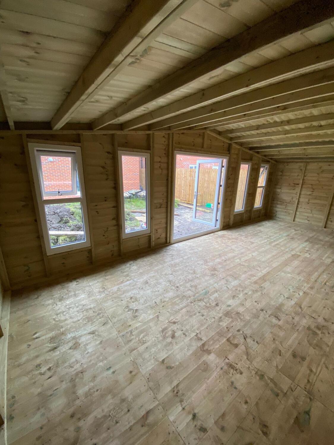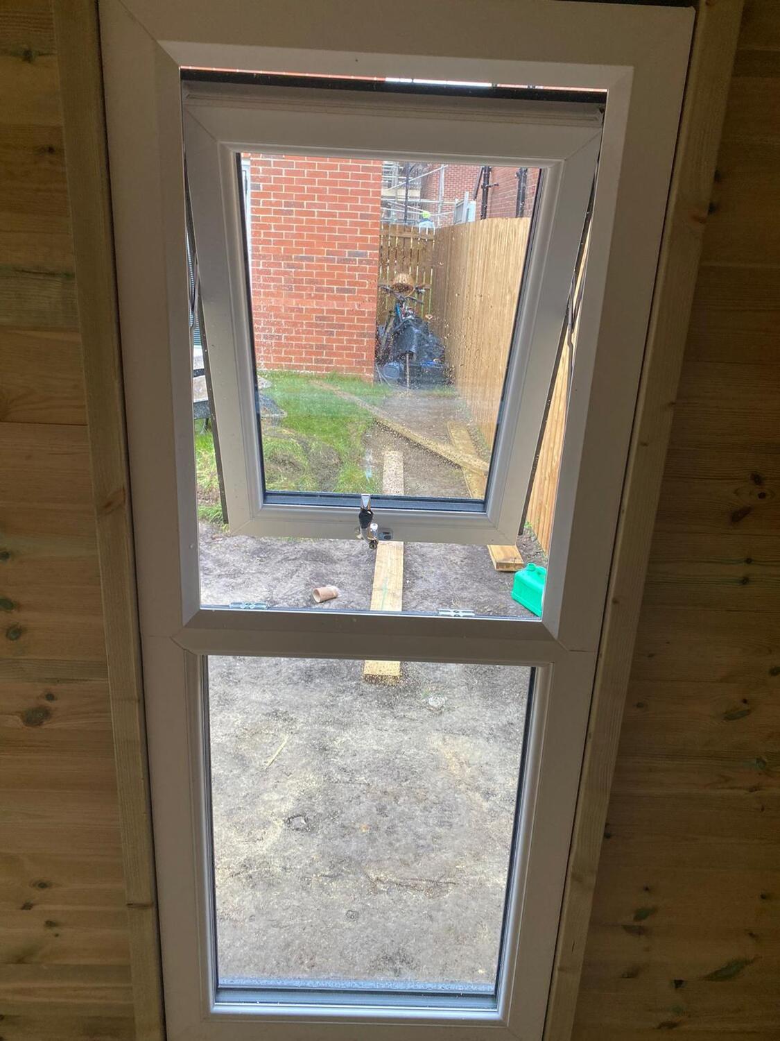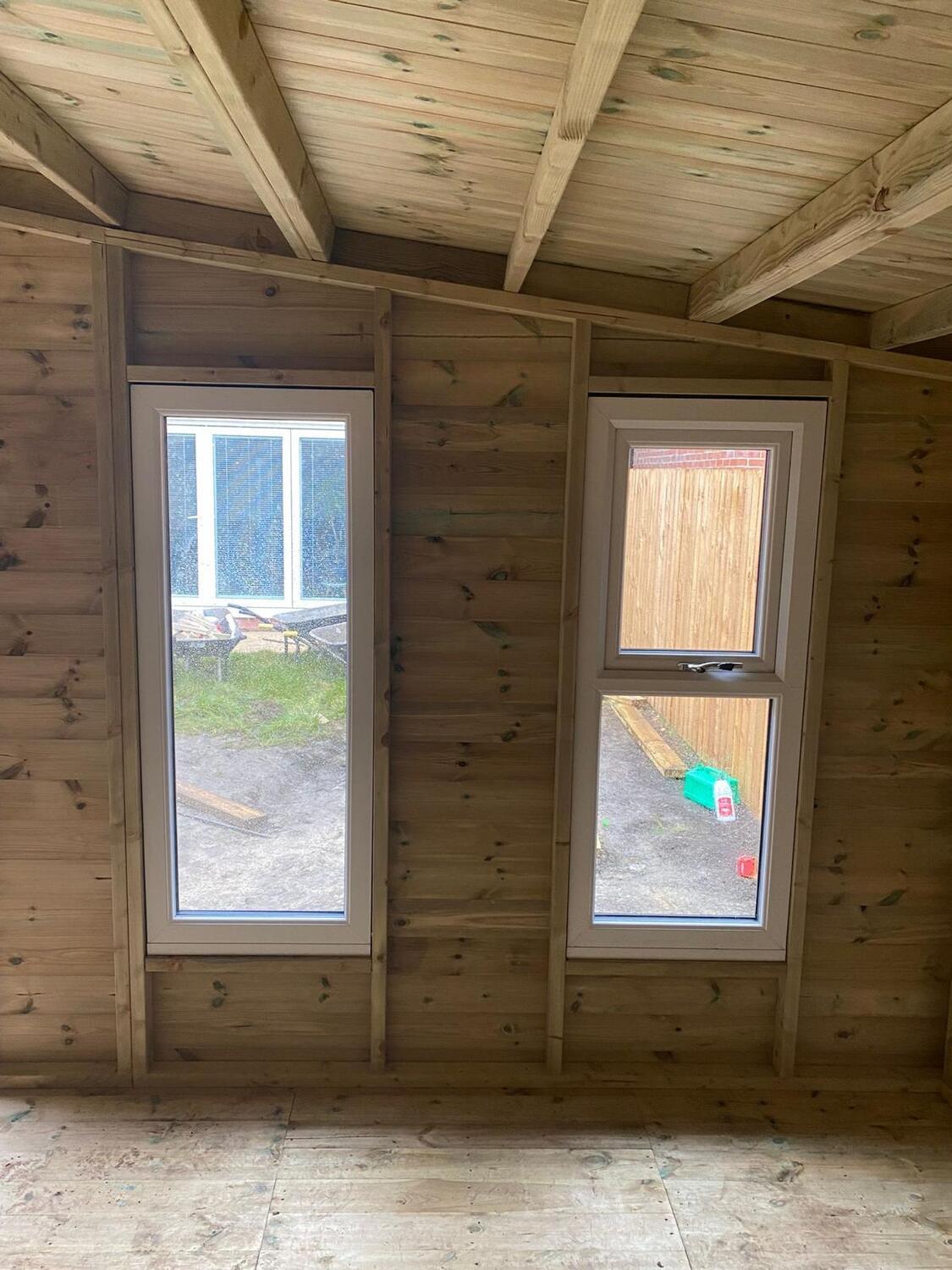 The summerhouse has a 1980 high x 1600 wide pvc double glazed door and x4 600 x 1500 pvc double glazed windows. 2 of the windows are opening and 2 are fixed.