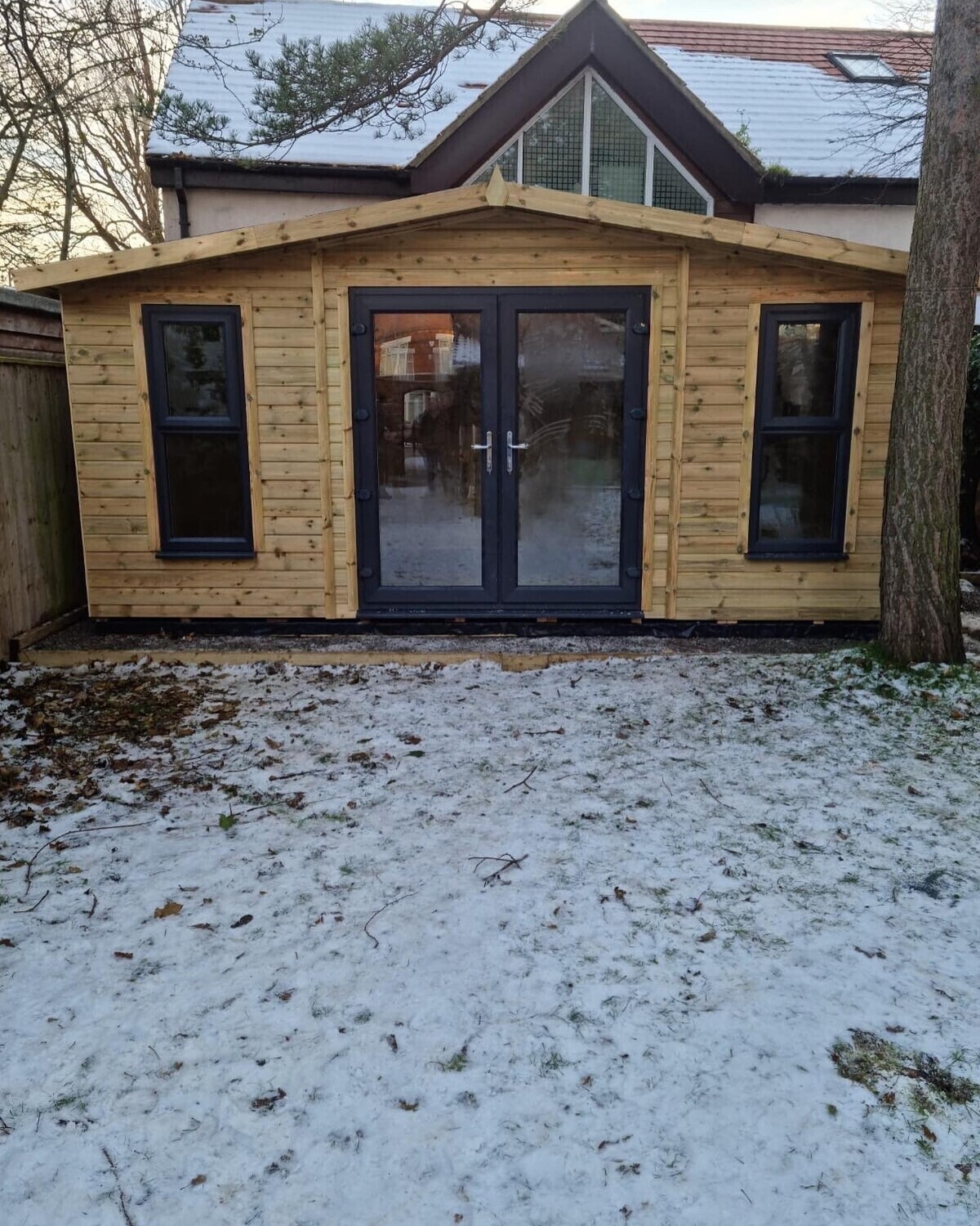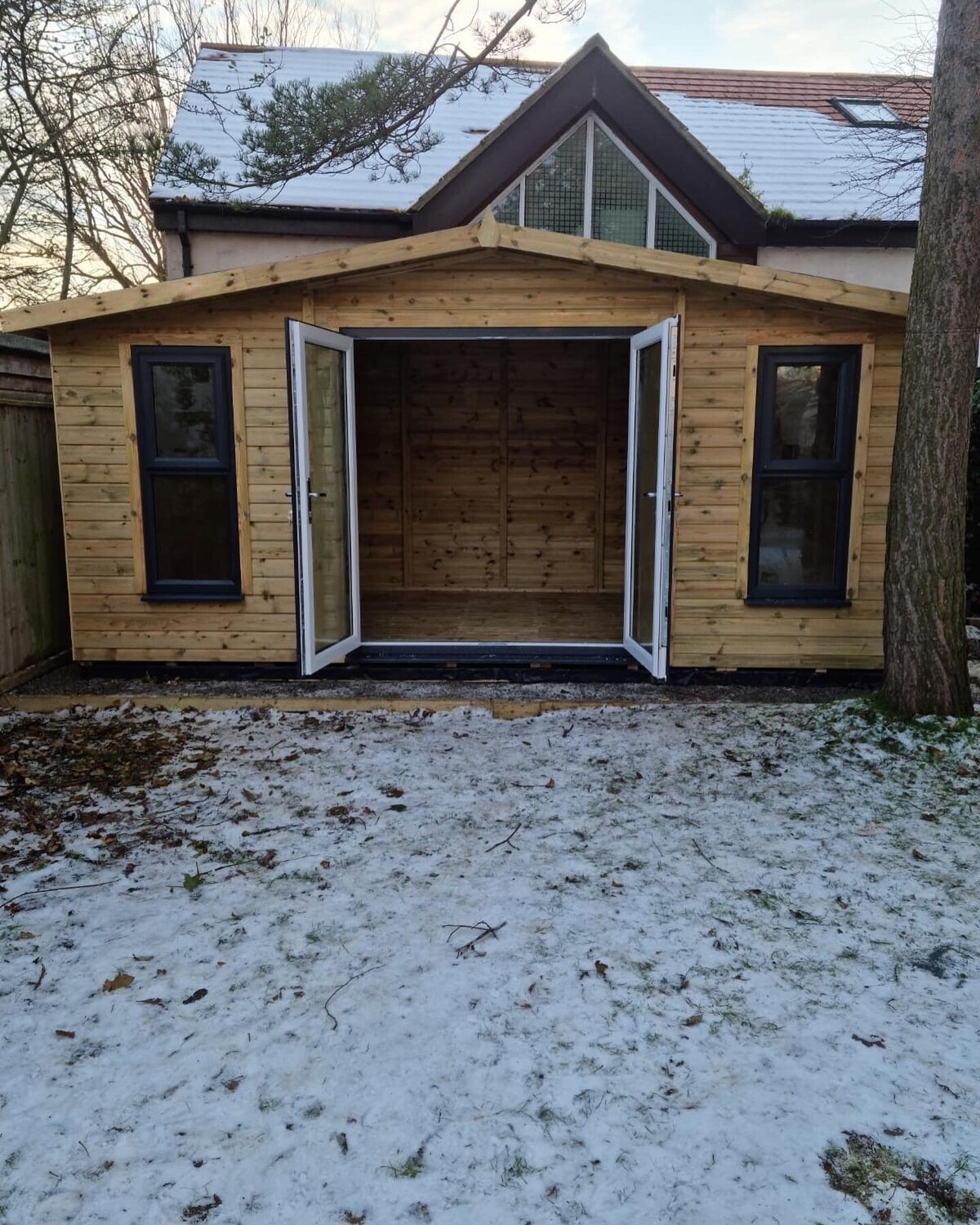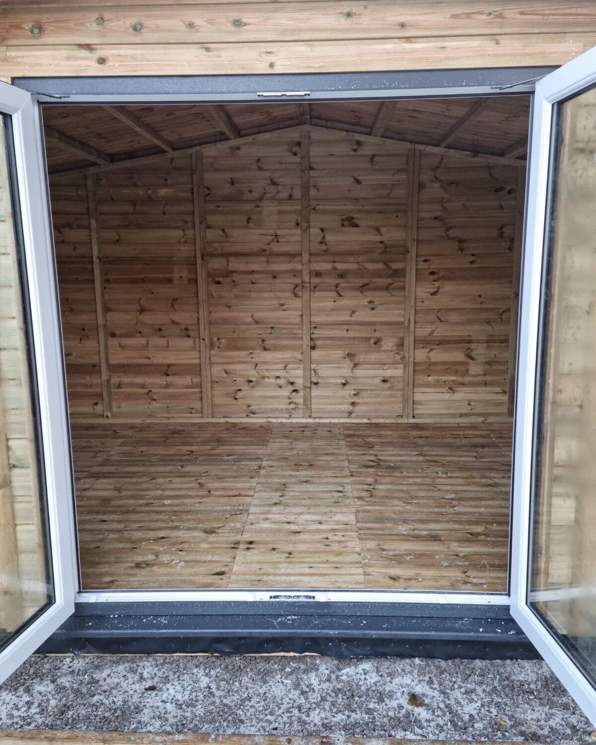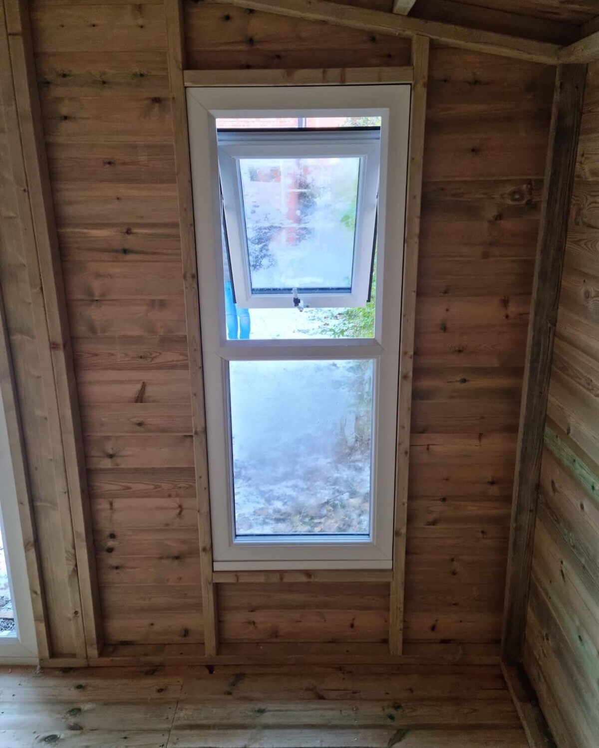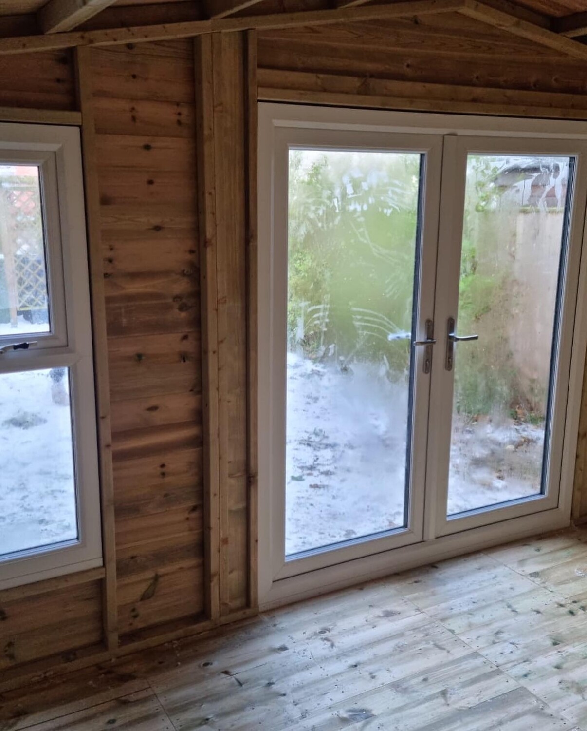 The summerhouse has a 1980 x 1600 wide pvc double glazed door and x2 600 x 1500 opening pvc double glazed windows.