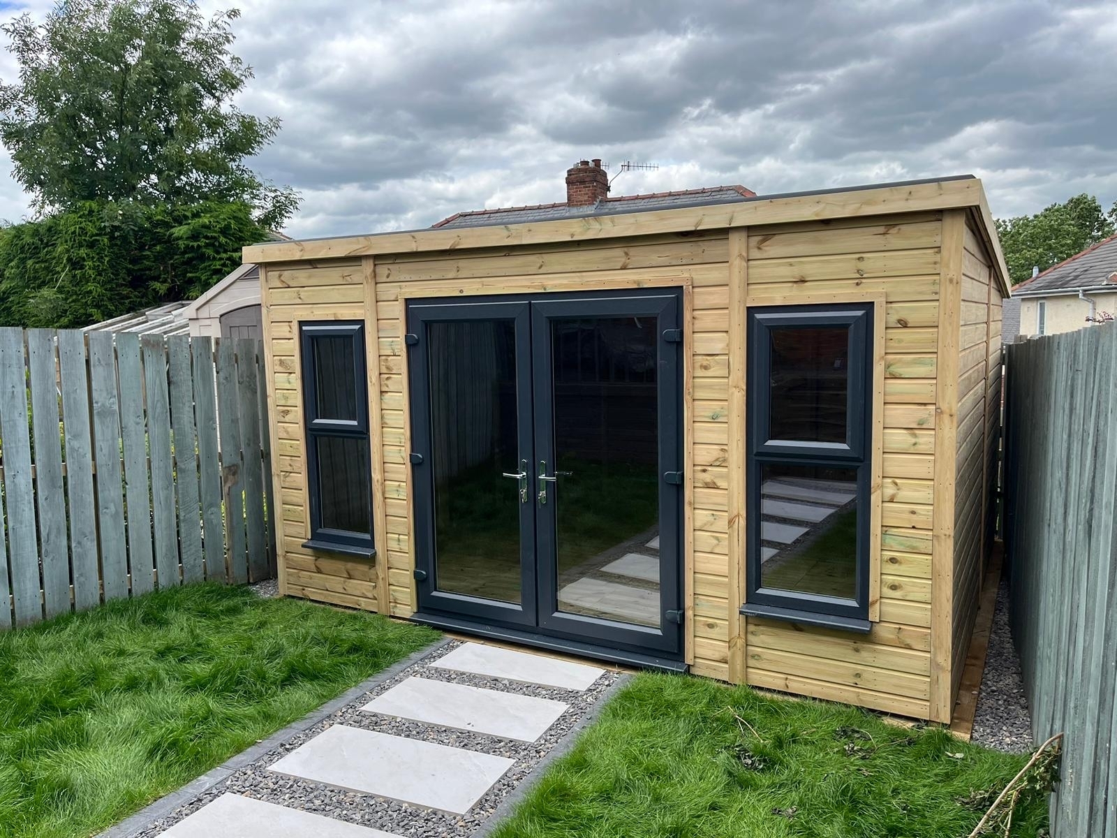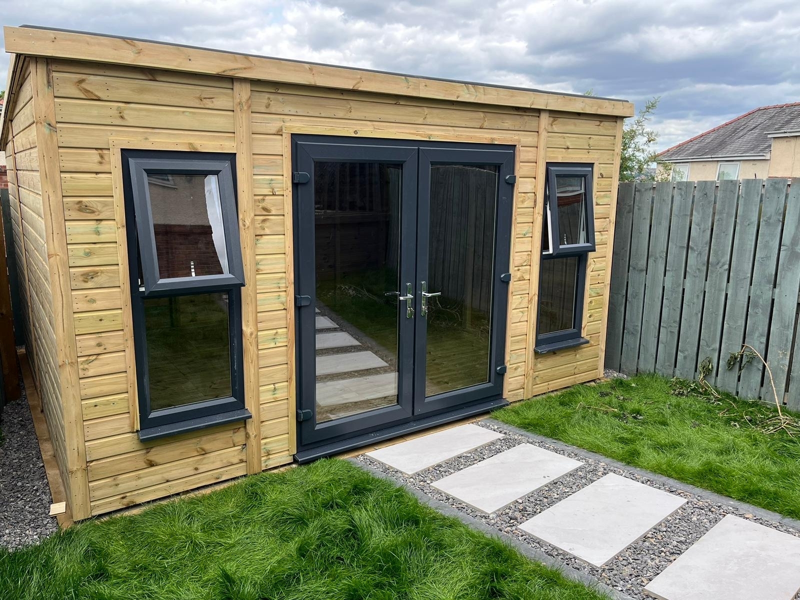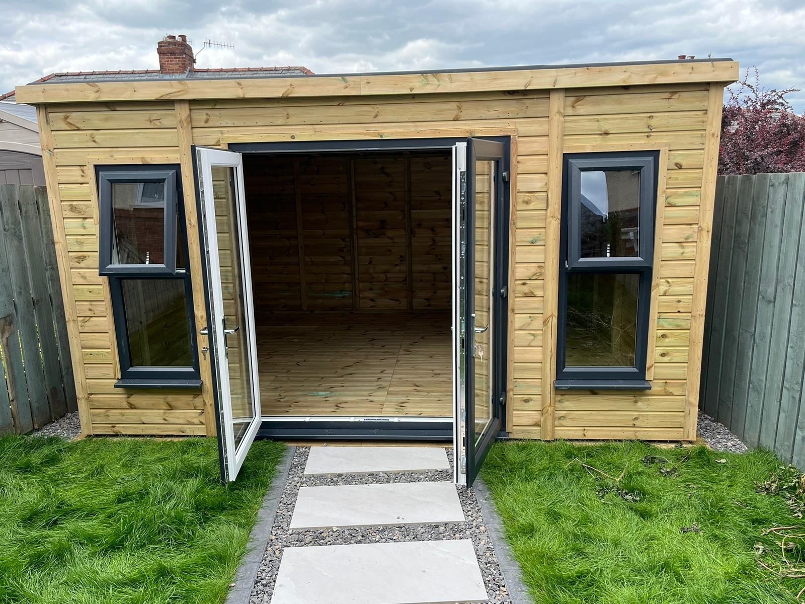 The summerhouse has a 1980 x 1600 wide pvc double glazed door and x2 1500 x 600 pvc opening windows.