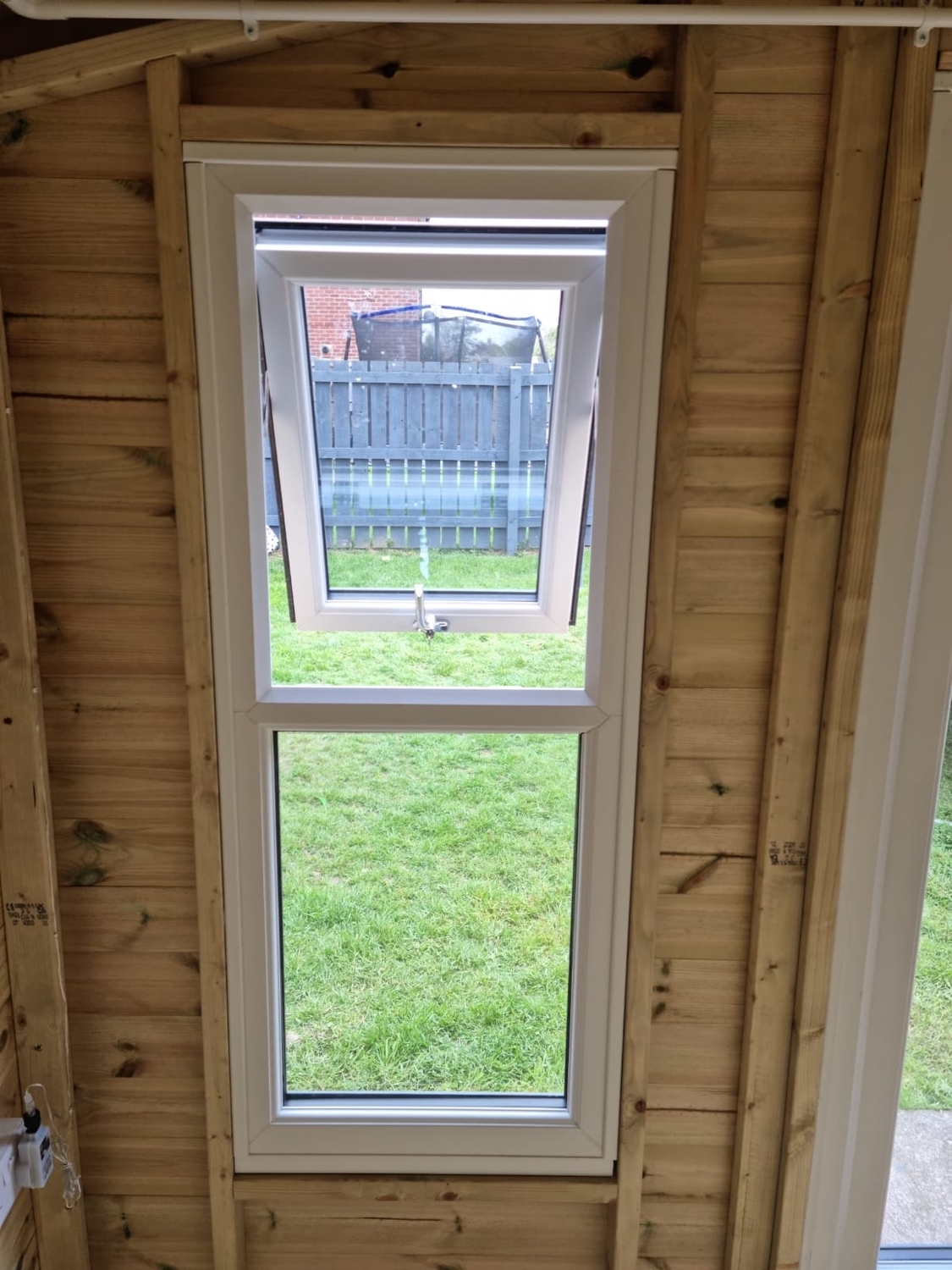 The summerhouse has a 1980 high x 1600 wide pvc double glazed door and x2 600 x 1500 opening pvc double glazed windows.