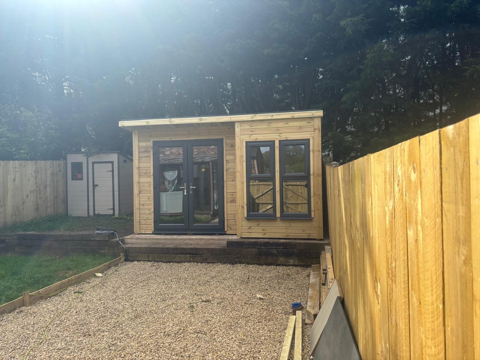 The summerhouse has a 1980 x 1600 wide pvc double glazed door and x2 1500 x 600 pvc opening windows.