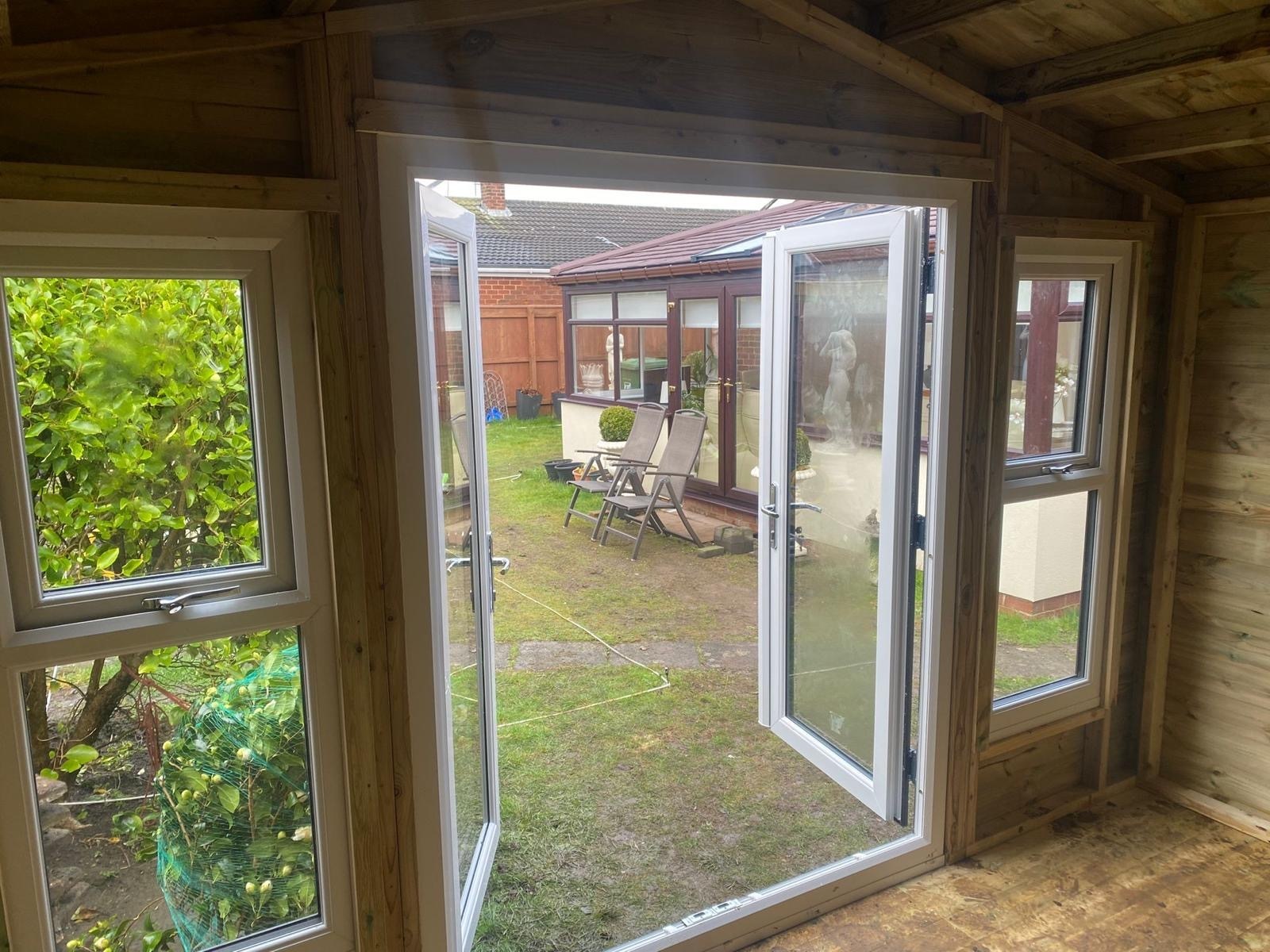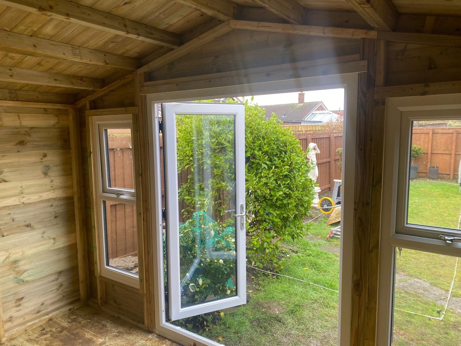 The summerhouse has a 1980 high x 1600 wide pvc double glazed door and x2 600 x 1500 opening pvc double glazed windows.