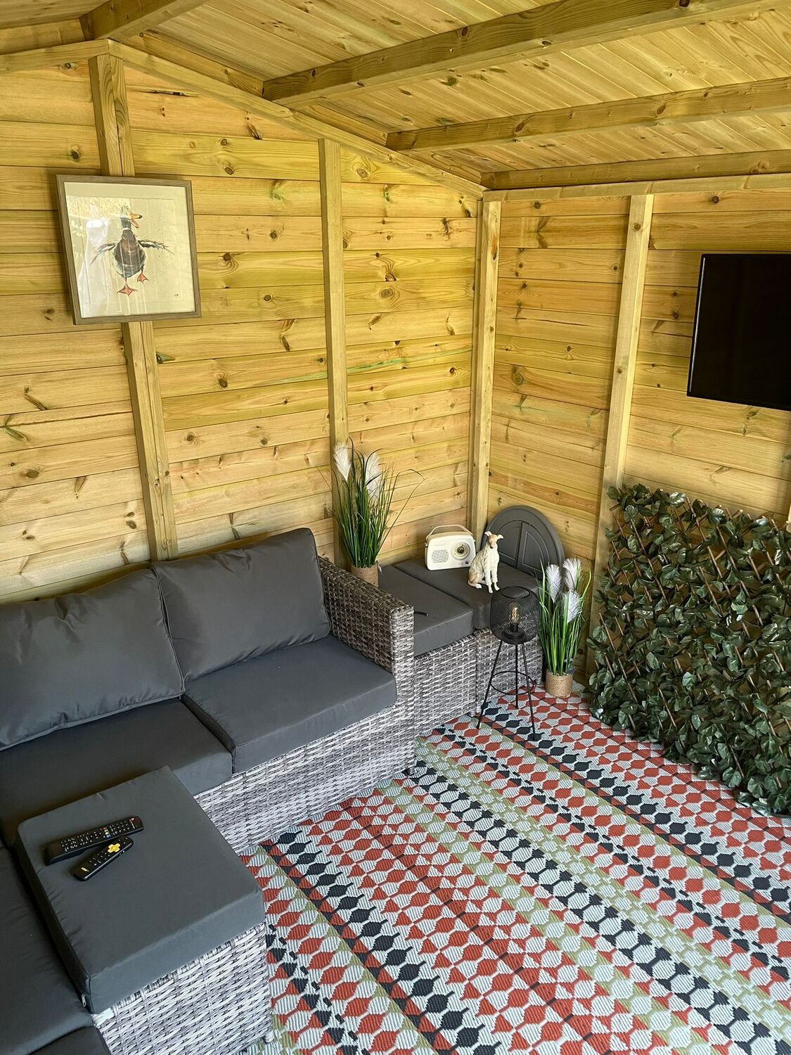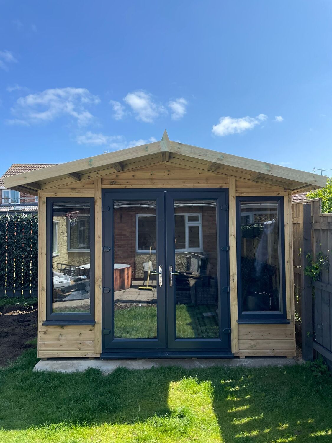 The summerhouse has a 1980 high x 1550 wide pvc double glazed door and x2 600 x 1500 fixed pvc double glazed windows.