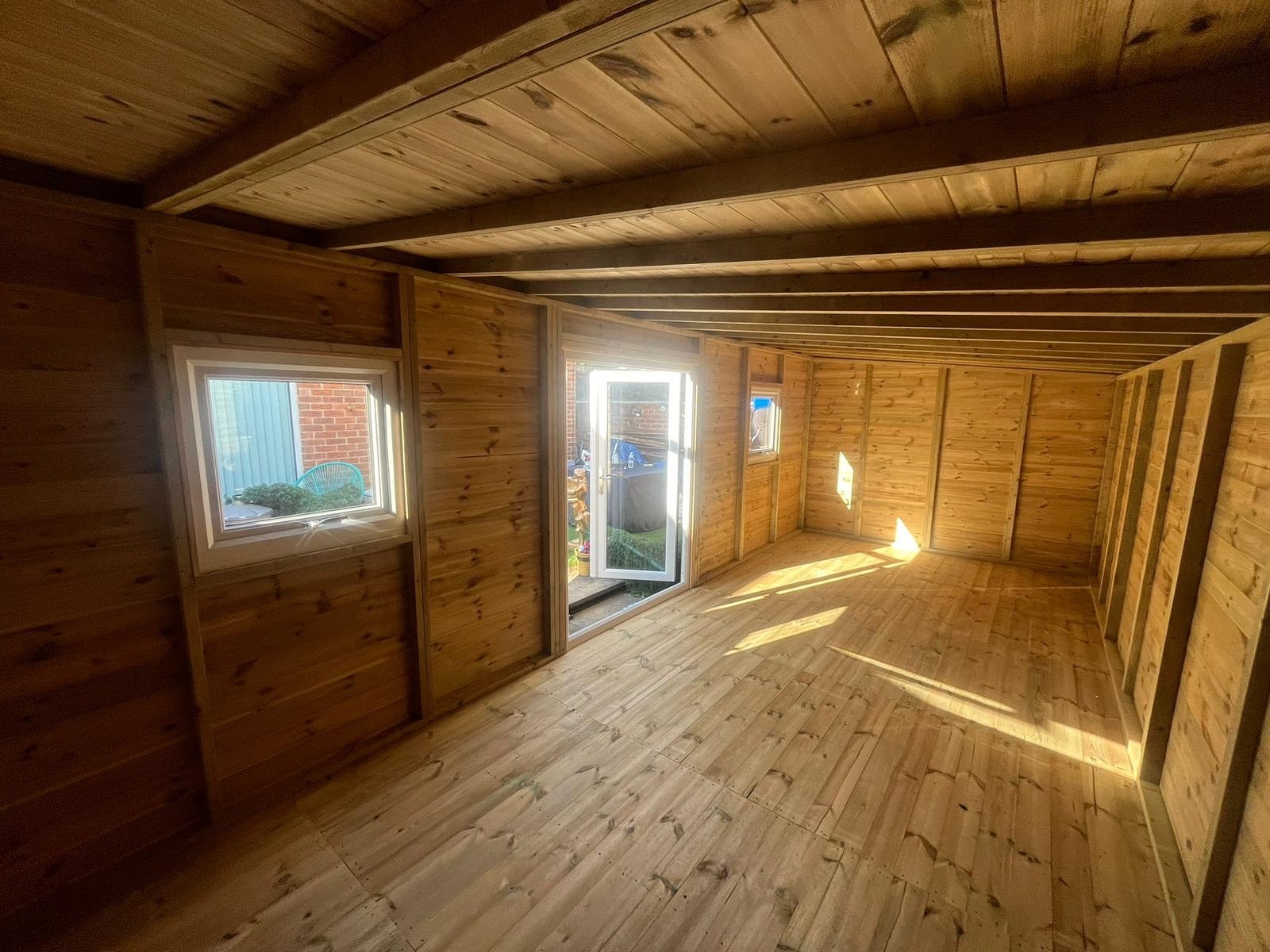 The summerhouse has a 1980 x 1600 wide pvc double glazed door and x2 820x820 pvc windows.