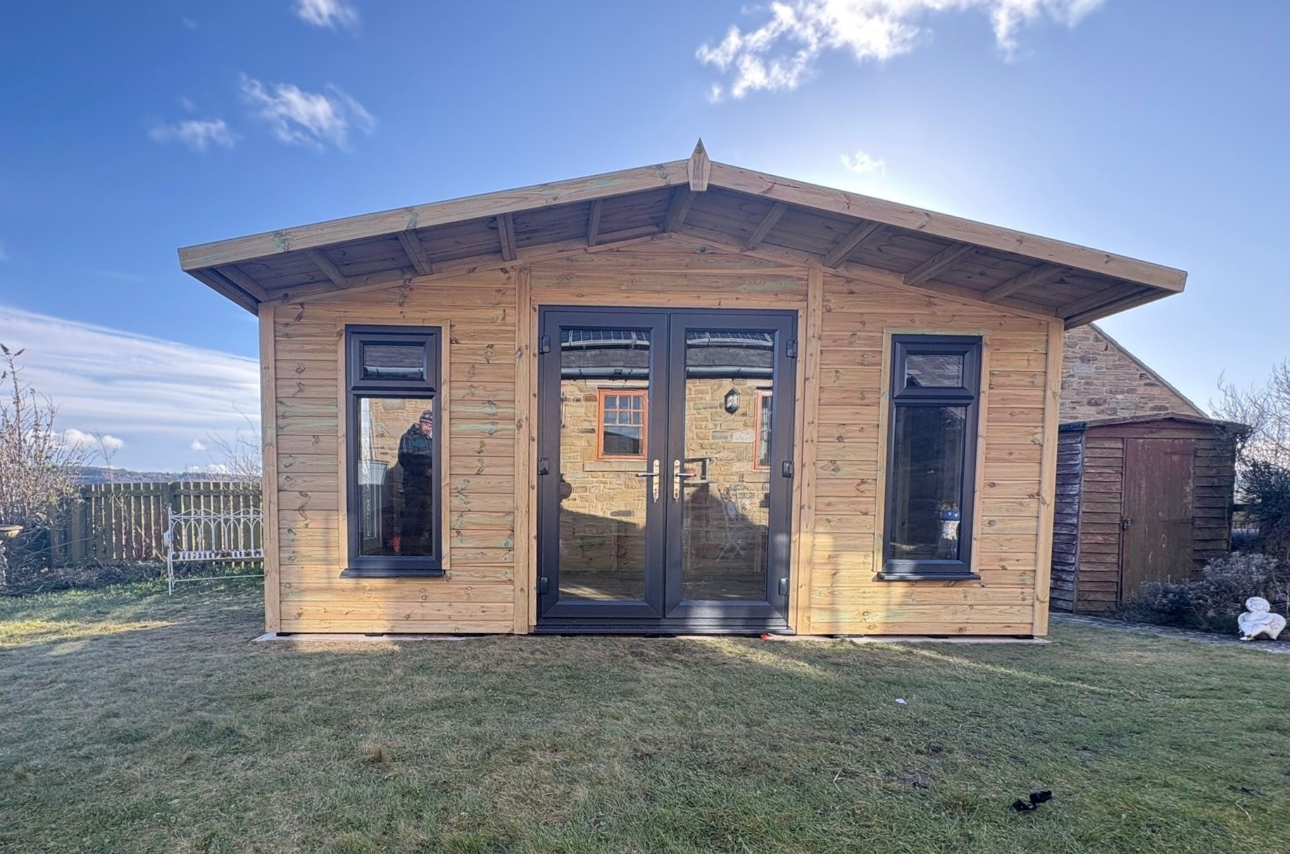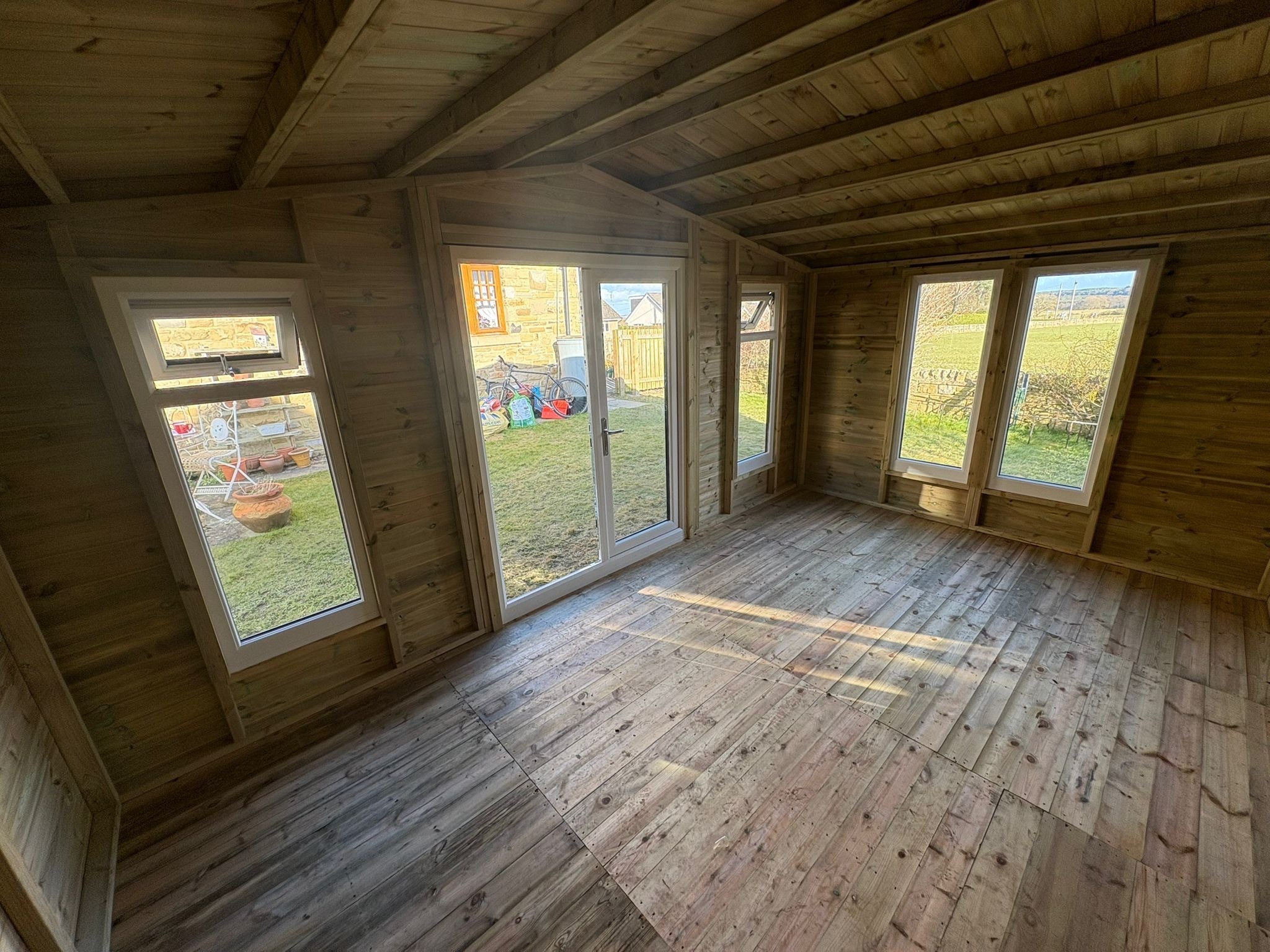 The summerhouse has a 1980 x 1600 wide pvc double glazed door, x2 600 x 1500 opening pvc double glazed windows and x2 600 x 1500 fixed pvc double glazed windows.