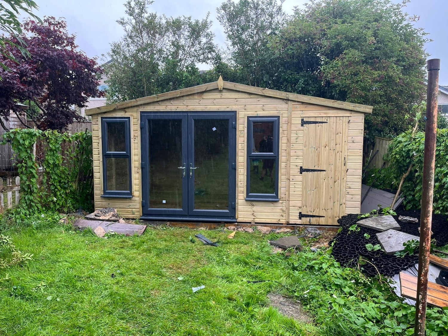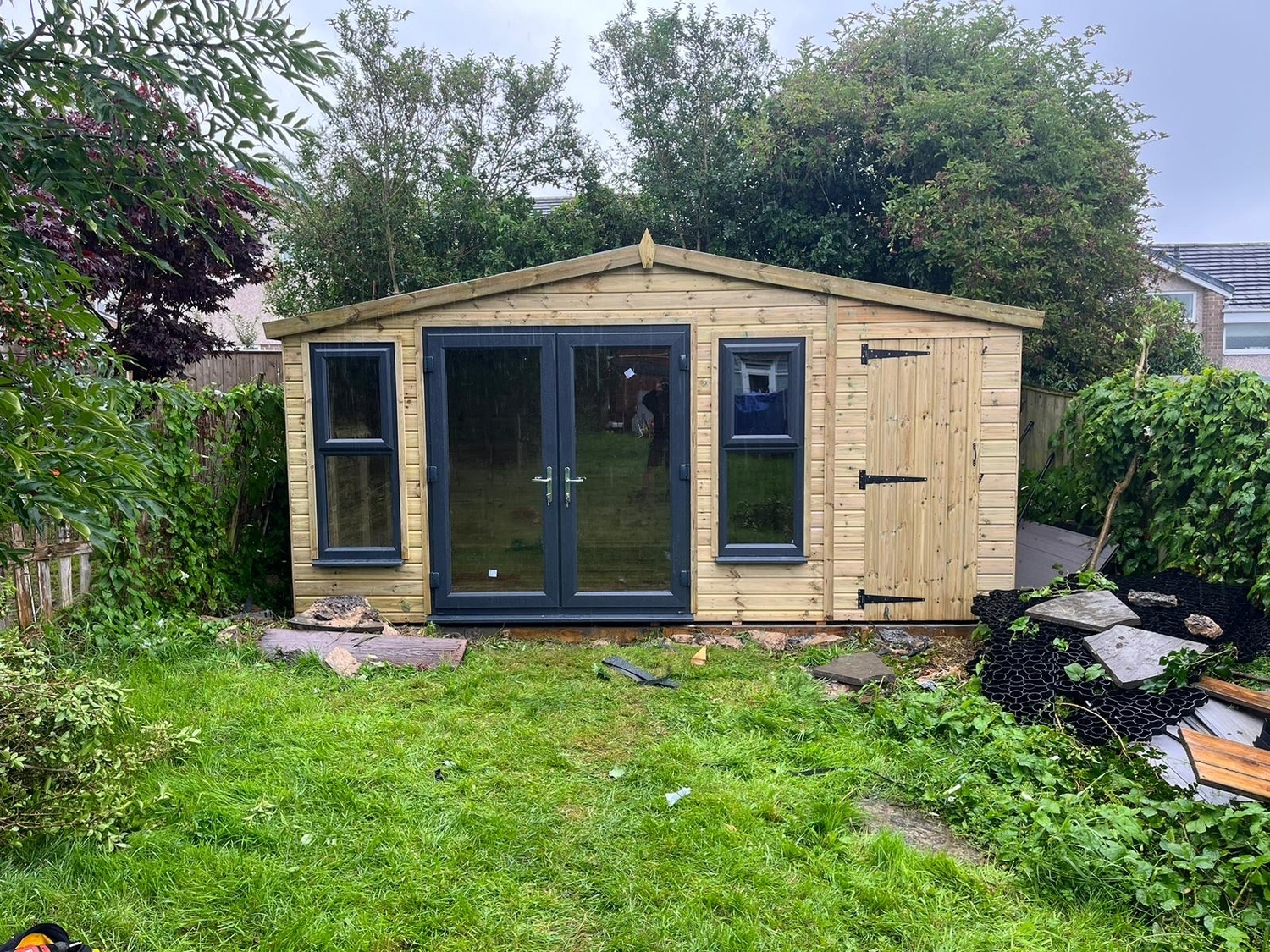 The summerhouse has a 1980 x 1600 wide pvc double glazed door and x2 600 x 1500 opening pvc double glazed windows as well as a partition with solid single wooden door to make separate shed storage area.