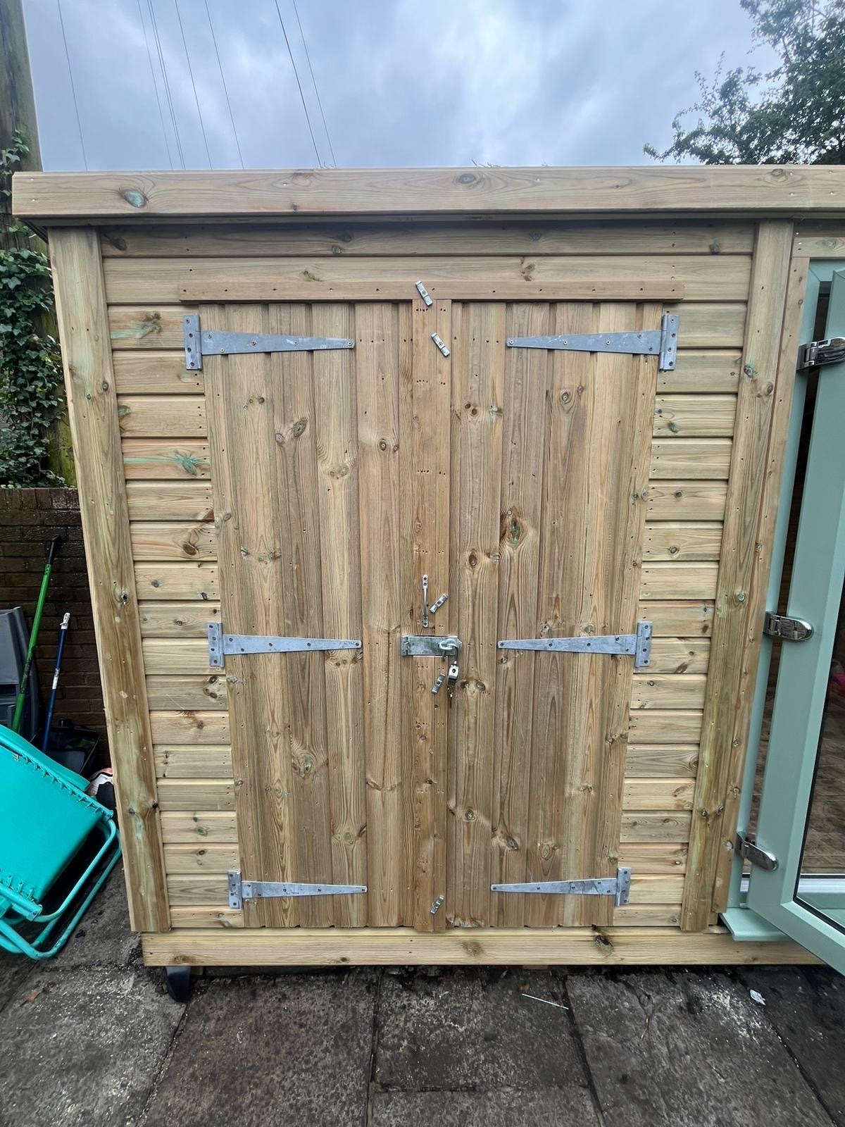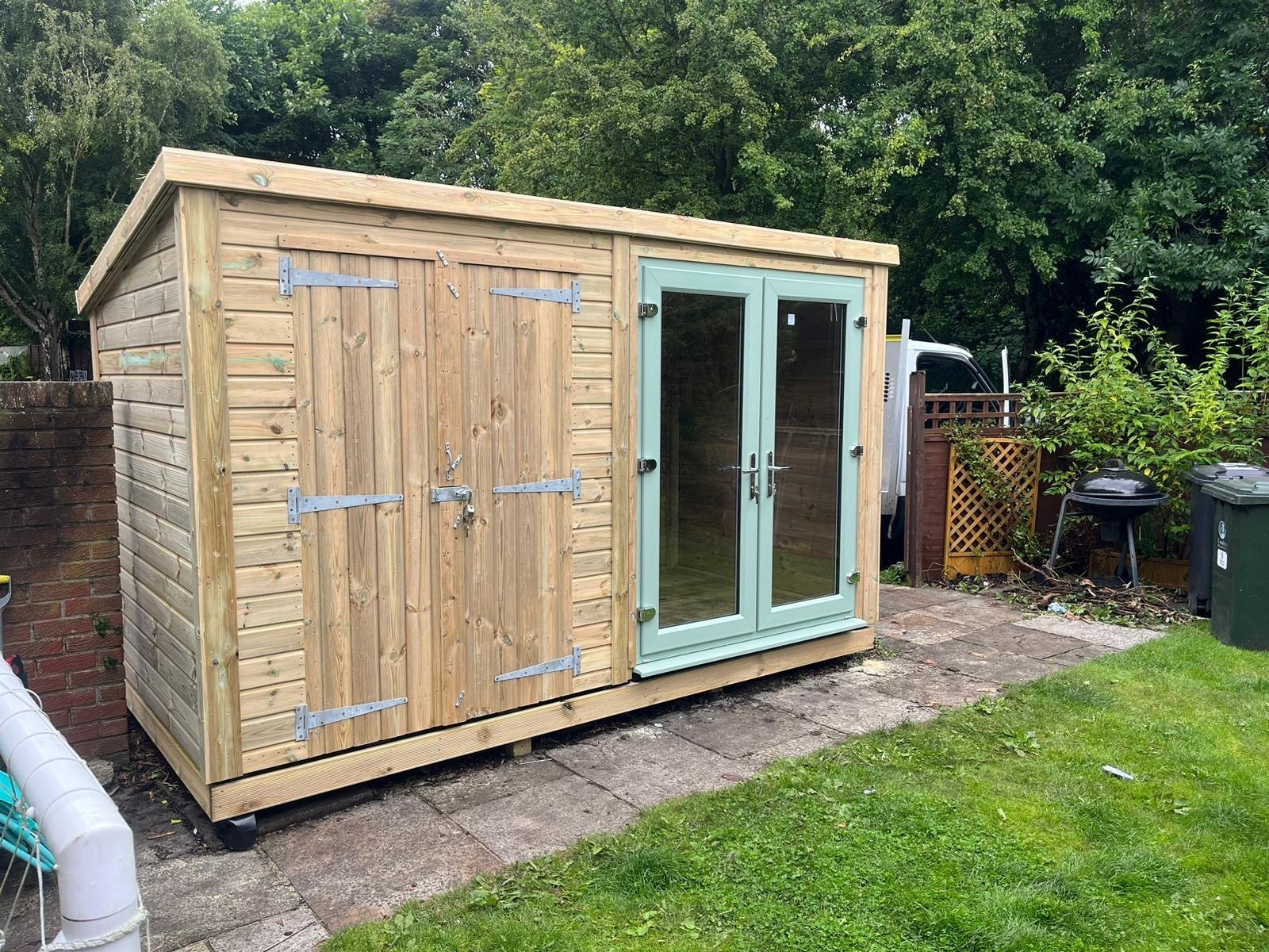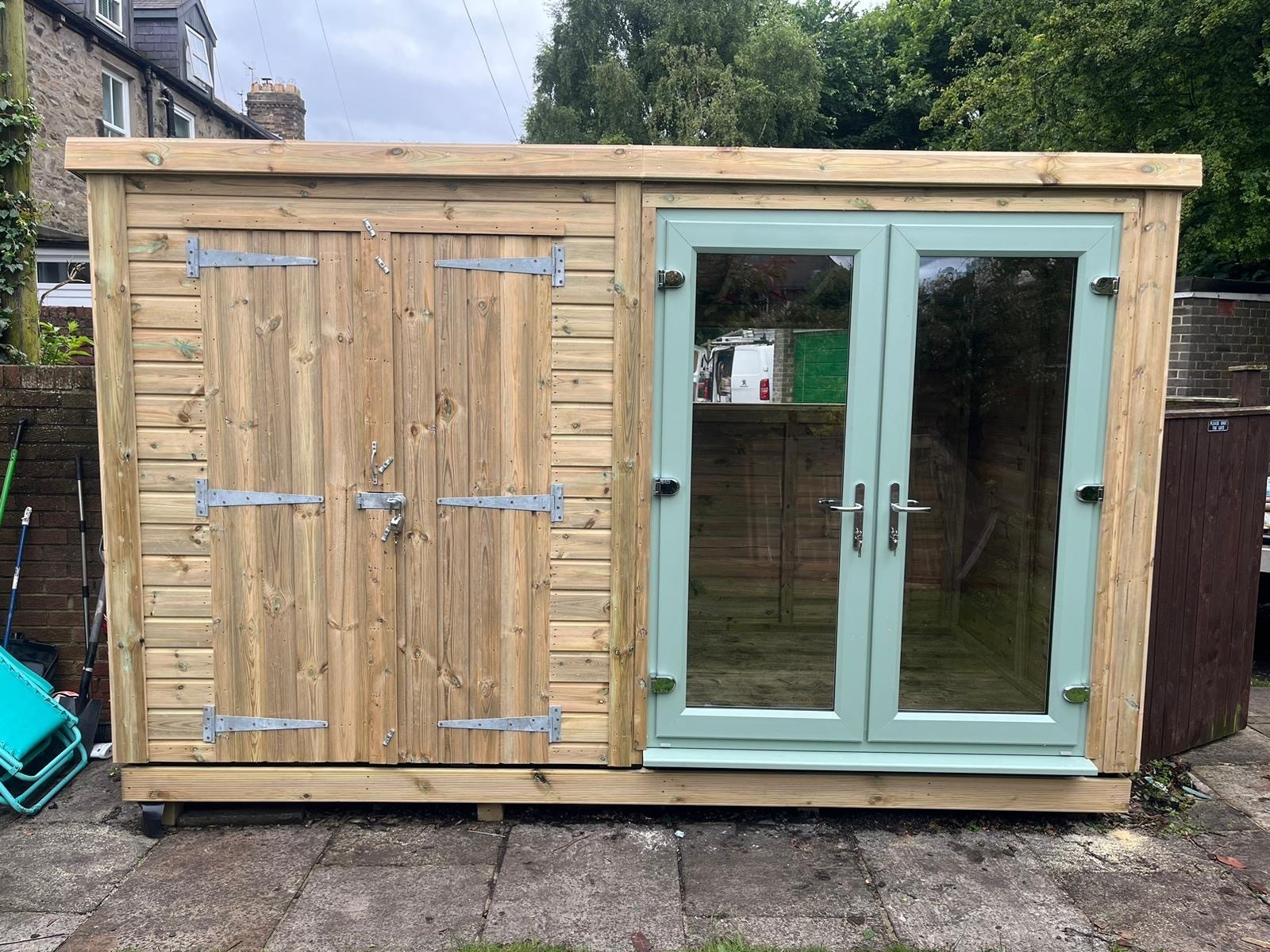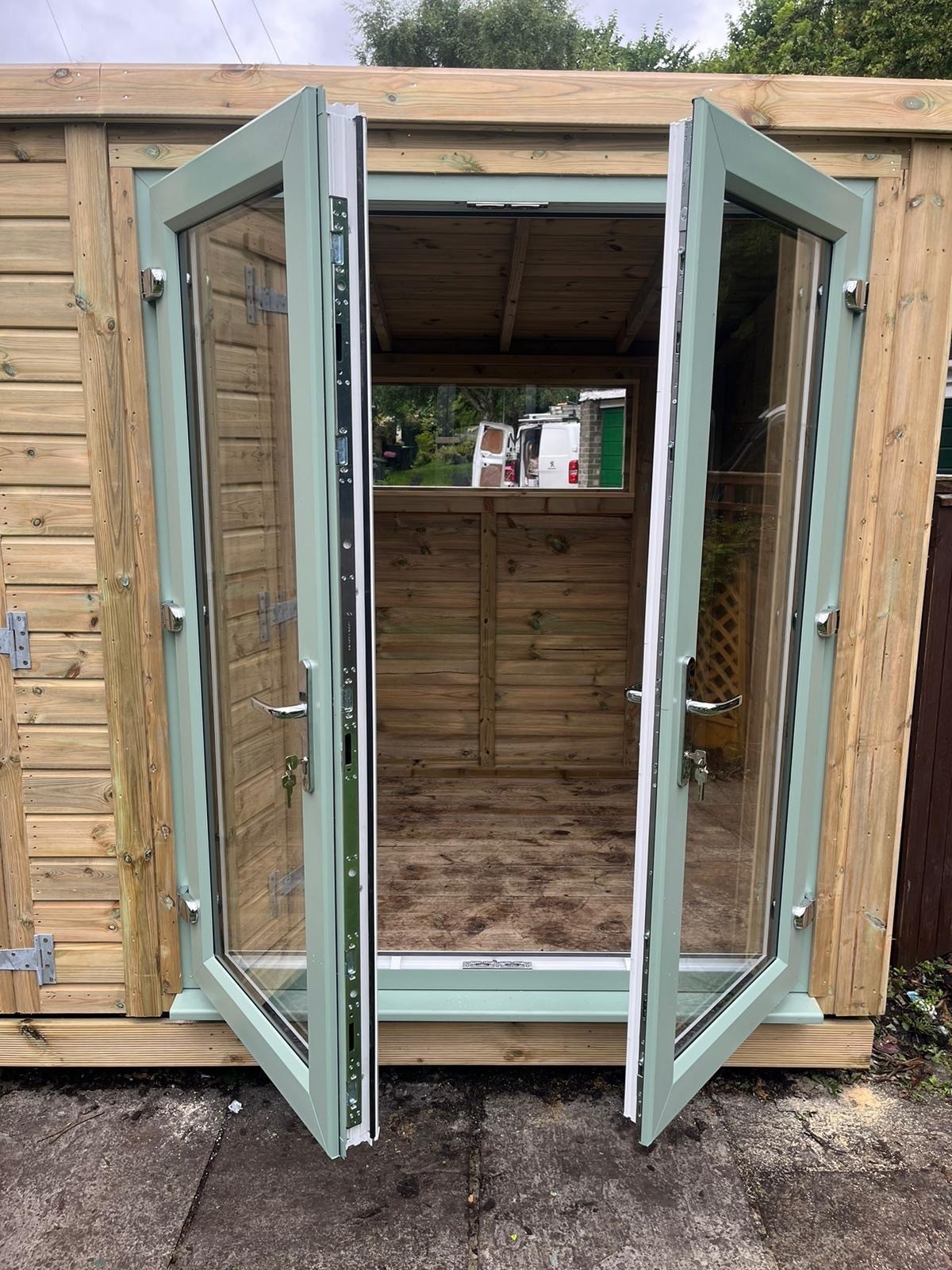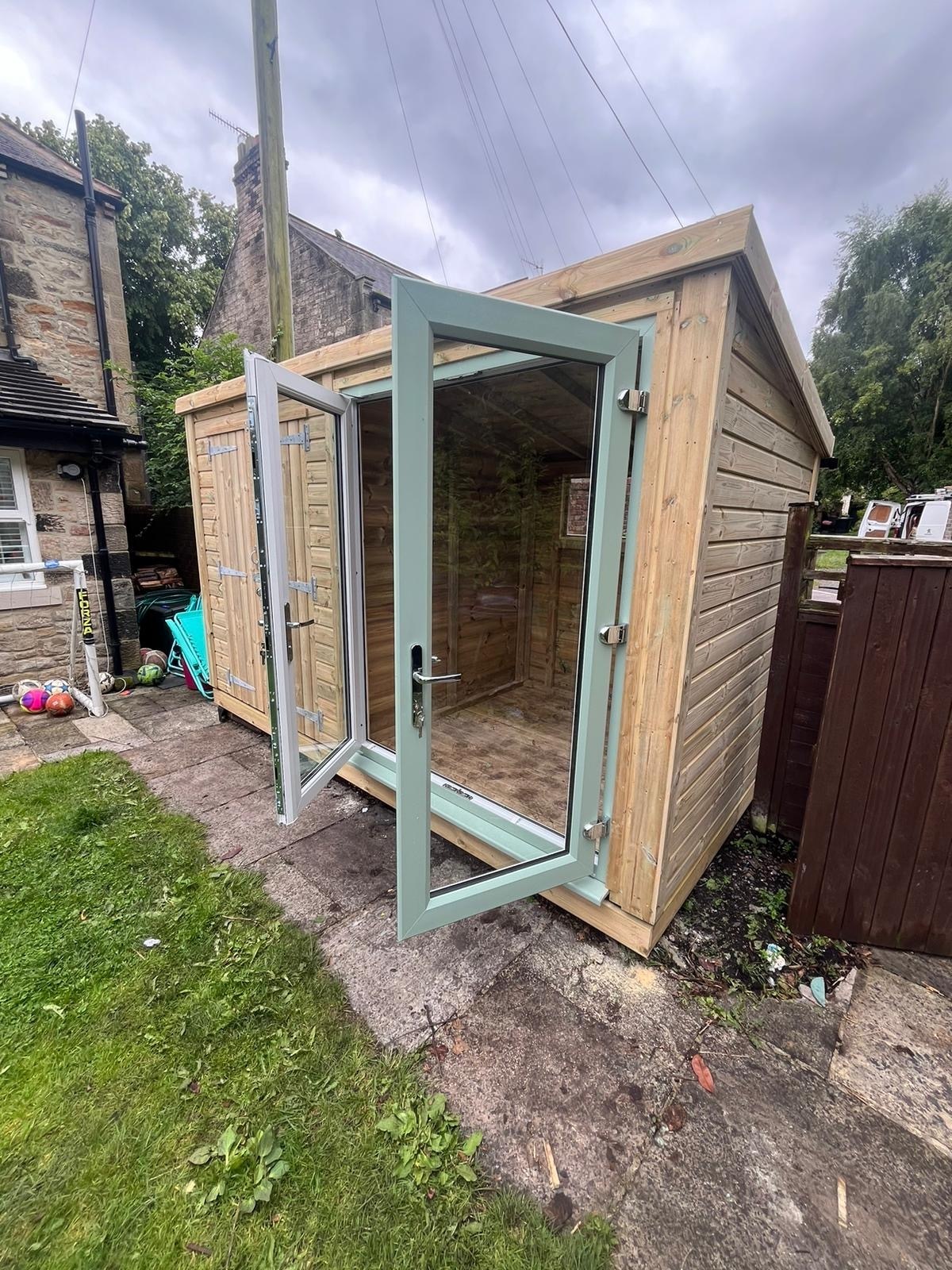 The summerhouse has a 1980 x 1600 wide pvc double glazed door and a 4ft wide double wooden door with a partition to make a separate shed area. The summer house has x1 long window (non pvc) placed horizontally in the back panel.