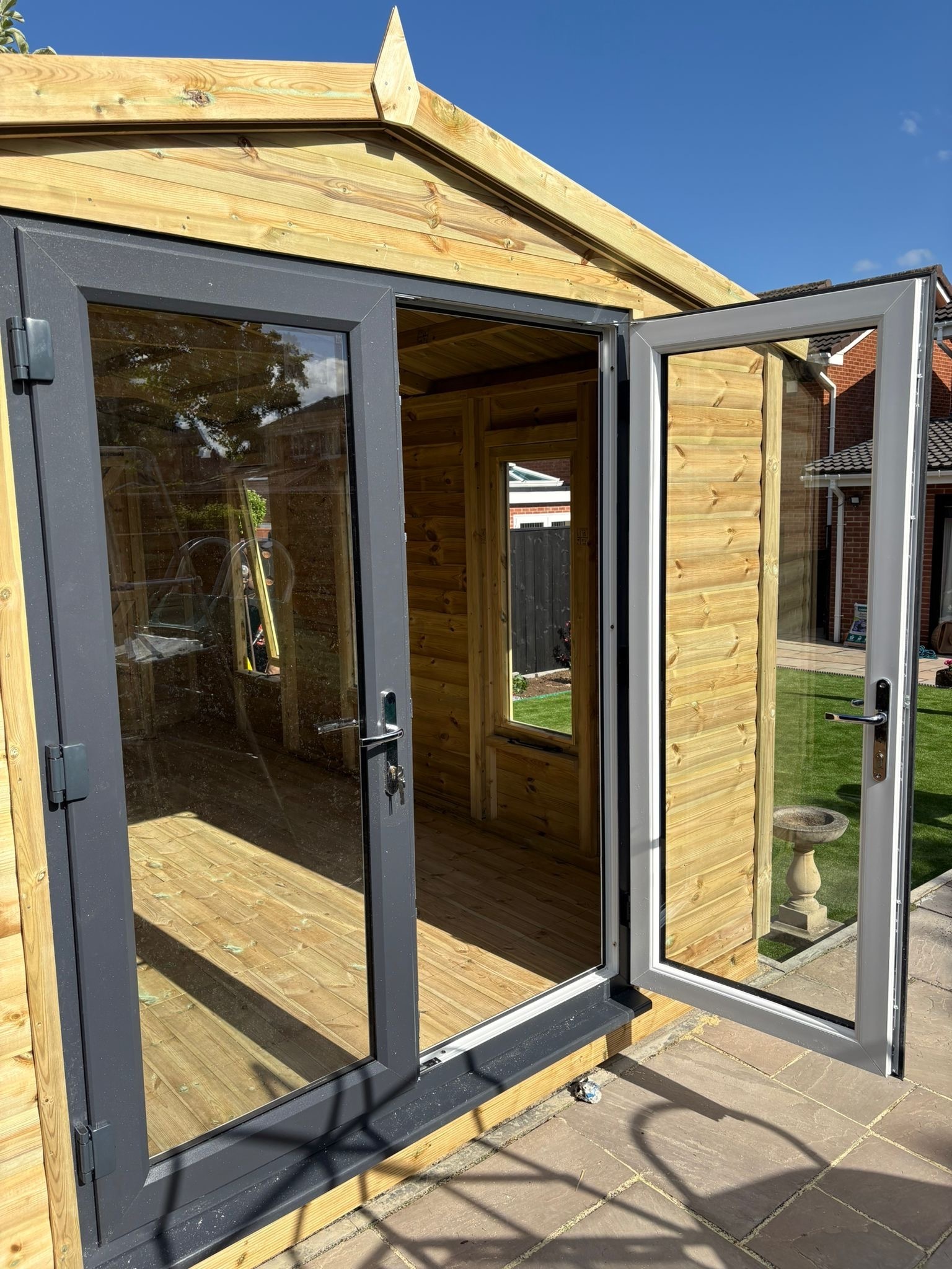 The summerhouse has a 1980 high x 1600 wide pvc double glazed door.