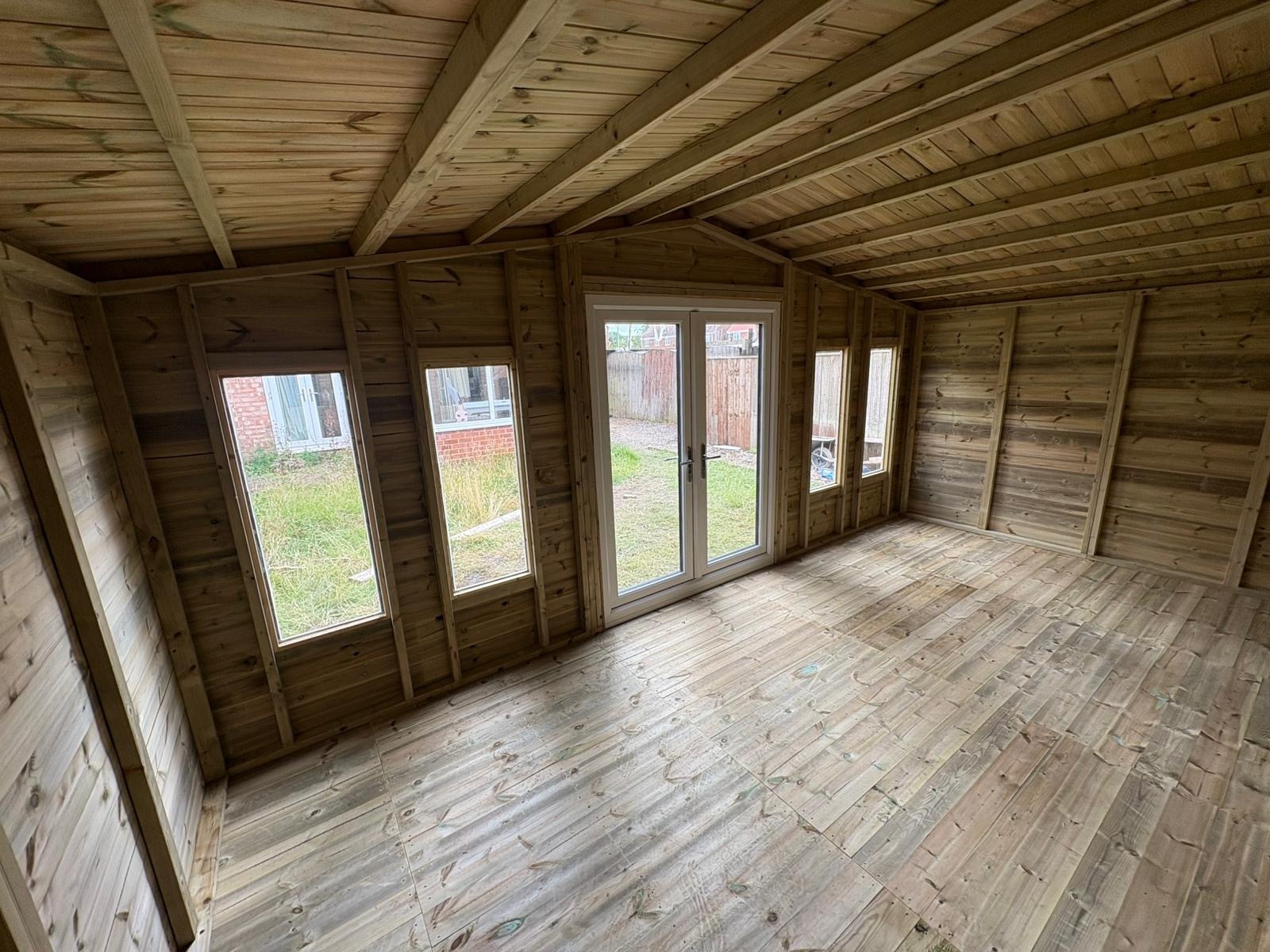 The summerhouse is 18ft wide at the front where the doors are and 10ft deep.