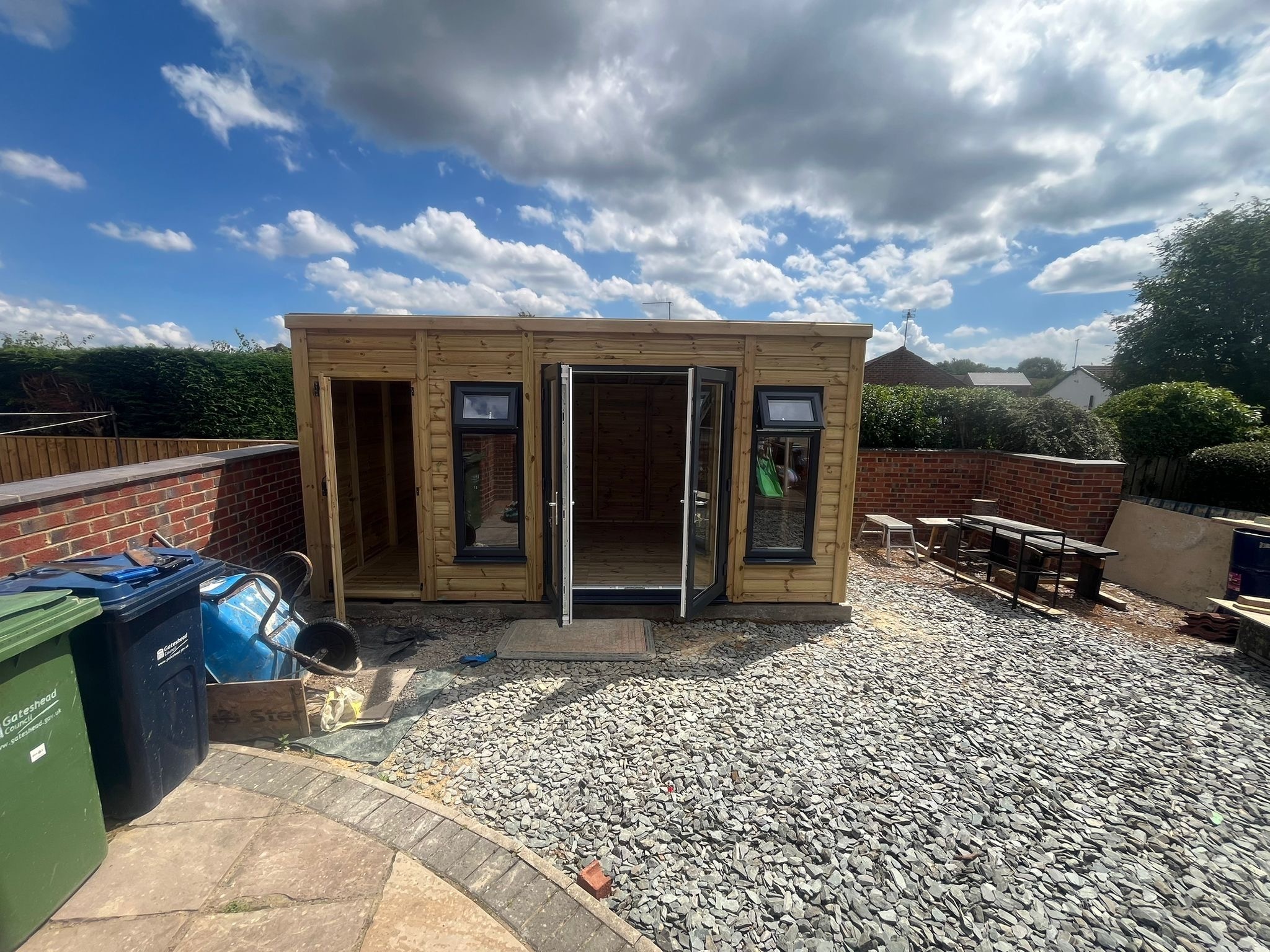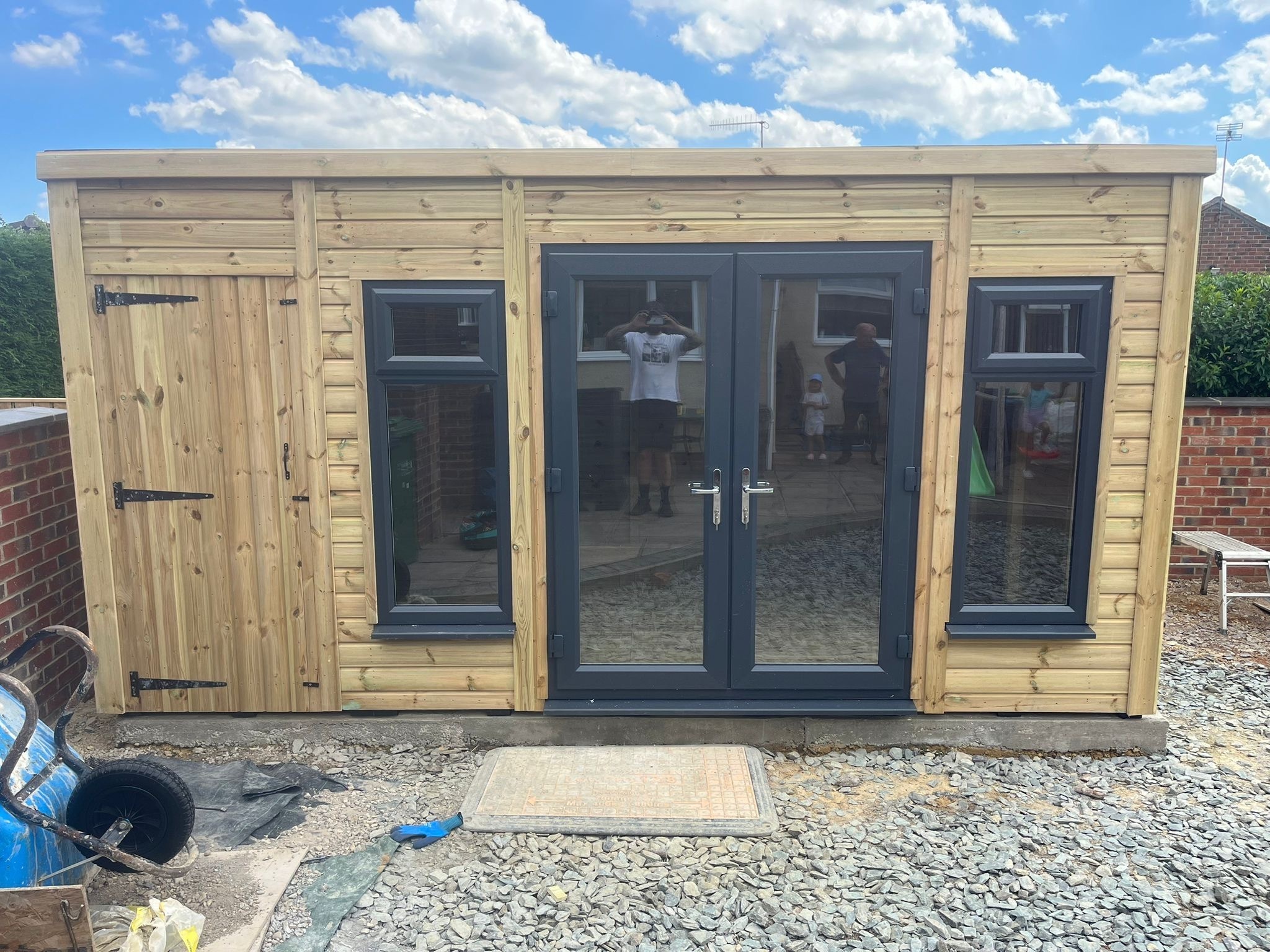 The summerhouse has a 1980 x 1600 wide pvc double glazed door and a solid 2ft 6" wide single wooden door with a partition to make a separate shed.