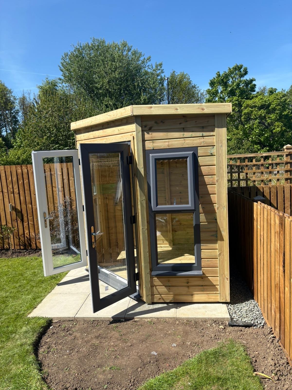 The summerhouse has a 1980 high x 1410 wide pvc double patio door and x2 600 x 1500 pvc double glazed opening windows in colour slate.