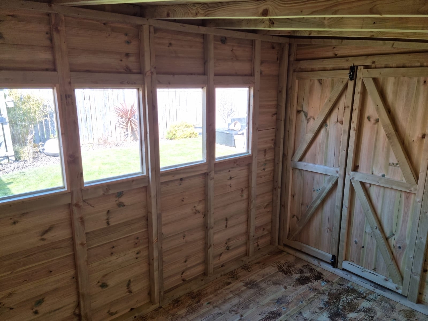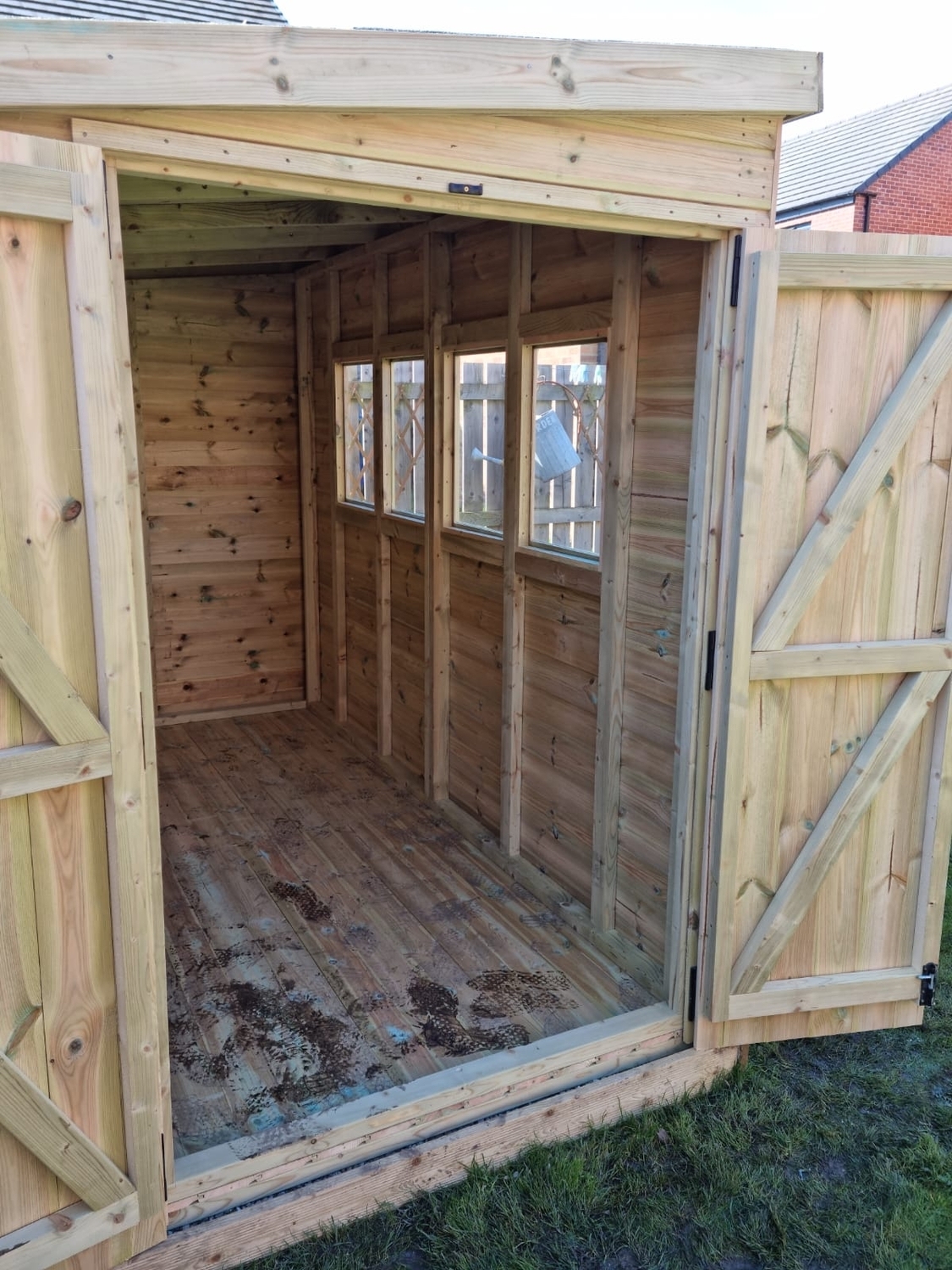 The shed has a 4ft wide 6ft high double door and 4 windows.