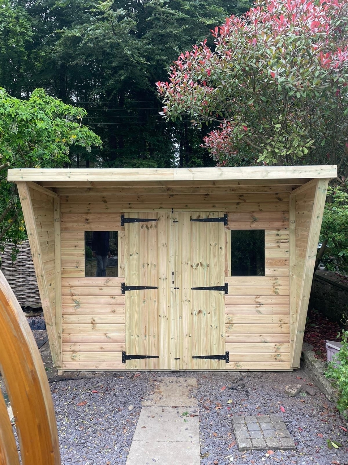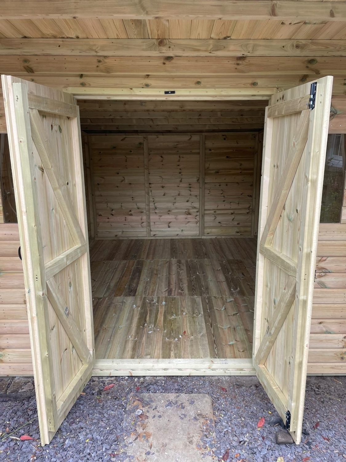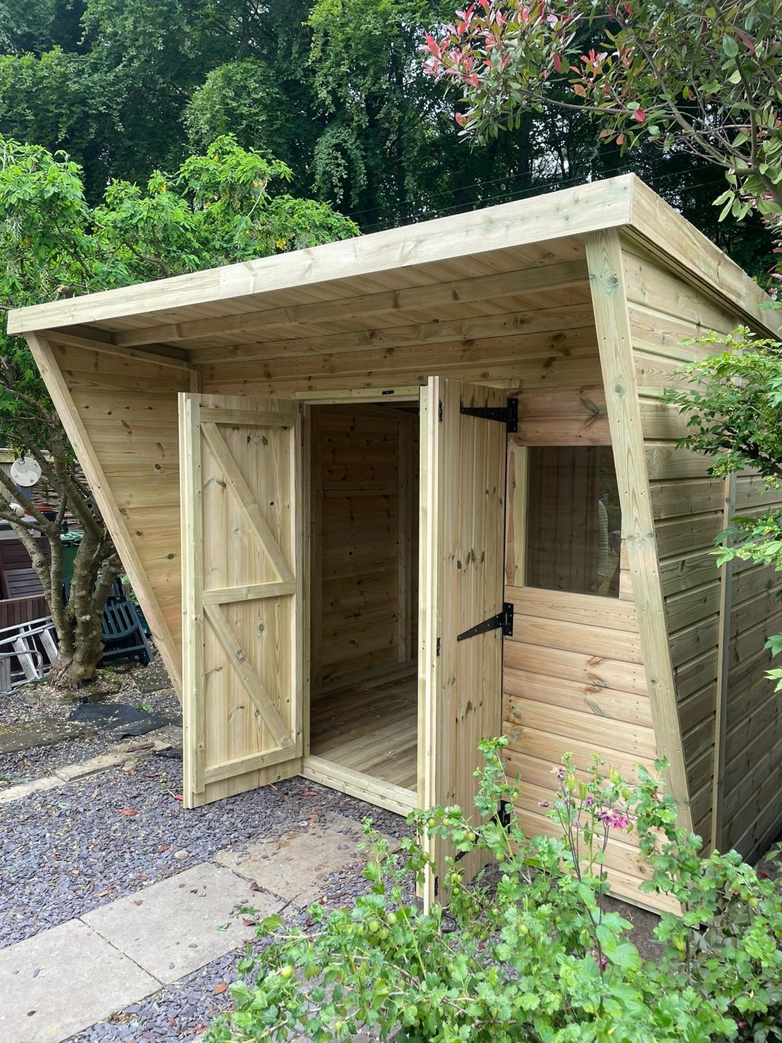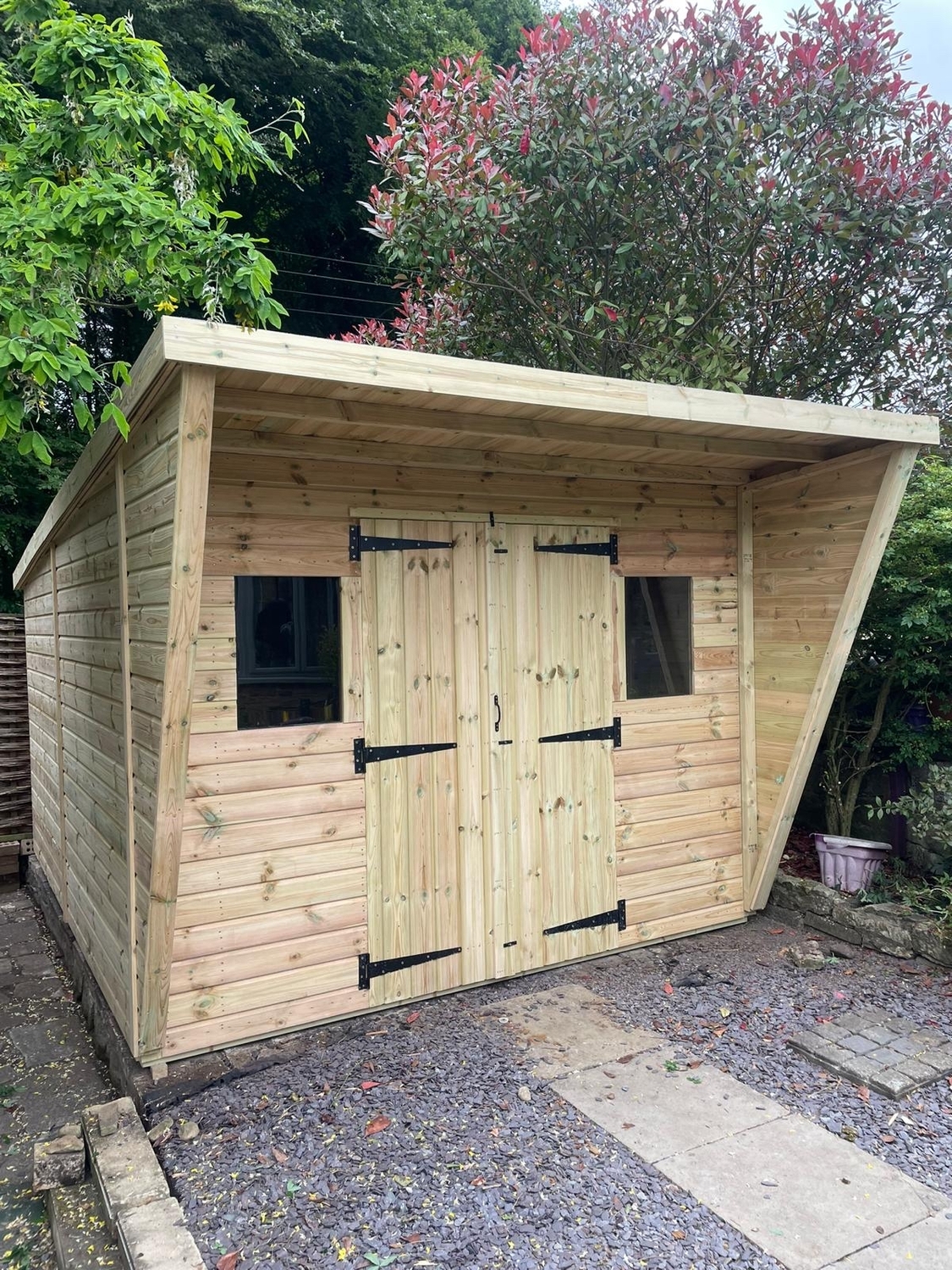 12x10 pent reverse roofed shed in our tanalised 19mm T&G, giving standard protection for 15 to 20 years without you having to treat it yourself.