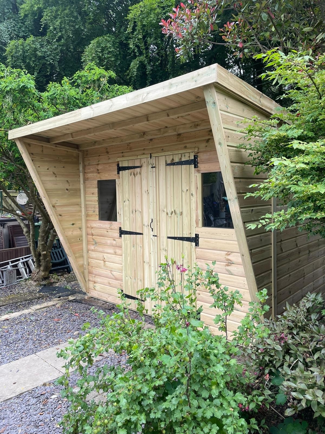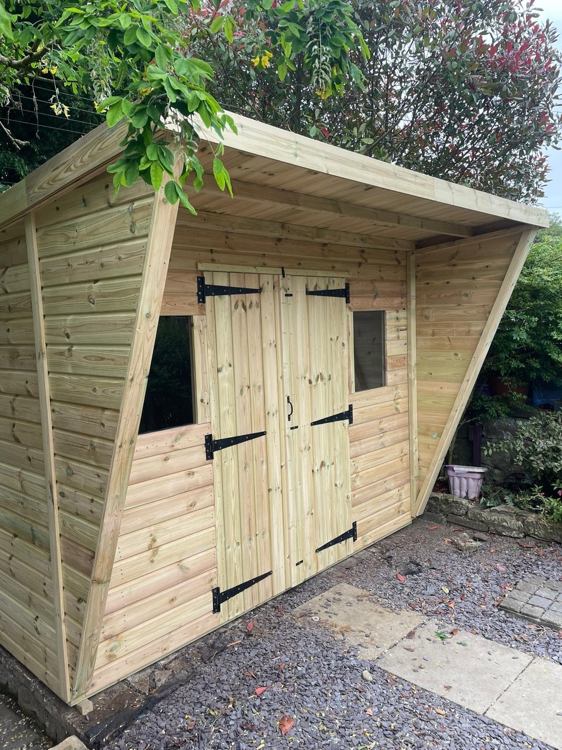 The shed has a 2ft canopy making the roof 14ft & tapered sides