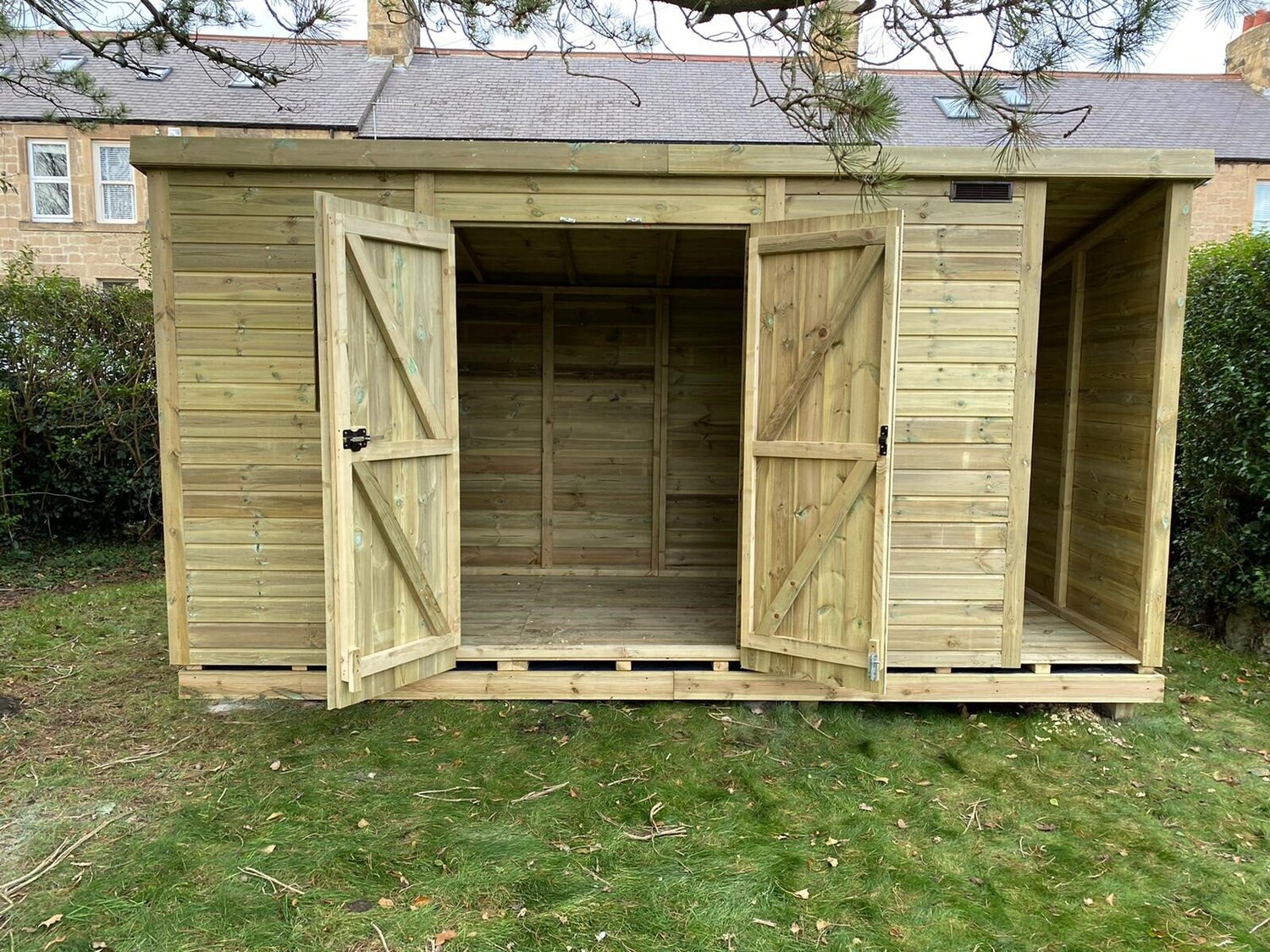 The shed is 12ft wide inside with a 2ft log store area making it total 14ft wide and 6ft deep.