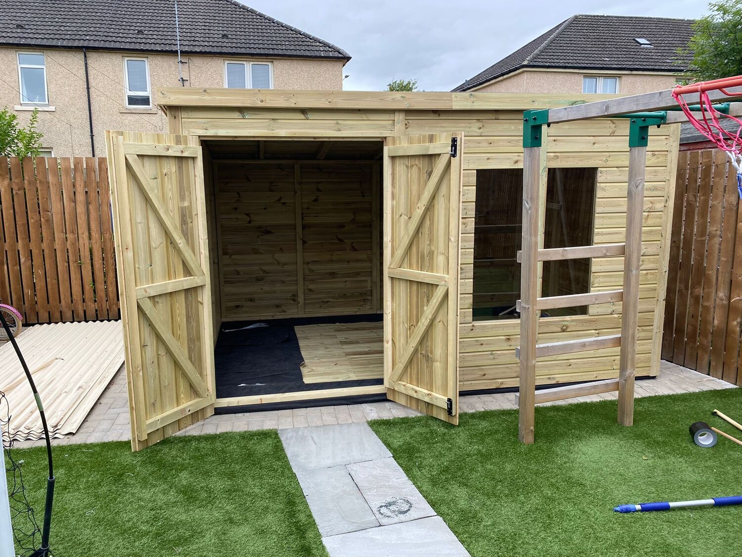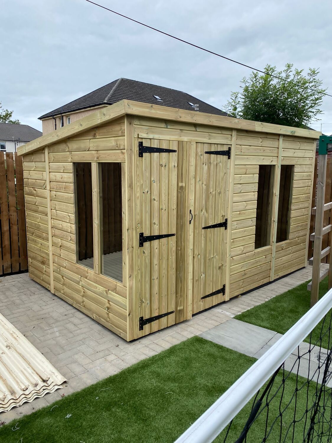 The shed has a4ft wide 6ft high double door and 4 long windows.