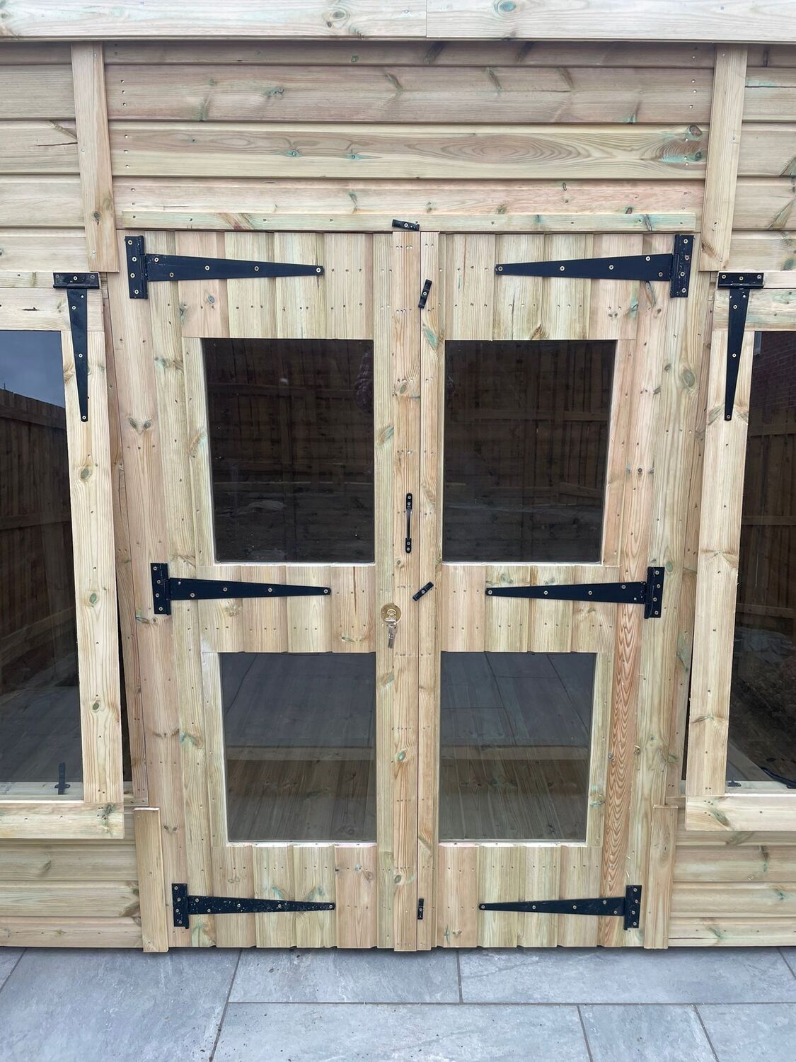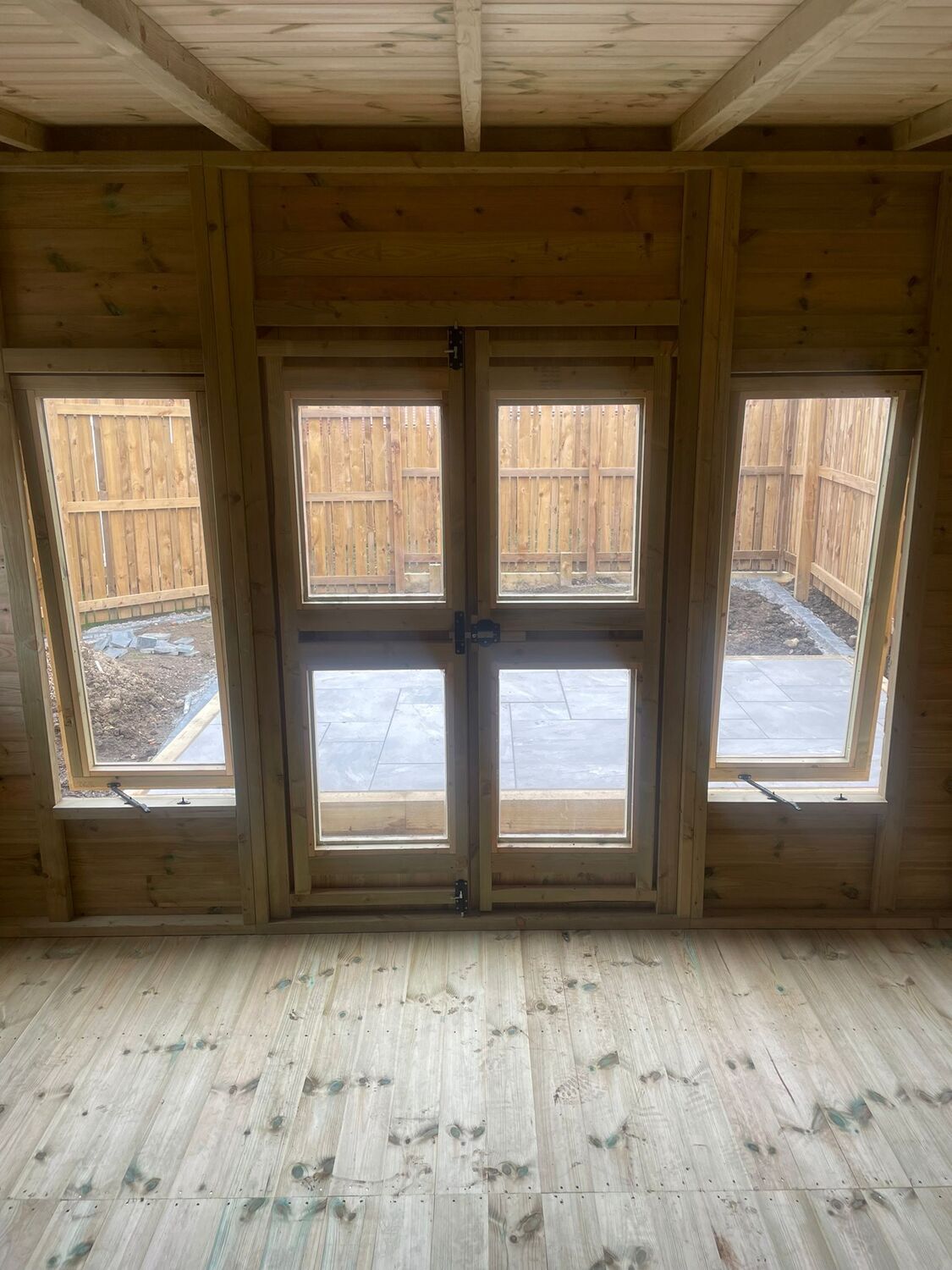 The summerhouse has 4ft wide 6ft high double door, 2 long opening windows and 5 standard windows.