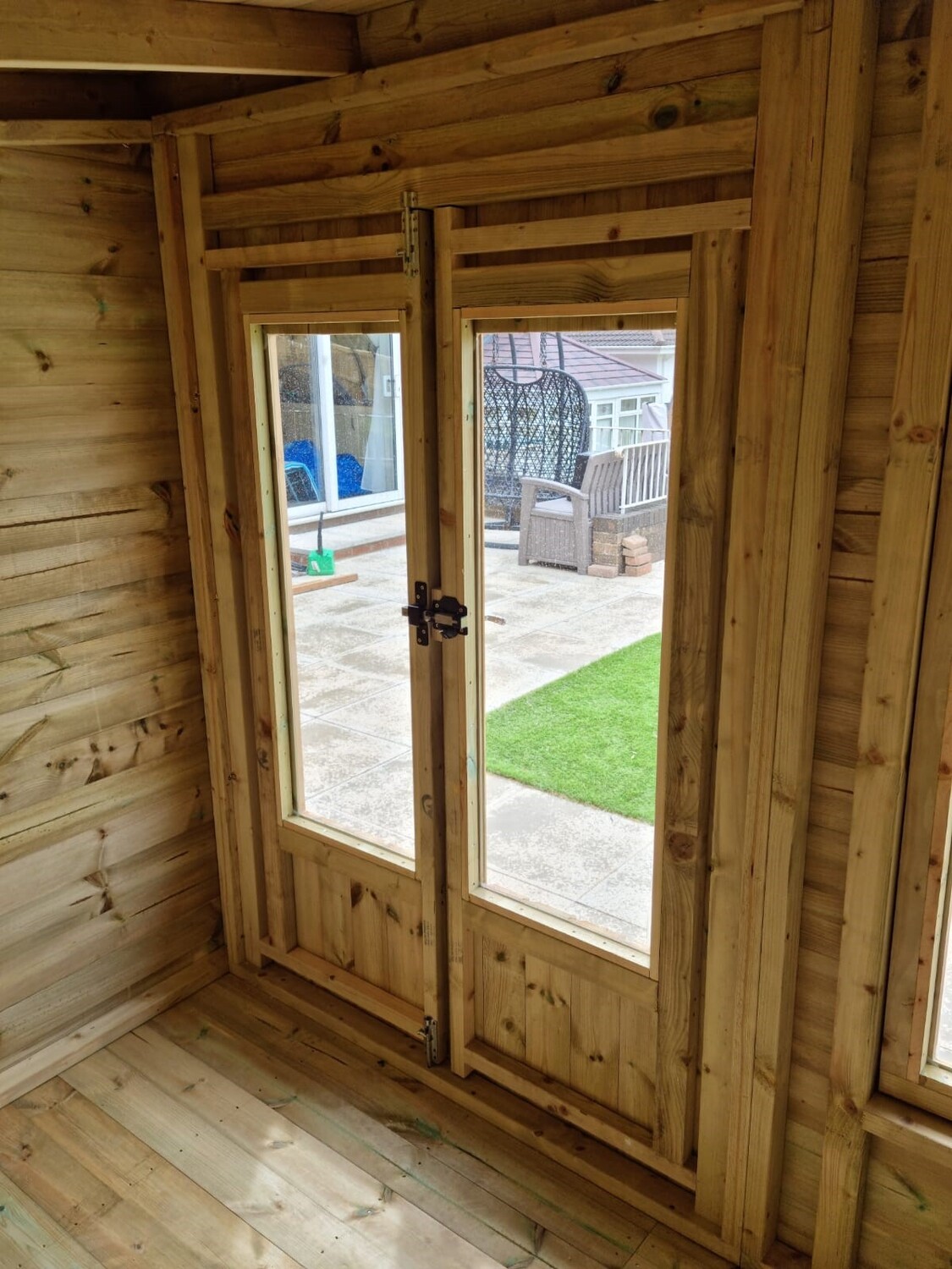 The summerhouse has 4ft wide 6ft high double door and 5 long windows, 3 of which are opening.