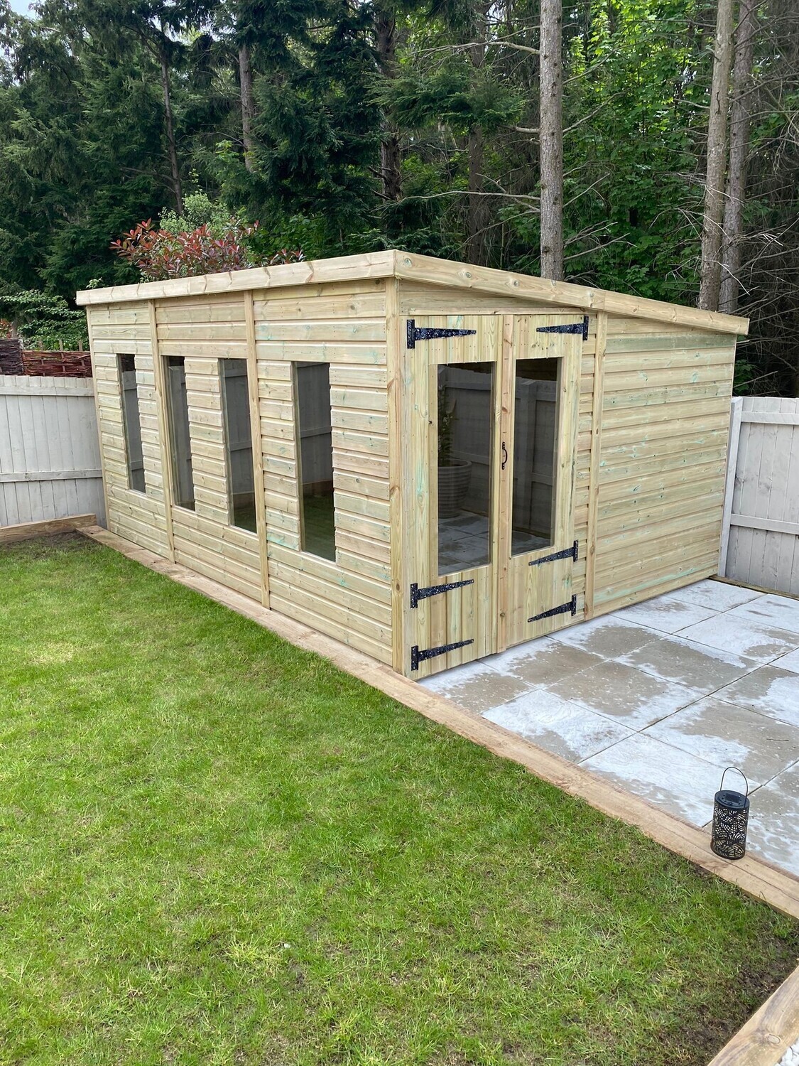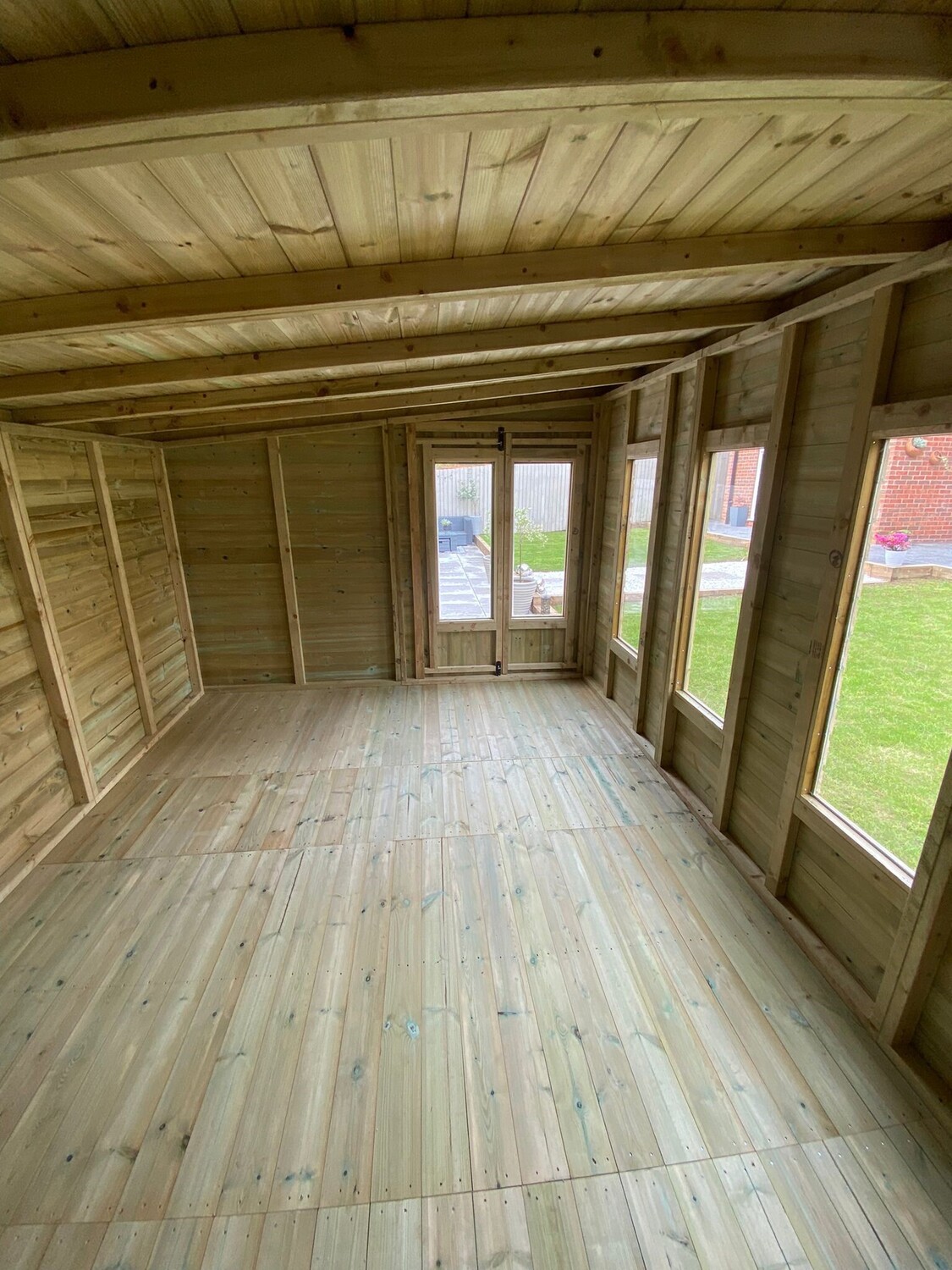 The summerhouse has 4ft wide 6ft high double door and 6 long windows.