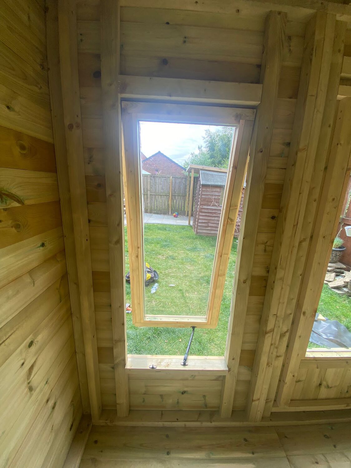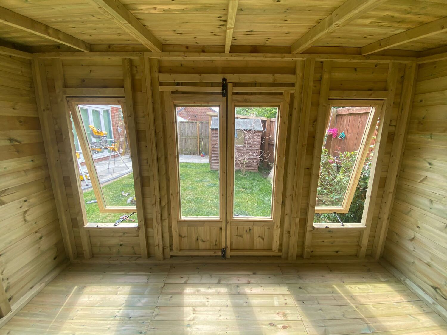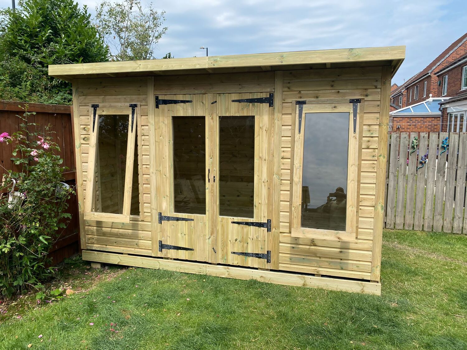 The summerhouse has 4ft wide 6ft high double door, 4 standard windows & 4 long windows, 2 of which are opening.