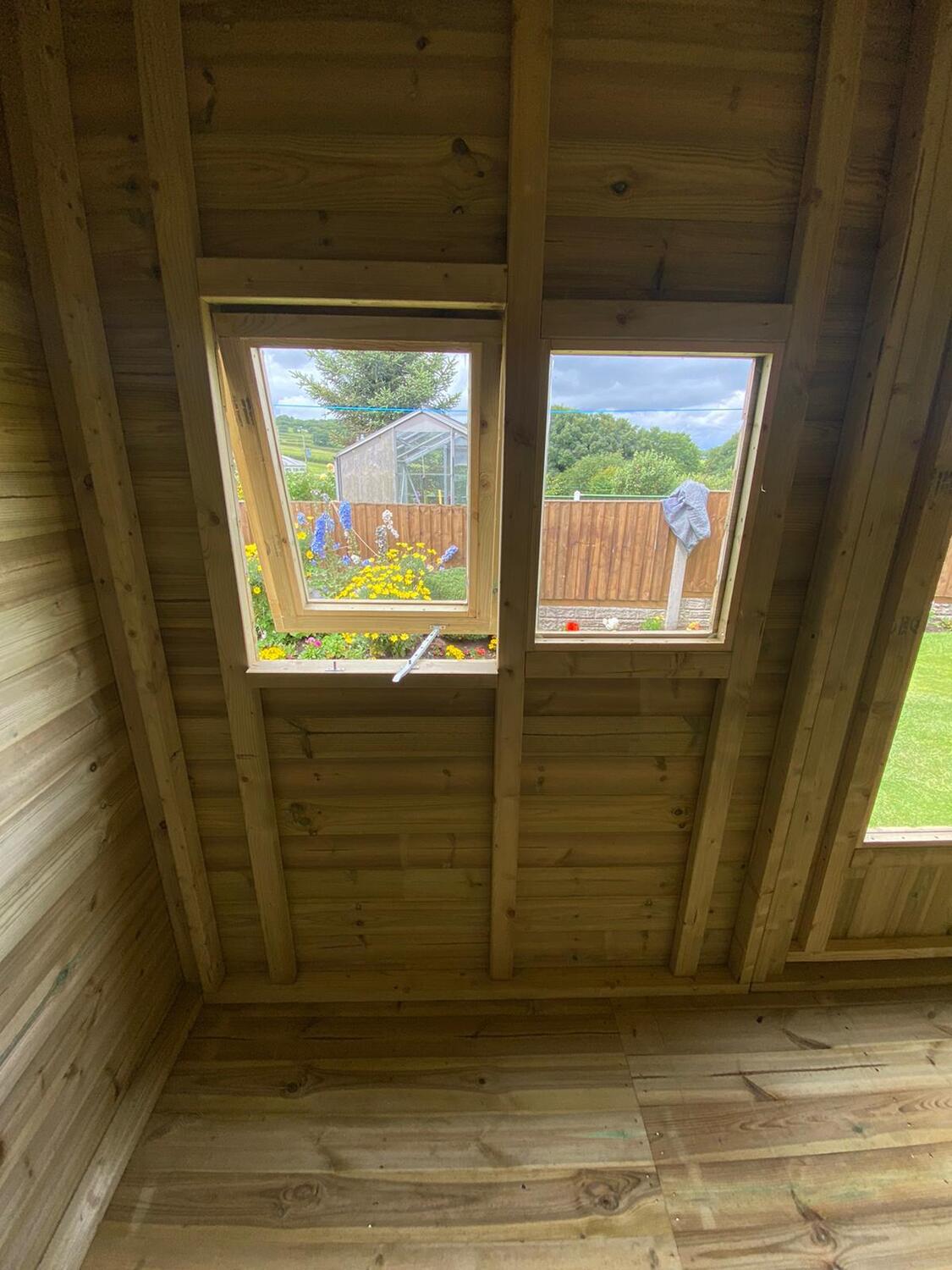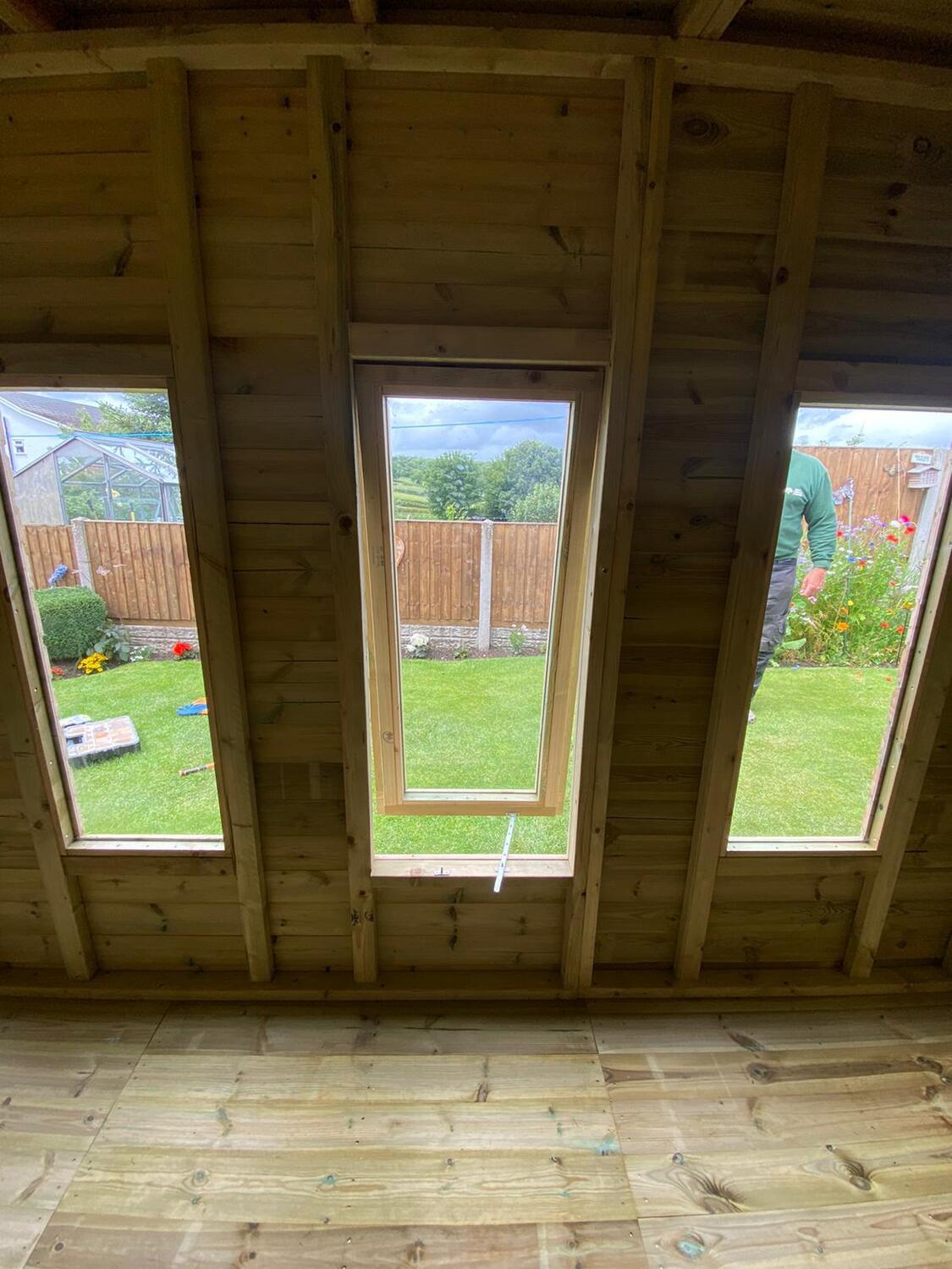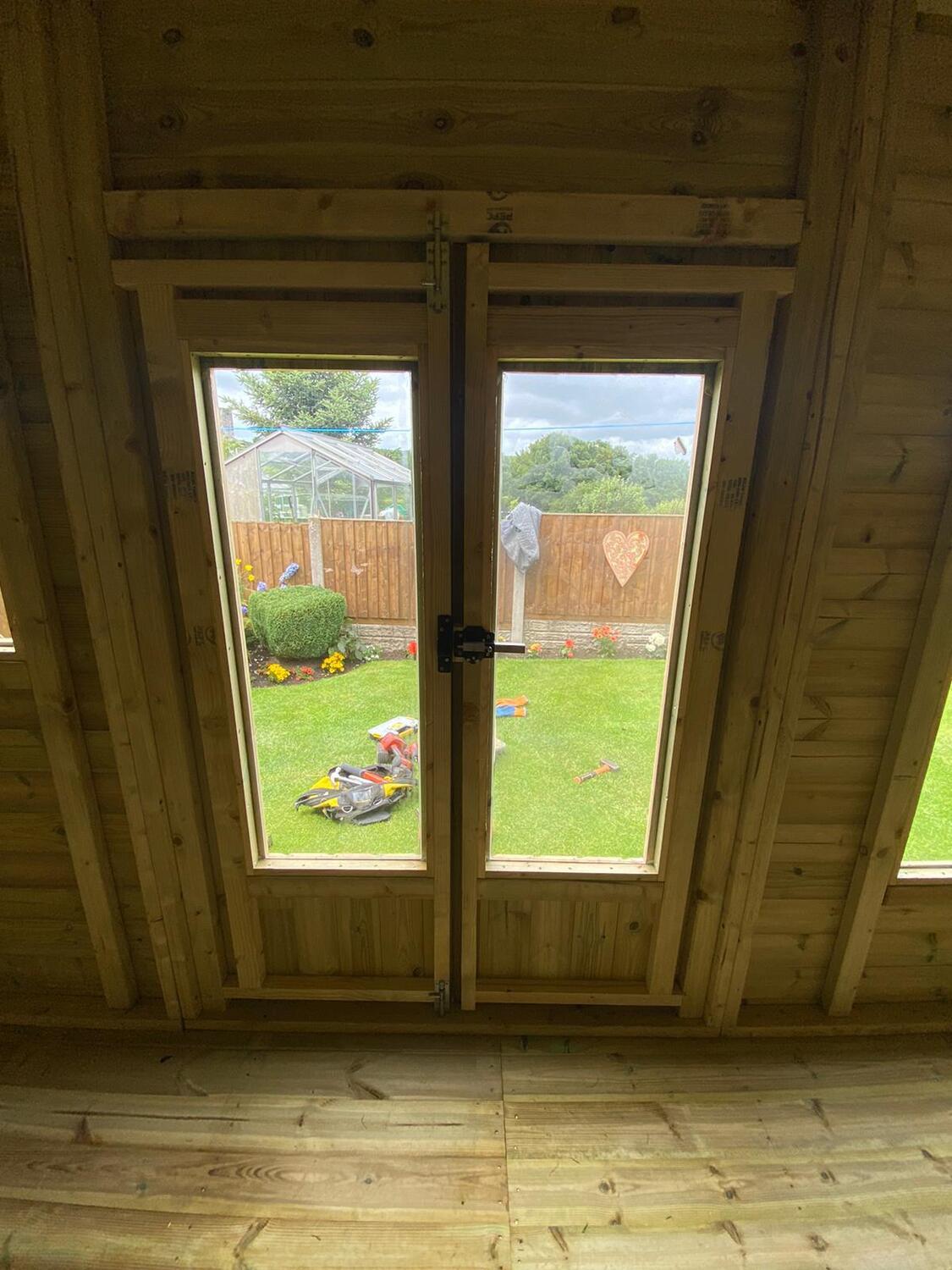 The summerhouse has 4ft wide 6ft high double door, 3 long windows and 2 standard windows. 2 of the windows are opening.
