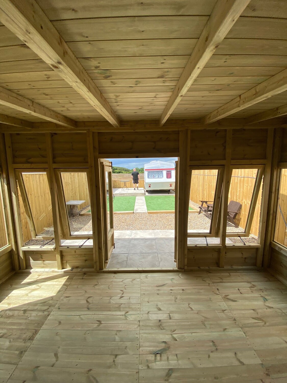 The summerhouse is 14ft wide at the front where the doors and 10ft deep.