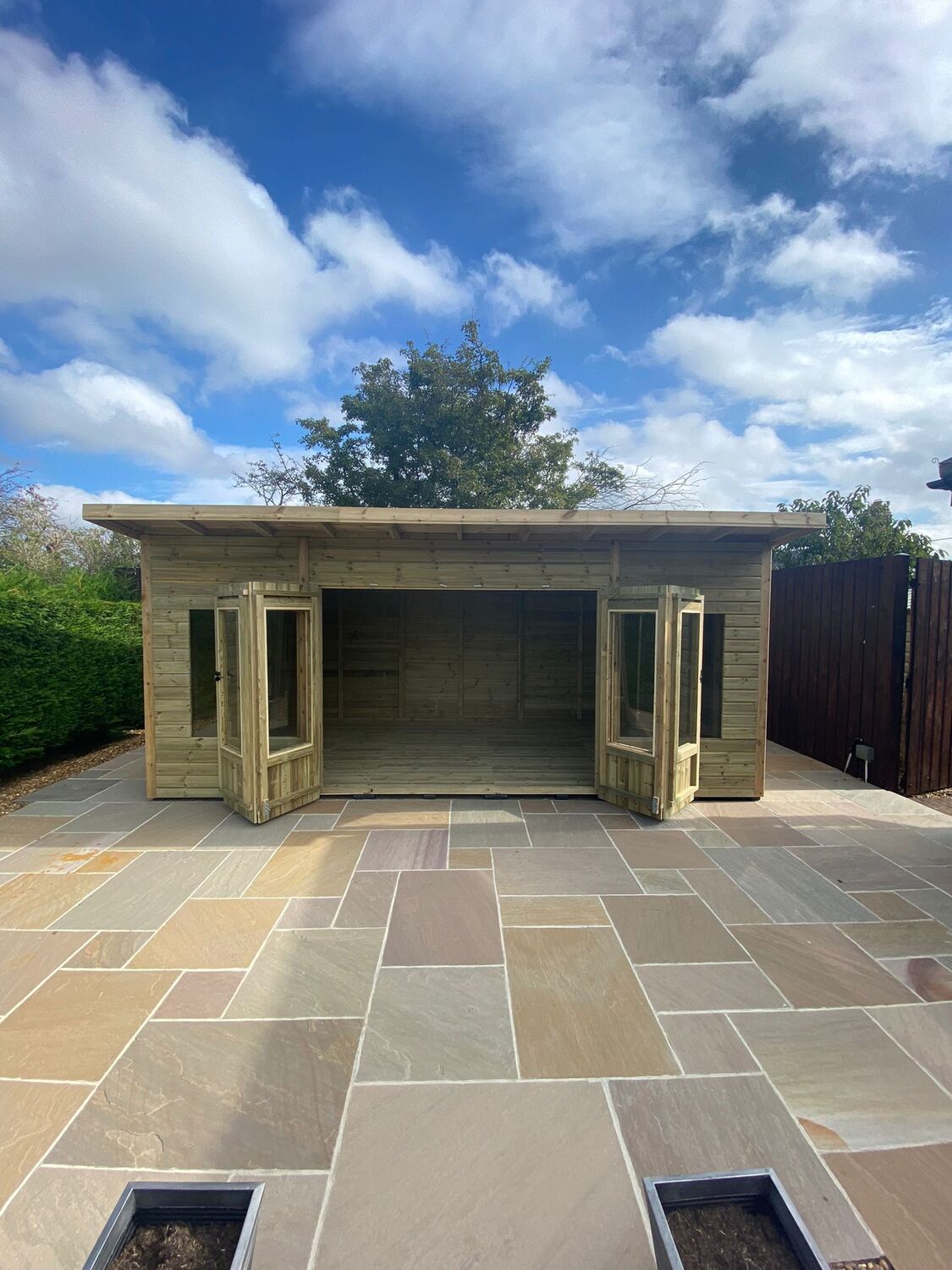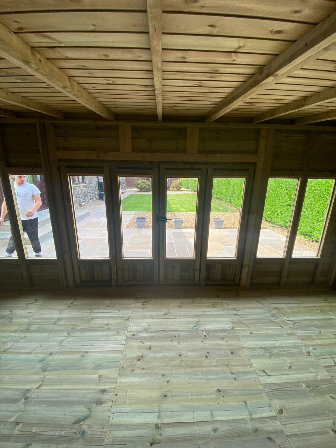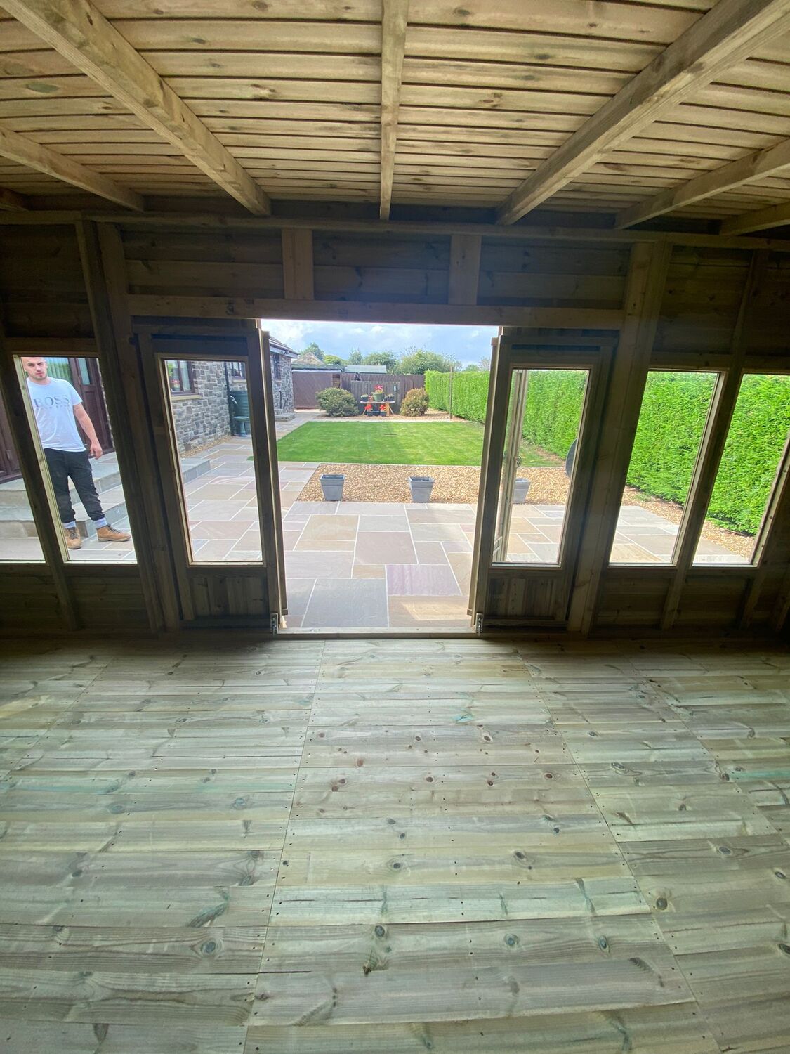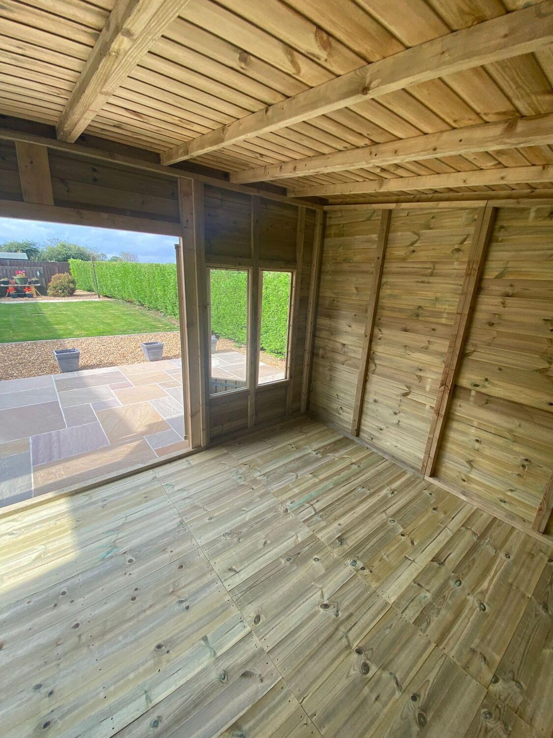 The summerhouse has 8ft wide 6ft high bifold doors, a 2ft 6" wide 6ft high single door and 8 long windows.