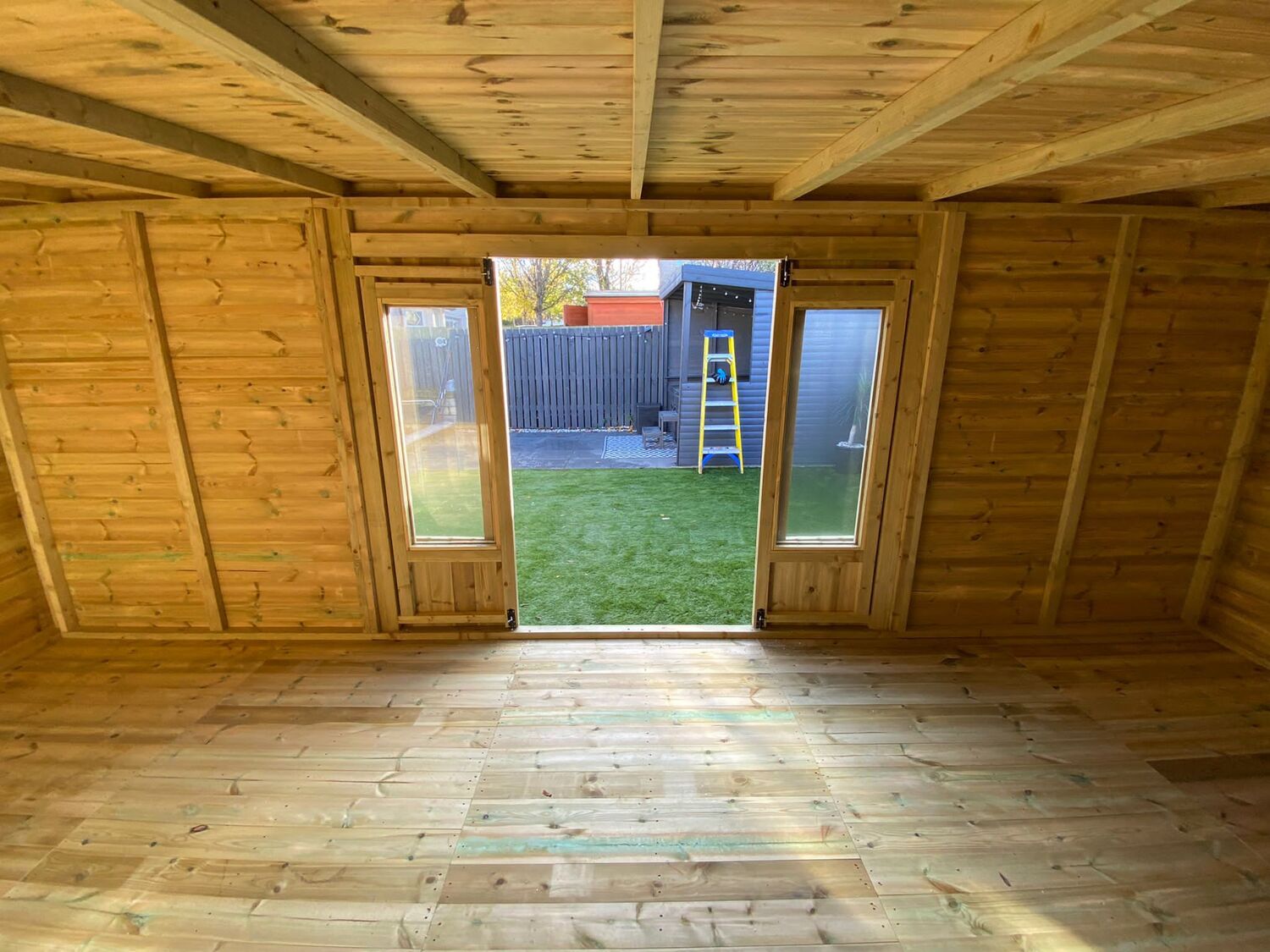 The summerhouse has 8ft wide bi-folding doors and 4 long windows.